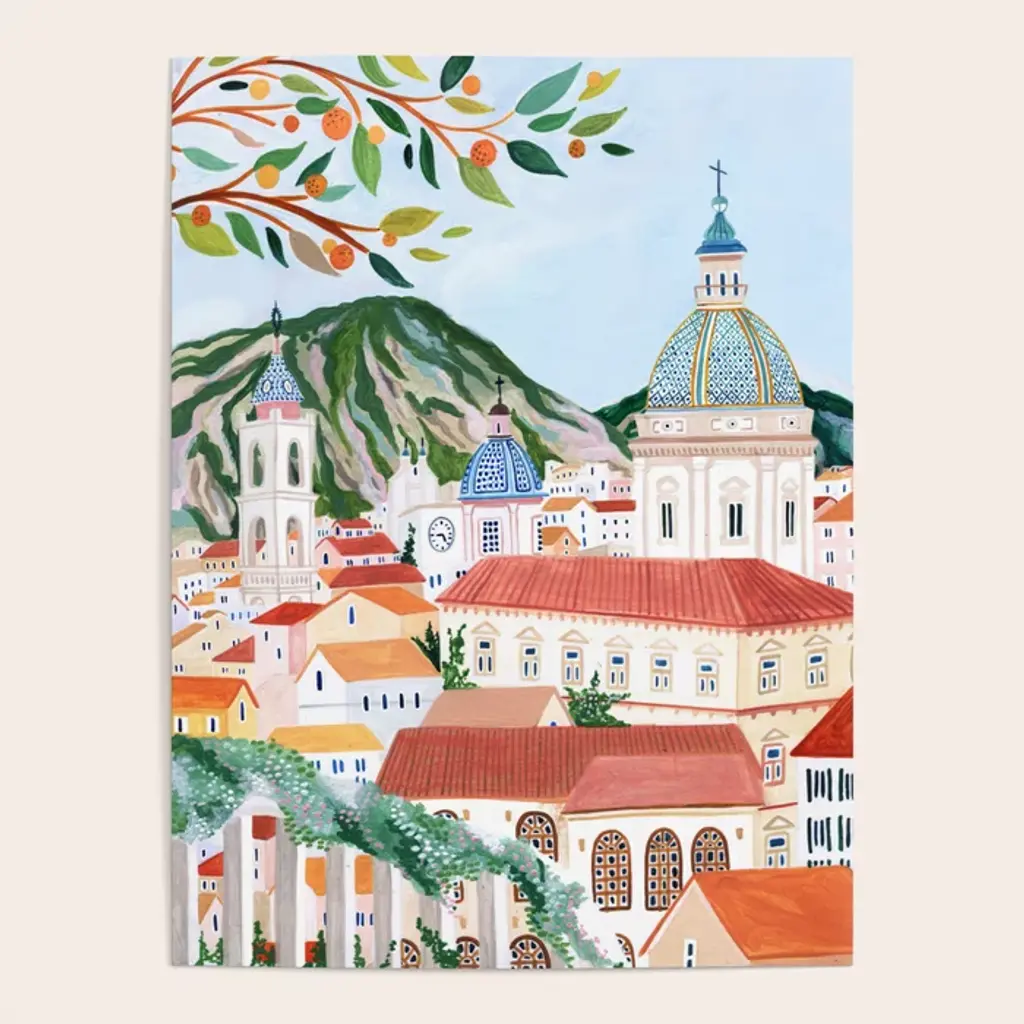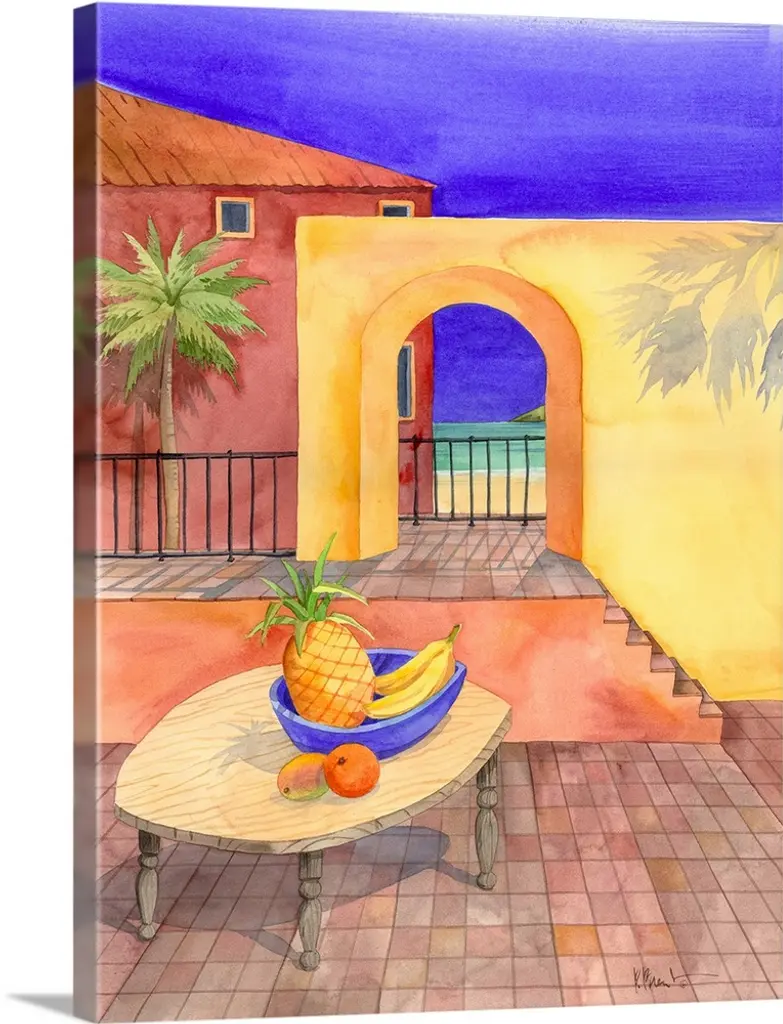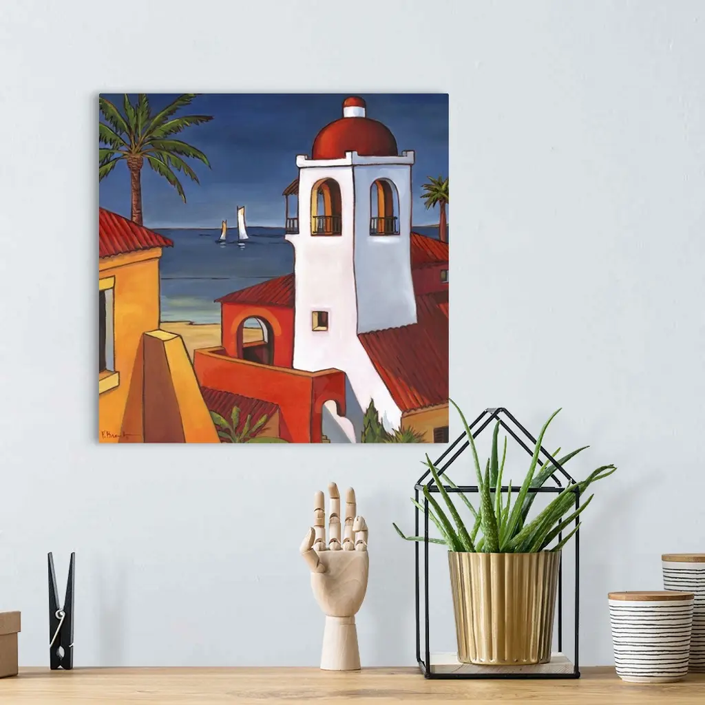 Painting of adobe buildings and palm trees in Antigua, looking out to the sea.