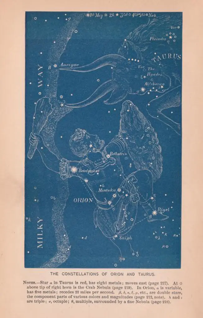 Constellations of Orion and Taurus. Printed from antique astronomy book plate. Printed 18 x 10" on heavyweight enhanced matte paper. Edition of 100. #1/100. Please allow two week for delivery due to printing to order.