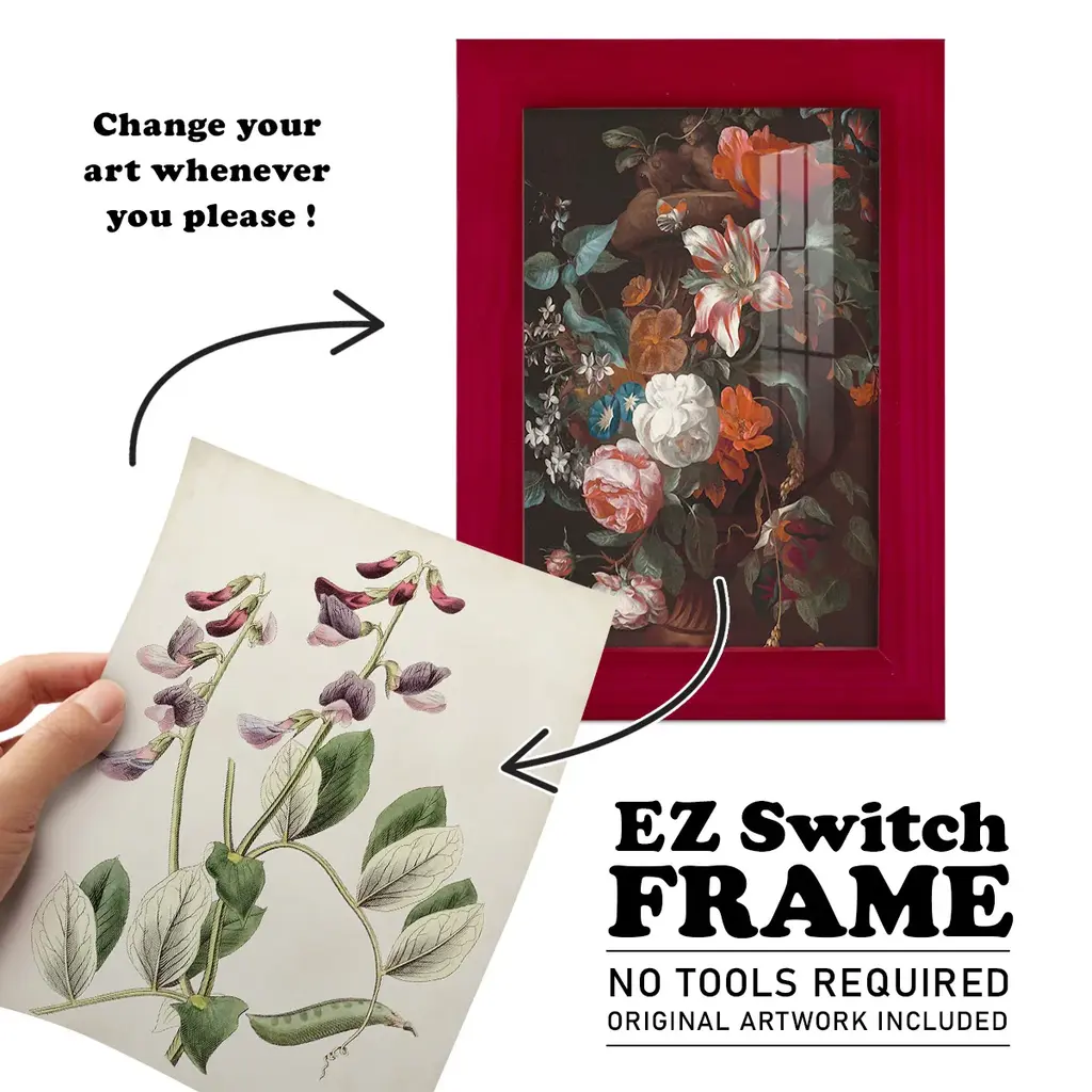 Antique Botanical Collection I -EZ SWITCH Framed Print w/glass-Cherry Red A delightful, framed print. Featuring a solid wood frame with real wood glass. This premium print is giclee quality. In addition, every frame features a removable back and table top stand. This allows you to change your art in the future or to just stand the art on a table for a new look. We are sure you'll enjoy our new series of EZ SWITCH Framed Art. Solid Wood Frame Real Glass Removable / Replaceable Art Built in Tabletop Stand Sizes range from 4x6 up to 12x15 - buy just one or pair them up as sets as you see fit.