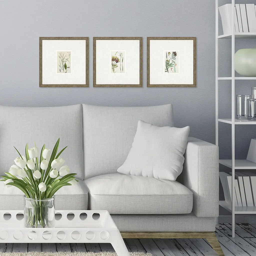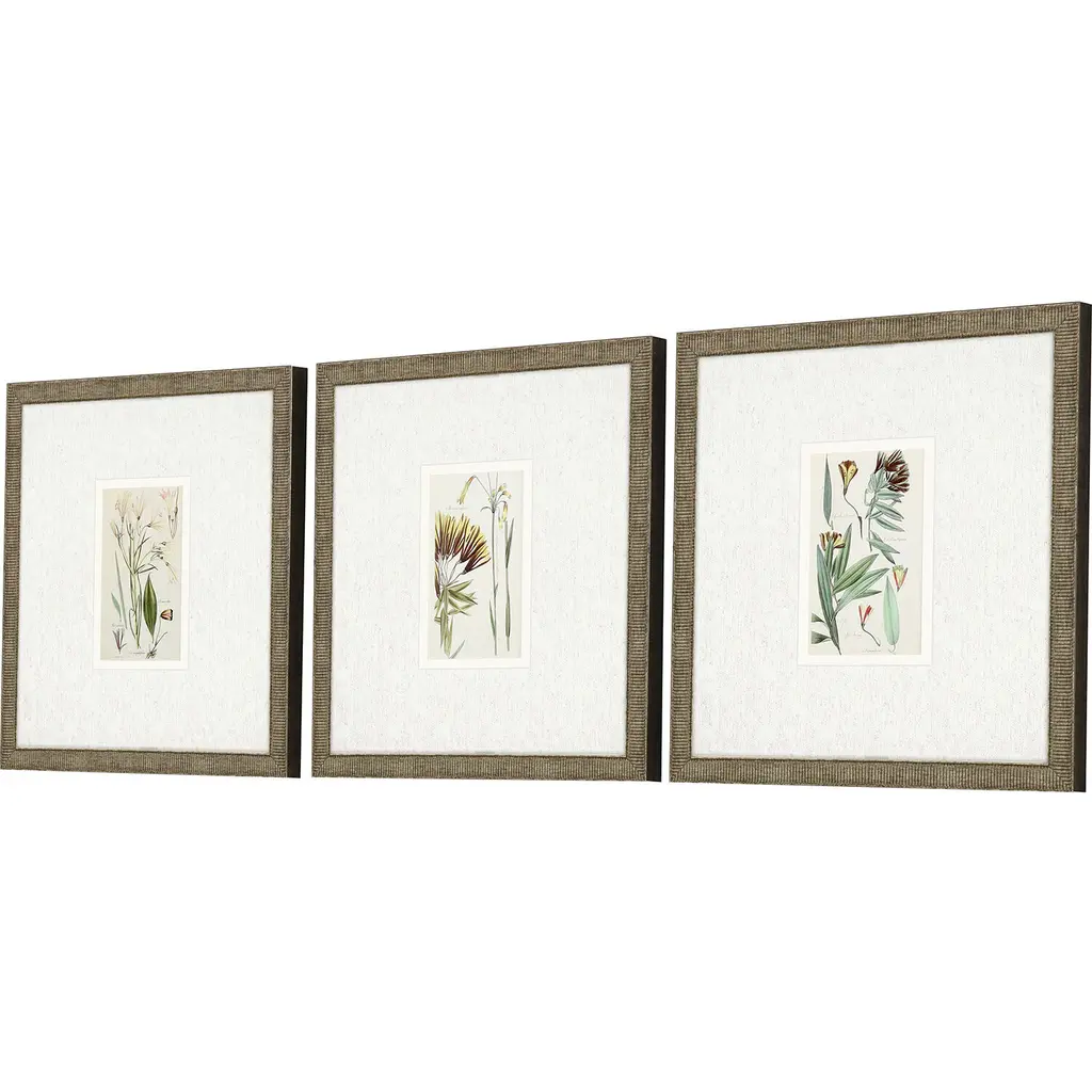 Elegant antique botanical sketches feature premium matting. Framed in a ribbed distressed antique gold finish moulding.