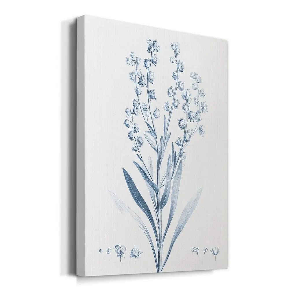 Antique Botanical in Blue I Premium Gallery Wrapped Canvas - Ready to Hang A premium hand stretched gallery wrapped canvas print created to last. Featuring a beveled a solid wood stretcher bar, each piece comes ready to hand 5 SIZES AVAILABLE 8''X12'' - Overall Size 16'X20'' - Overall Size 24''x32'' - Overall Size 30''x40'' - Overall Size 36''x48'' - Overall Size Each piece is made to order. Built to Last Each piece comes ready to hang Solid wood stretcher Fade and Water resistant Made domestically