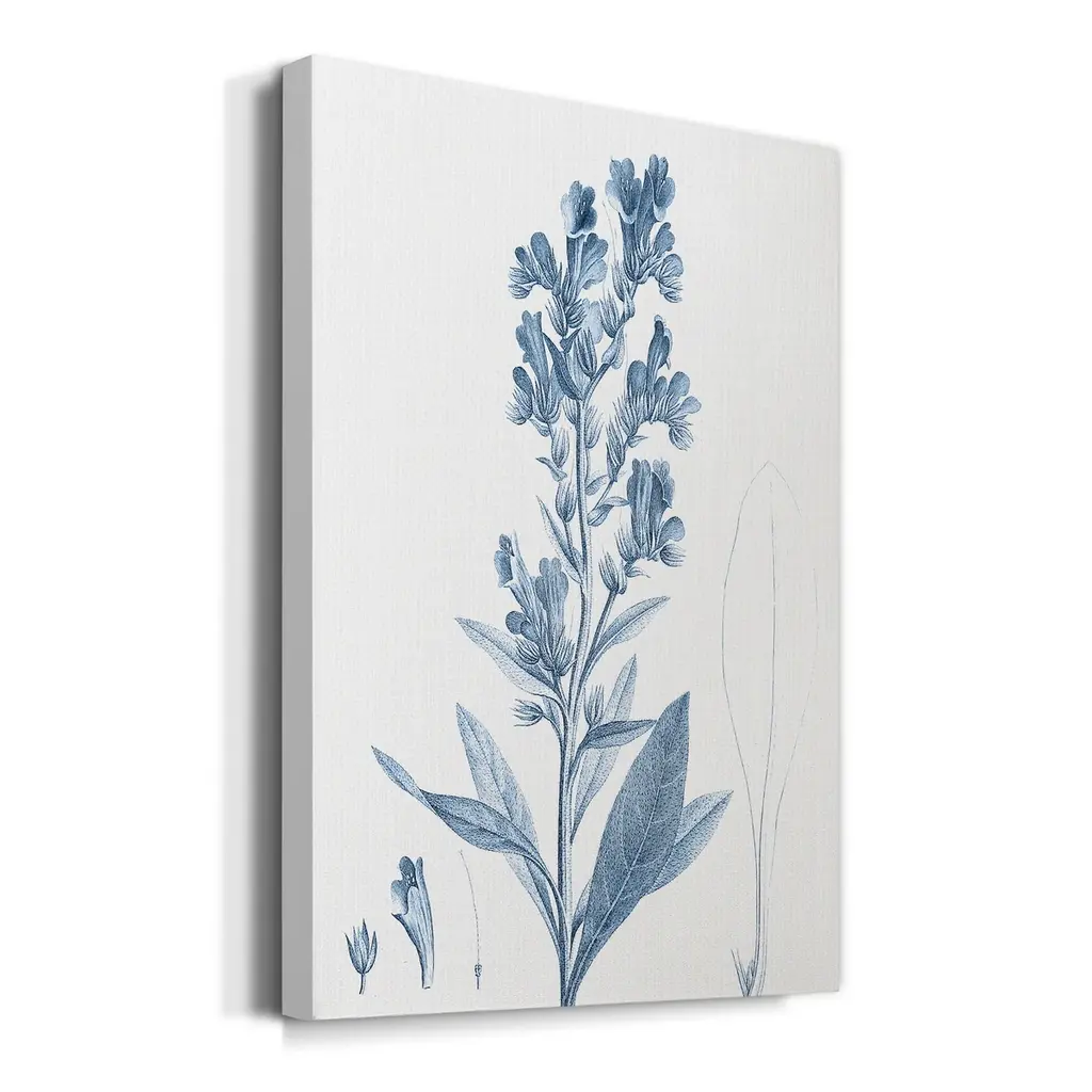Antique Botanical in Blue III Premium Gallery Wrapped Canvas - Ready to Hang A premium hand stretched gallery wrapped canvas print created to last. Featuring a beveled a solid wood stretcher bar, each piece comes ready to hand 5 SIZES AVAILABLE 8''X12'' - Overall Size 16'X20'' - Overall Size 24''x32'' - Overall Size 30''x40'' - Overall Size 36''x48'' - Overall Size Each piece is made to order. Built to Last Each piece comes ready to hang Solid wood stretcher Fade and Water resistant Made domestically