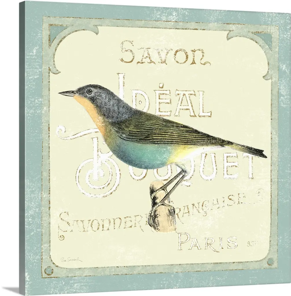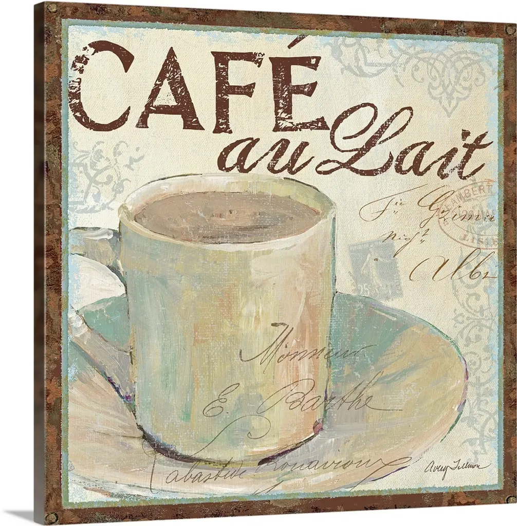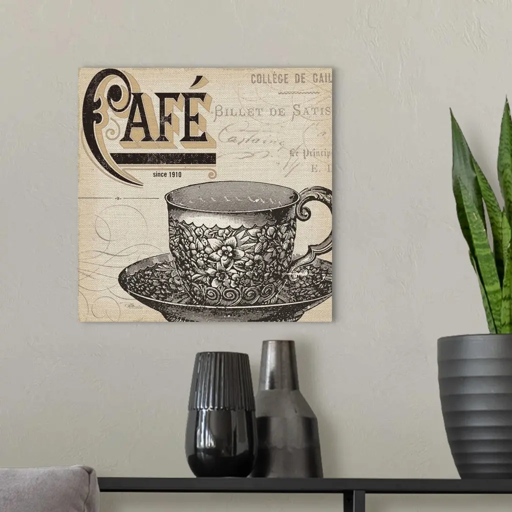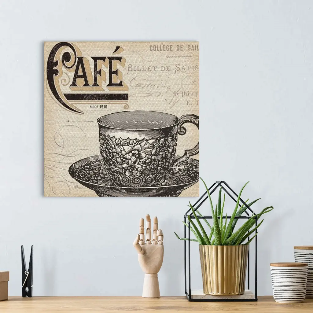 Contemporary artwork of a tee cup and saucer against a beige background of decorative text.