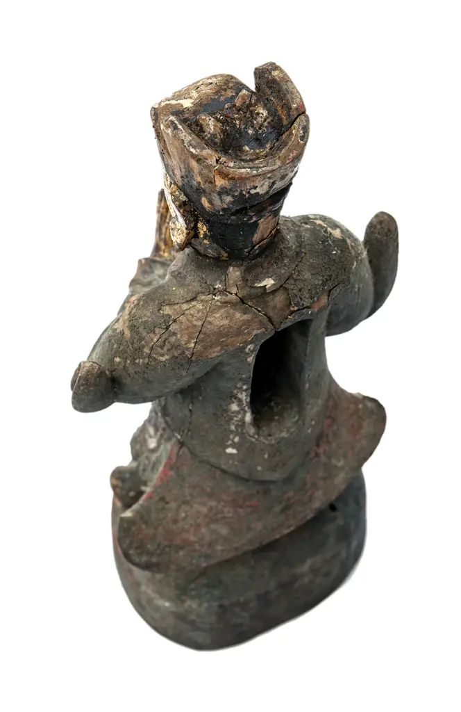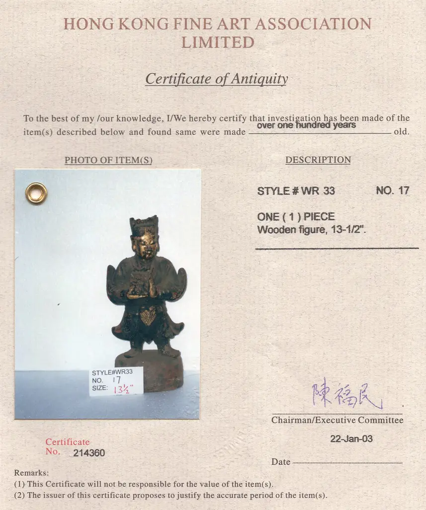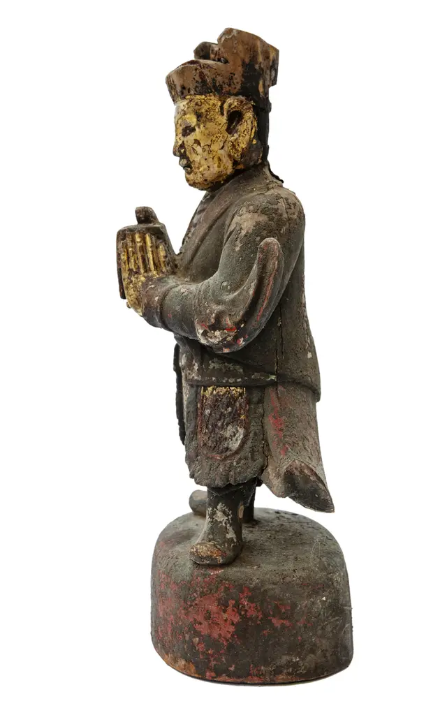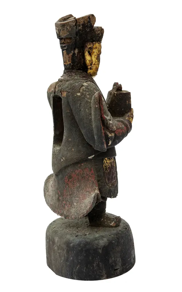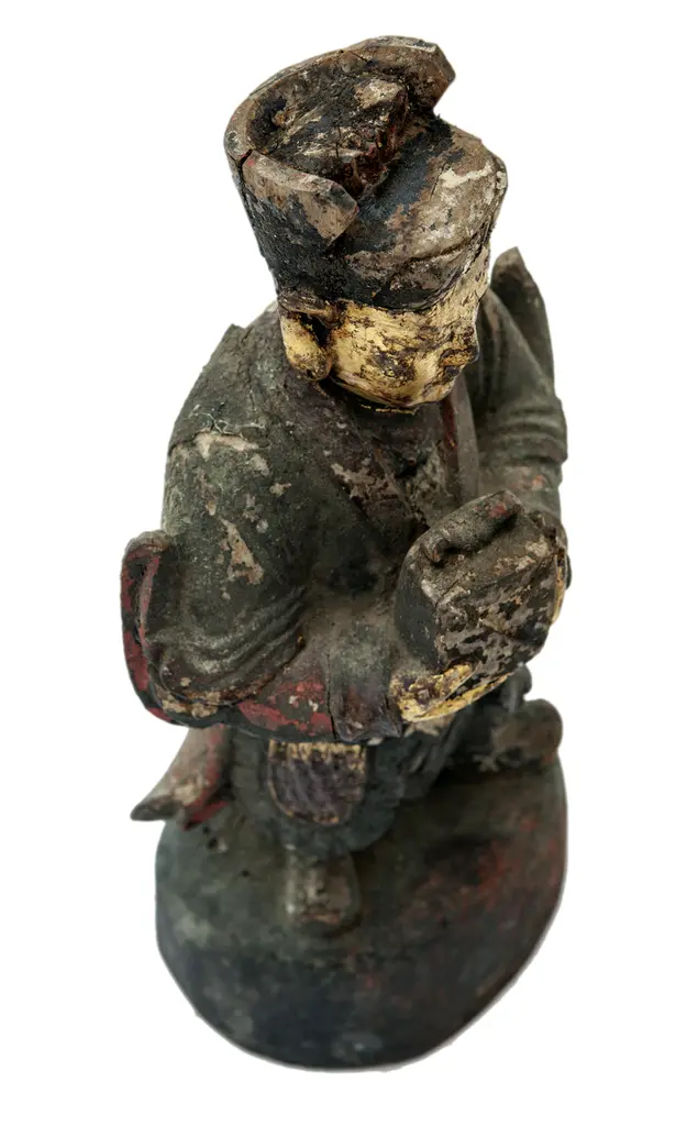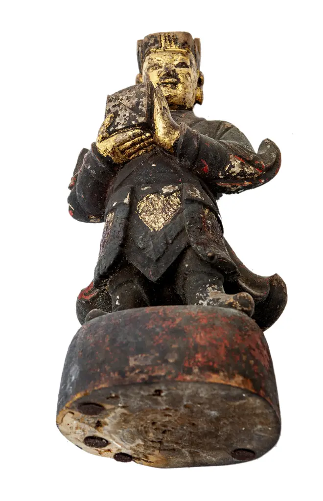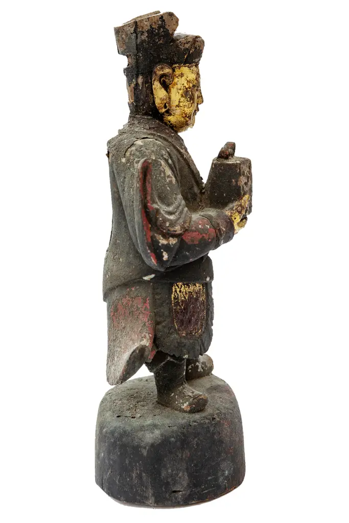 Ancient warrior represents the art of war and changing dynasties of China. Wearing full armor with carved details and gold leaf accents, he presents a gift box. One foot points outward in a classic pose as he stands atop a solid base.Red underpainting Certified by the Hong Kong Fine Art Association to be at least 120 years old. Purchased from Neiman Marcus. Certificate included.