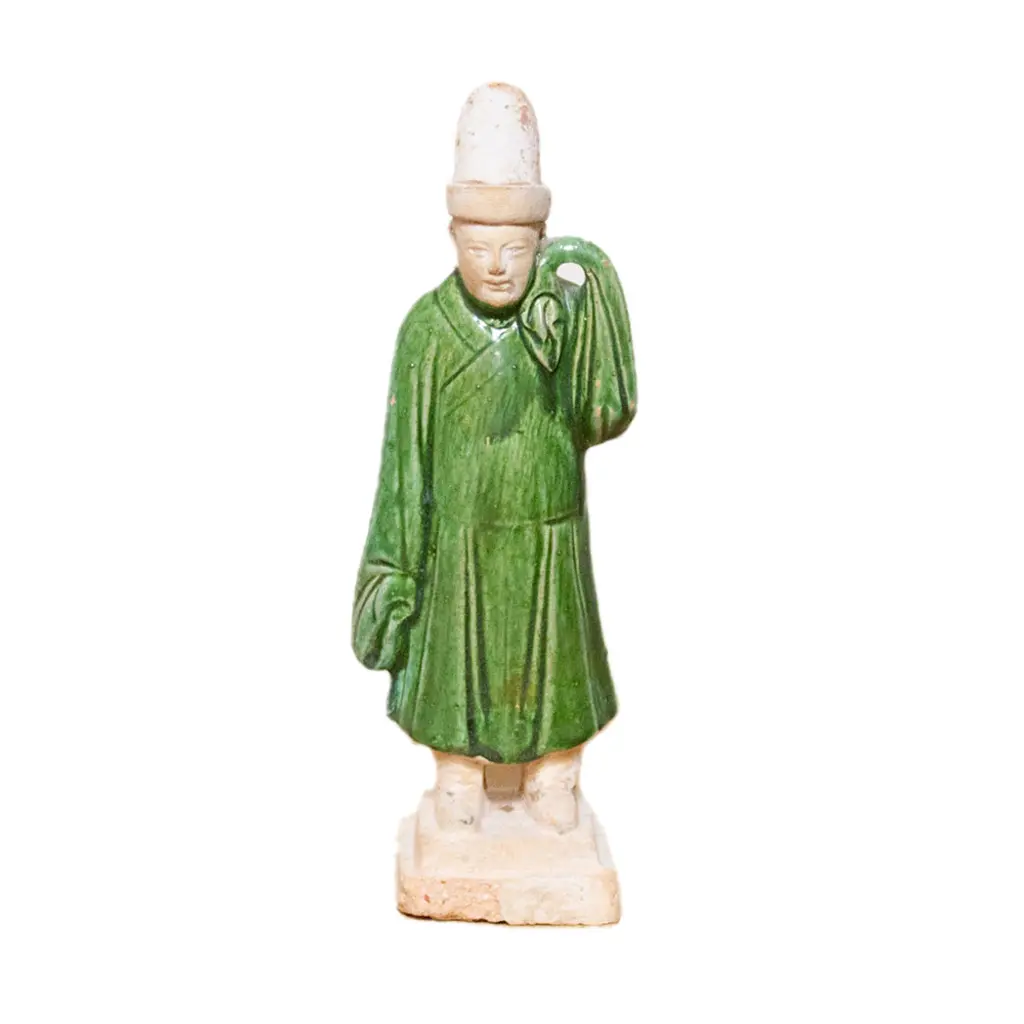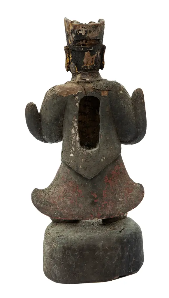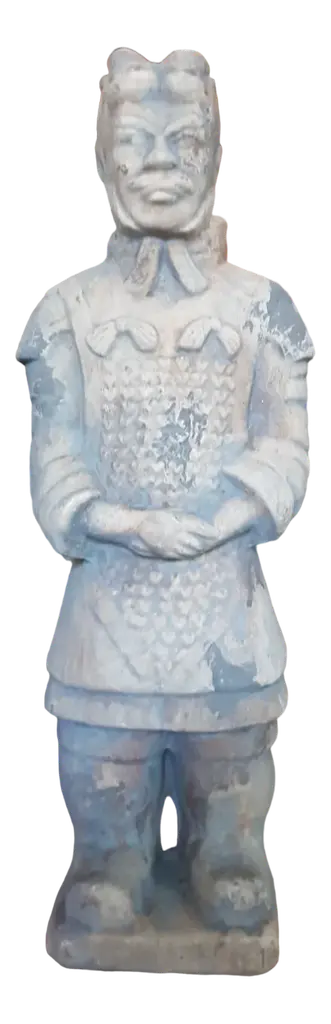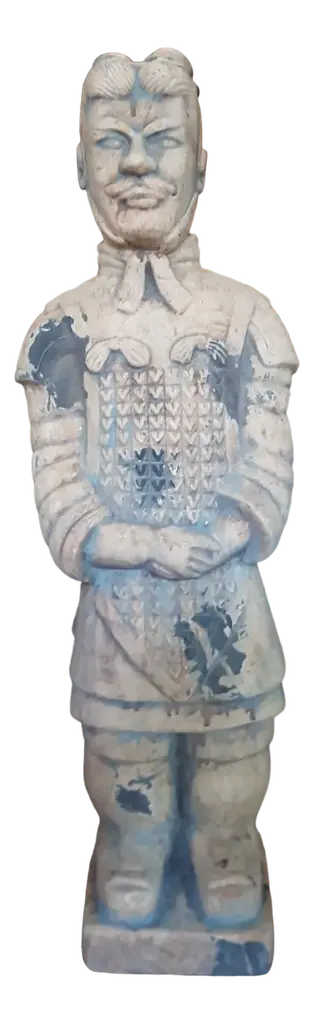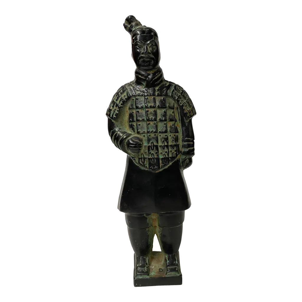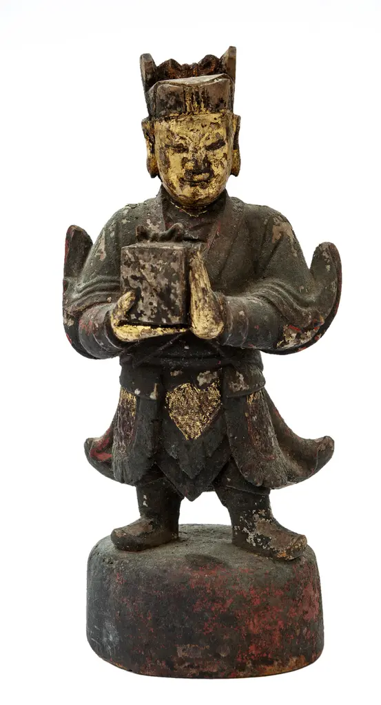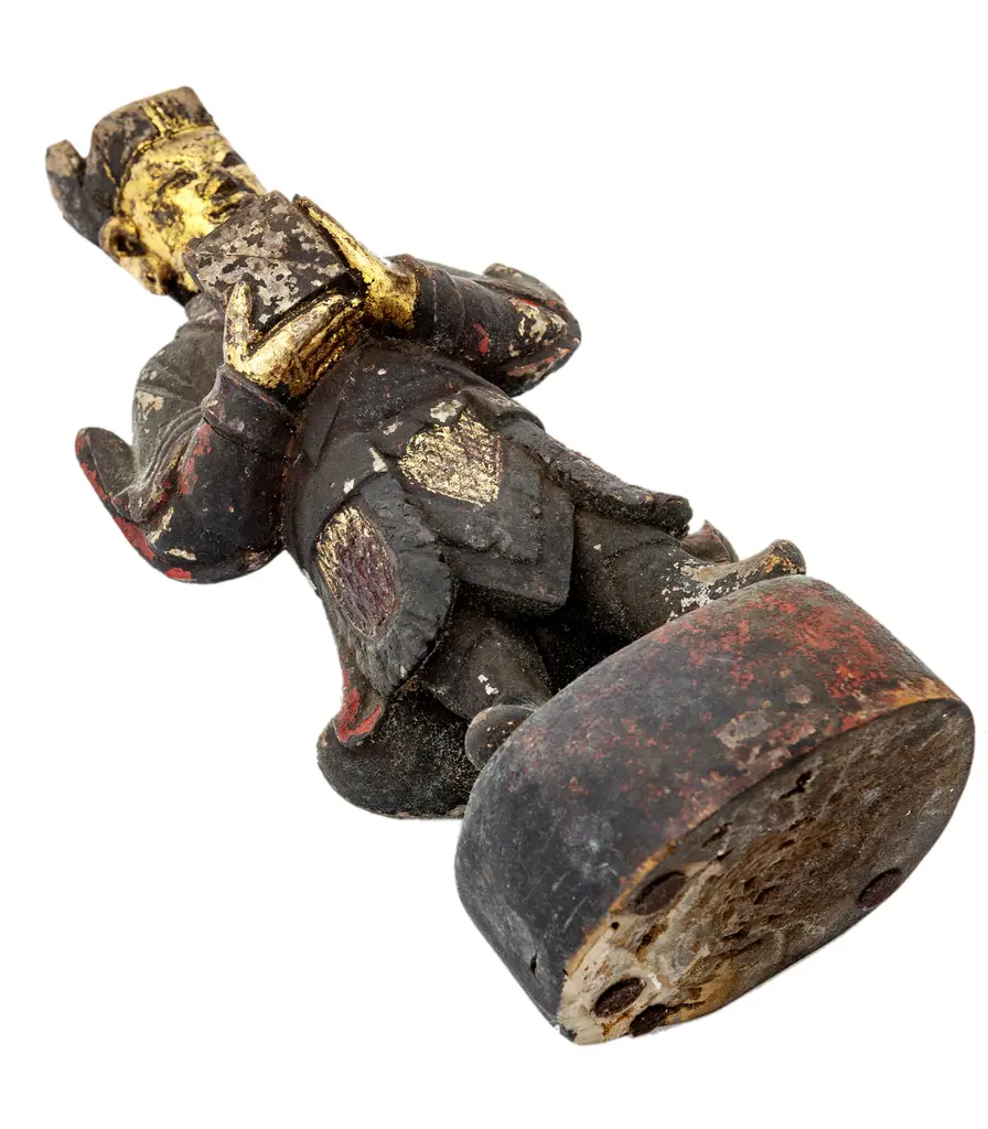 Ancient warrior represents the art of war and changing dynasties of China. Wearing full armor with carved details and gold leaf accents, he presents a gift box. One foot points outward in a classic pose as he stands atop a solid base.Red underpainting Certified by the Hong Kong Fine Art Association to be at least 120 years old. Purchased from Neiman Marcus. Certificate included.