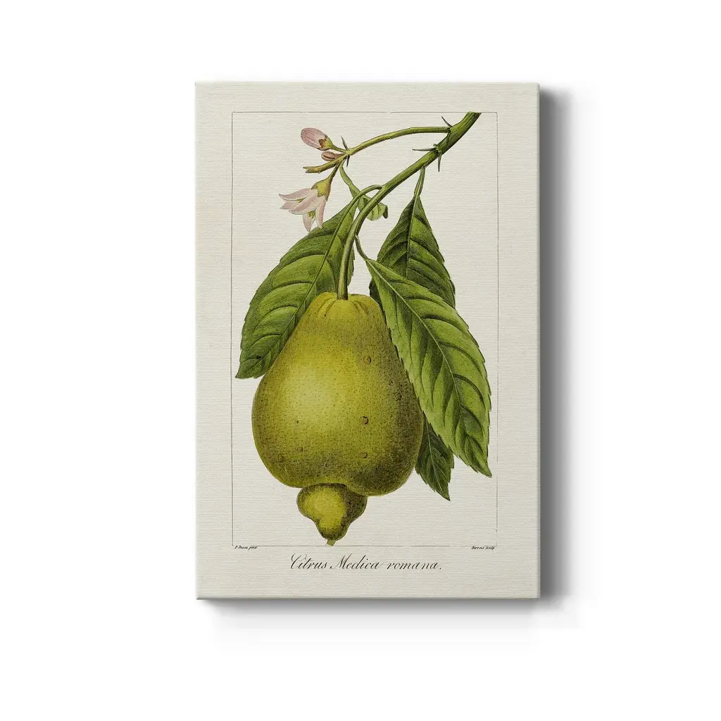 Antique Citrus Fruit III Premium Gallery Wrapped Canvas - Ready to Hang A premium hand stretched gallery wrapped canvas print created to last. Featuring a beveled a solid wood stretcher bar, each piece comes ready to hand 5 SIZES AVAILABLE 8''X12'' - Overall Size 16'X20'' - Overall Size 24''x32'' - Overall Size 30''x40'' - Overall Size 36''x48'' - Overall Size Each piece is made to order. Built to Last Each piece comes ready to hang Solid wood stretcher Fade and Water resistant Made domestically