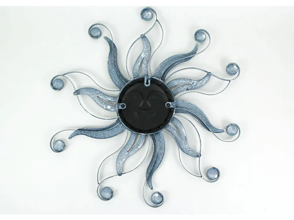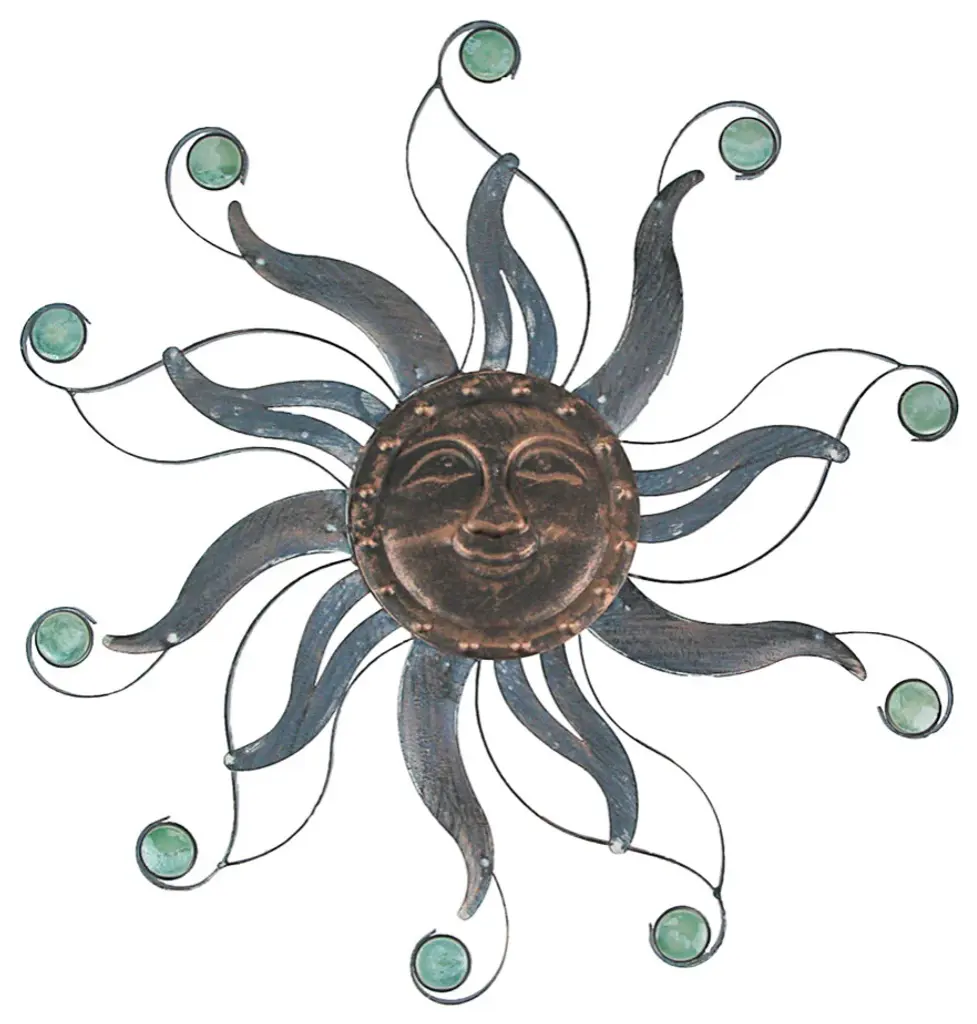 Generous Dimensions - This sun face wall hanging boasts an impressive 22-inch diameter and a depth of 1 inch, making it a substantial and eye-catching piece.Robust Craftsmanship - Constructed from durable metal, this wall decor is designed to withstand the test of time, ensuring years of indoor or outdoor display without wear or damage.Aged Elegance - The antiqued copper finish infuses the piece with a timeless charm, enhanced by the subtle allure of glass bead accents that bring a touch of color and sophistication to any wall.Effortless Installation - Featuring a built-in keyhole hanger on the back, this wall hanging is easy to mount, allowing you to quickly adorn your space with its celestial beauty.Thoughtful Gift - Whether for your own home or as a gesture to loved ones, this sun face wall hanging makes for a perfect gift idea. Its unique design and durable construction ensure it will be cherished for years to come.Elevate your home decor with this exquisite celestial wall hanging, boasting an aged copper finish and measuring an impressive 22 inches in diameter. The piece radiates personality with its charming smiling sun face, intricately crafted metal rays, and embellished with mottled ceramic disc bead accents. Suitable for both indoor and outdoor spaces, this artful creation effortlessly graces any wall, imparting a touch of celestial elegance to your living spaces. The blend of open and closed metalwork adds depth to the design, creating a captivating visual display that captures the eye. Its versatile nature allows it to enhance both indoor and outdoor settings, making it a striking addition to your home or garden. Whether hung in the living room, garden area, or even on the patio, this sun face wall hanging exudes warmth and positivity, enhancing the ambiance of any space. Ideal for gifting, this wall decor makes for a thoughtful housewarming gesture, bringing a touch of celestial beauty to the recipient''s home. The carefully aged copper finish lends an antique charm, while the mottled ceramic disc bead accents add a subtle touch of color, creating a harmonious blend that complements various decor styles. The wall hanging''s large size ensures it becomes a focal point, inviting admiration and awe from anyone who beholds its captivating presence.