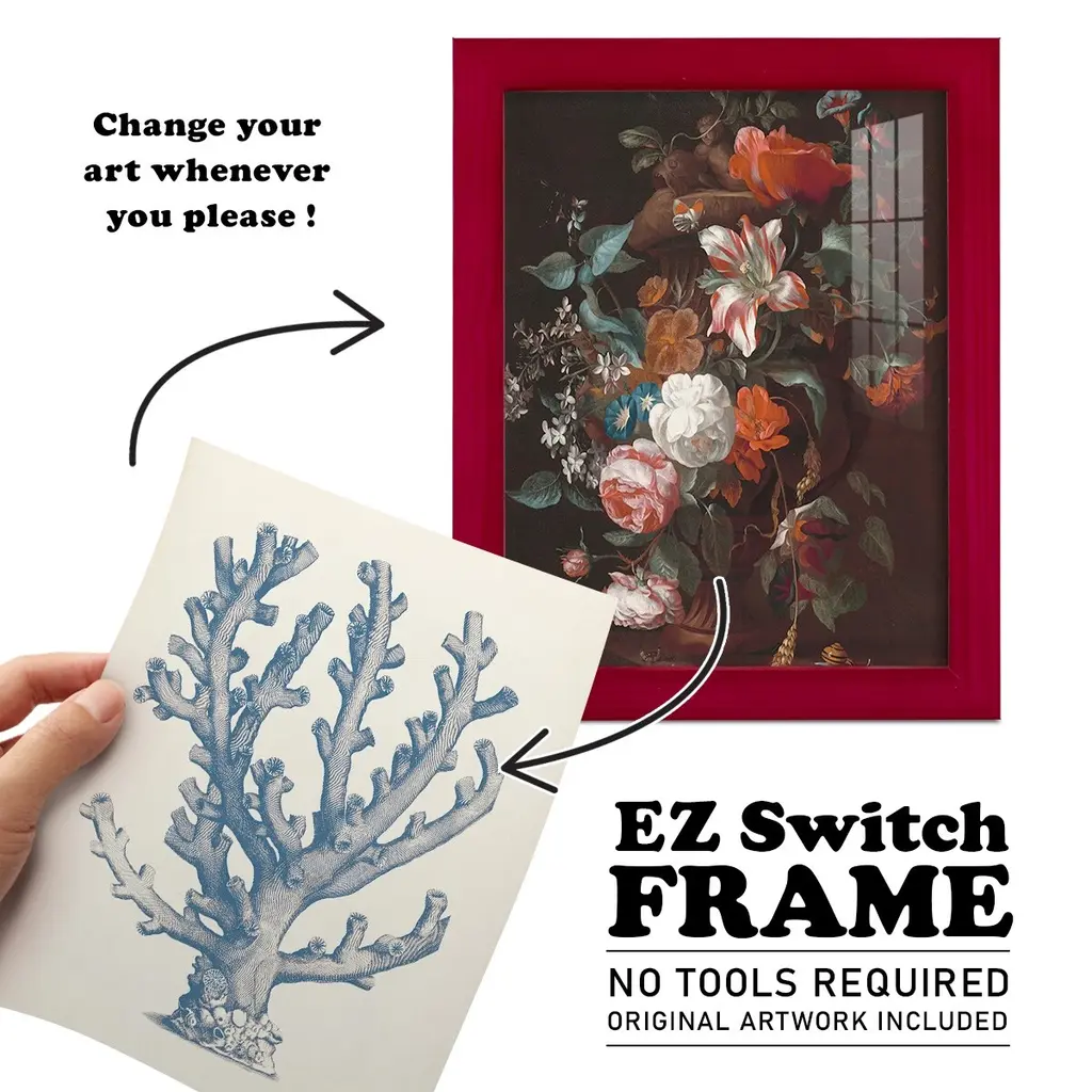 Antique Coral Collection VI -EZ SWITCH Framed Print w/glass-Cherry Red A delightful, framed print. Featuring a solid wood frame with real wood glass. This premium print is giclee quality. In addition, every frame features a removable back and table top stand. This allows you to change your art in the future or to just stand the art on a table for a new look. We are sure you'll enjoy our new series of EZ SWITCH Framed Art. Solid Wood Frame Real Glass Removable / Replaceable Art Built in Tabletop Stand Sizes range from 4x6 up to 12x15 - buy just one or pair them up as sets as you see fit.