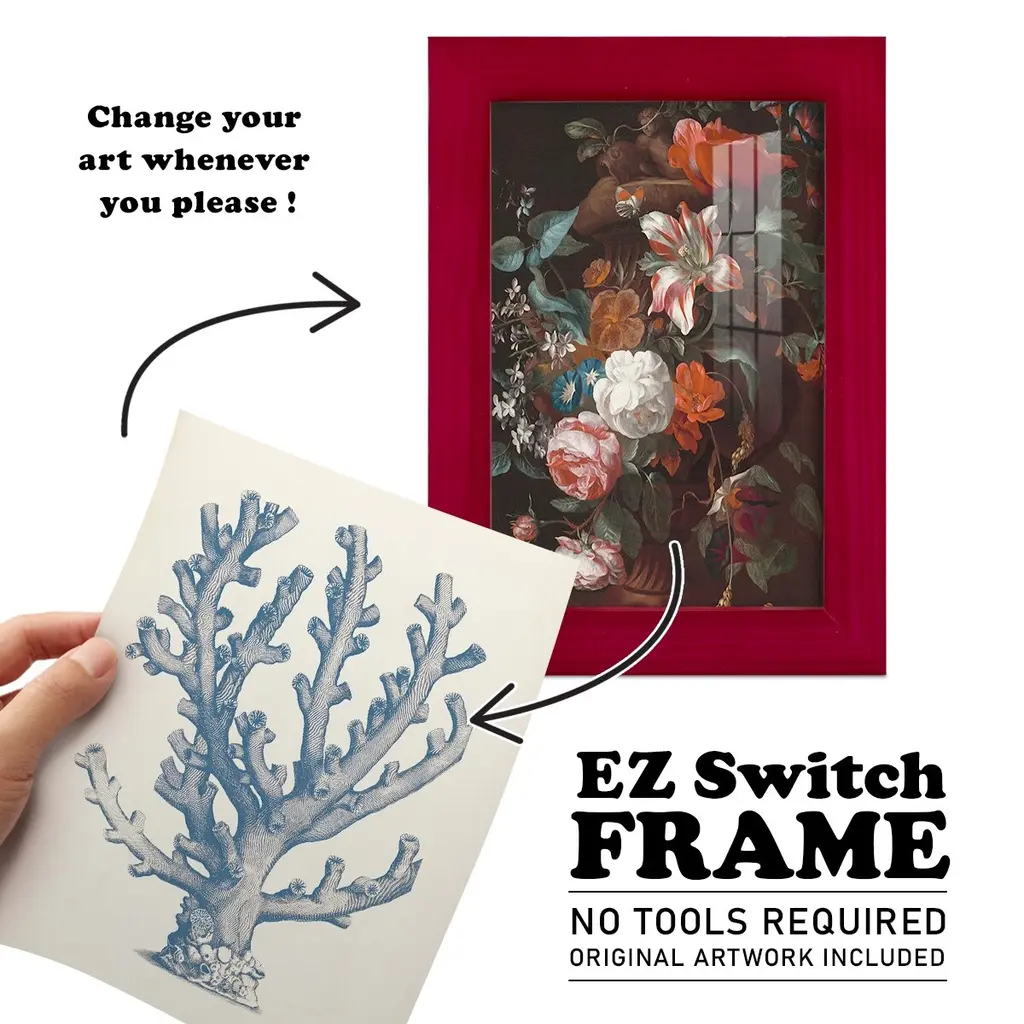 Antique Coral Collection VI -EZ SWITCH Framed Print w/glass-Cherry Red A delightful, framed print. Featuring a solid wood frame with real wood glass. This premium print is giclee quality. In addition, every frame features a removable back and table top stand. This allows you to change your art in the future or to just stand the art on a table for a new look. We are sure you'll enjoy our new series of EZ SWITCH Framed Art. Solid Wood Frame Real Glass Removable / Replaceable Art Built in Tabletop Stand Sizes range from 4x6 up to 12x15 - buy just one or pair them up as sets as you see fit.