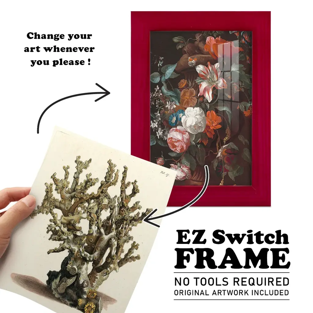 Antique Coral II -EZ SWITCH Framed Print w/glass-Cherry Red A delightful, framed print. Featuring a solid wood frame with real wood glass. This premium print is giclee quality. In addition, every frame features a removable back and table top stand. This allows you to change your art in the future or to just stand the art on a table for a new look. We are sure you'll enjoy our new series of EZ SWITCH Framed Art. Solid Wood Frame Real Glass Removable / Replaceable Art Built in Tabletop Stand Sizes range from 4x6 up to 12x15 - buy just one or pair them up as sets as you see fit.