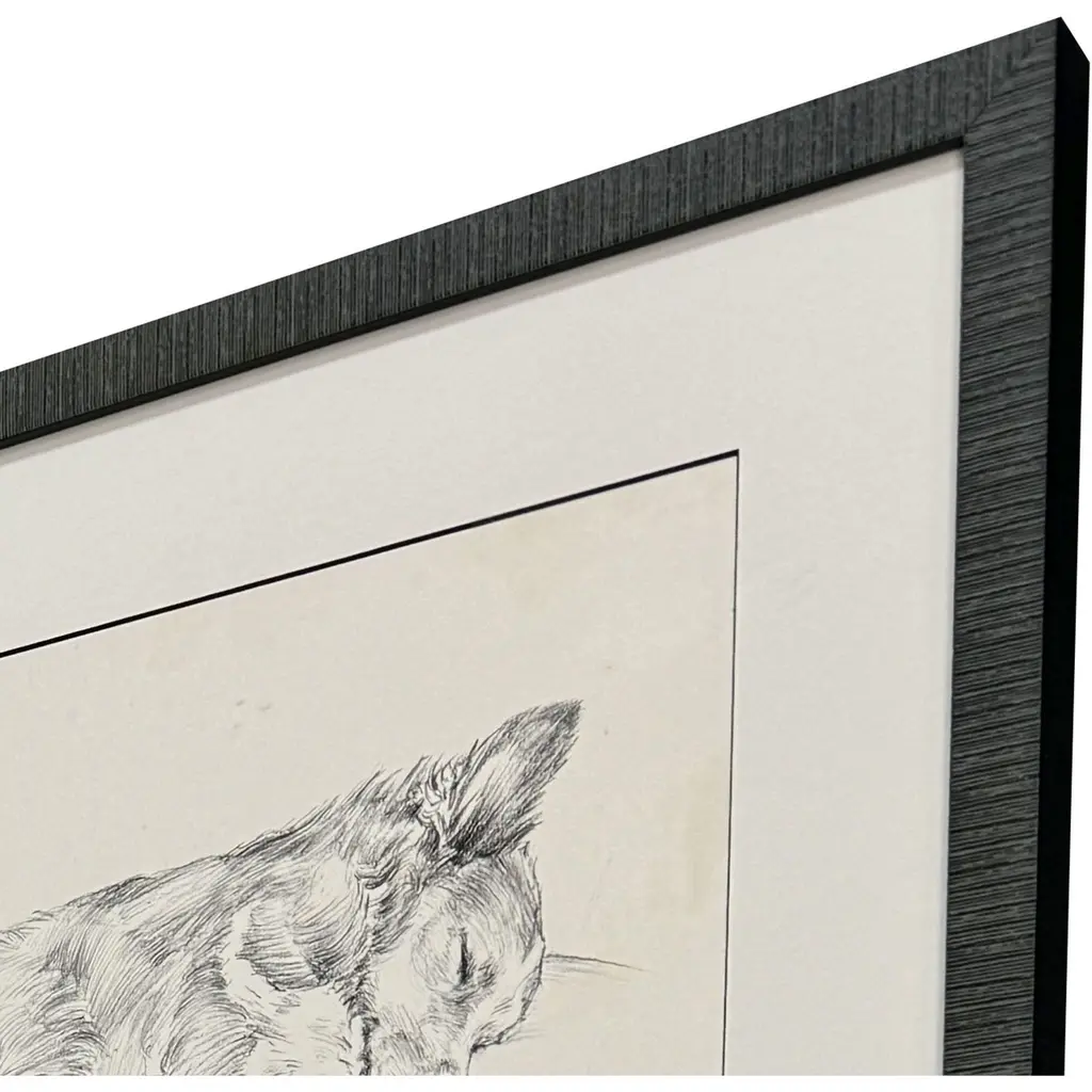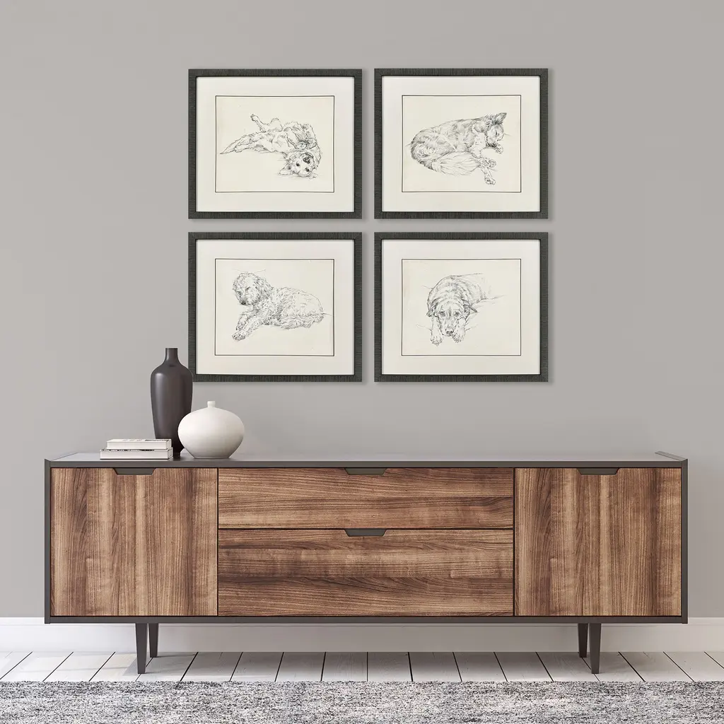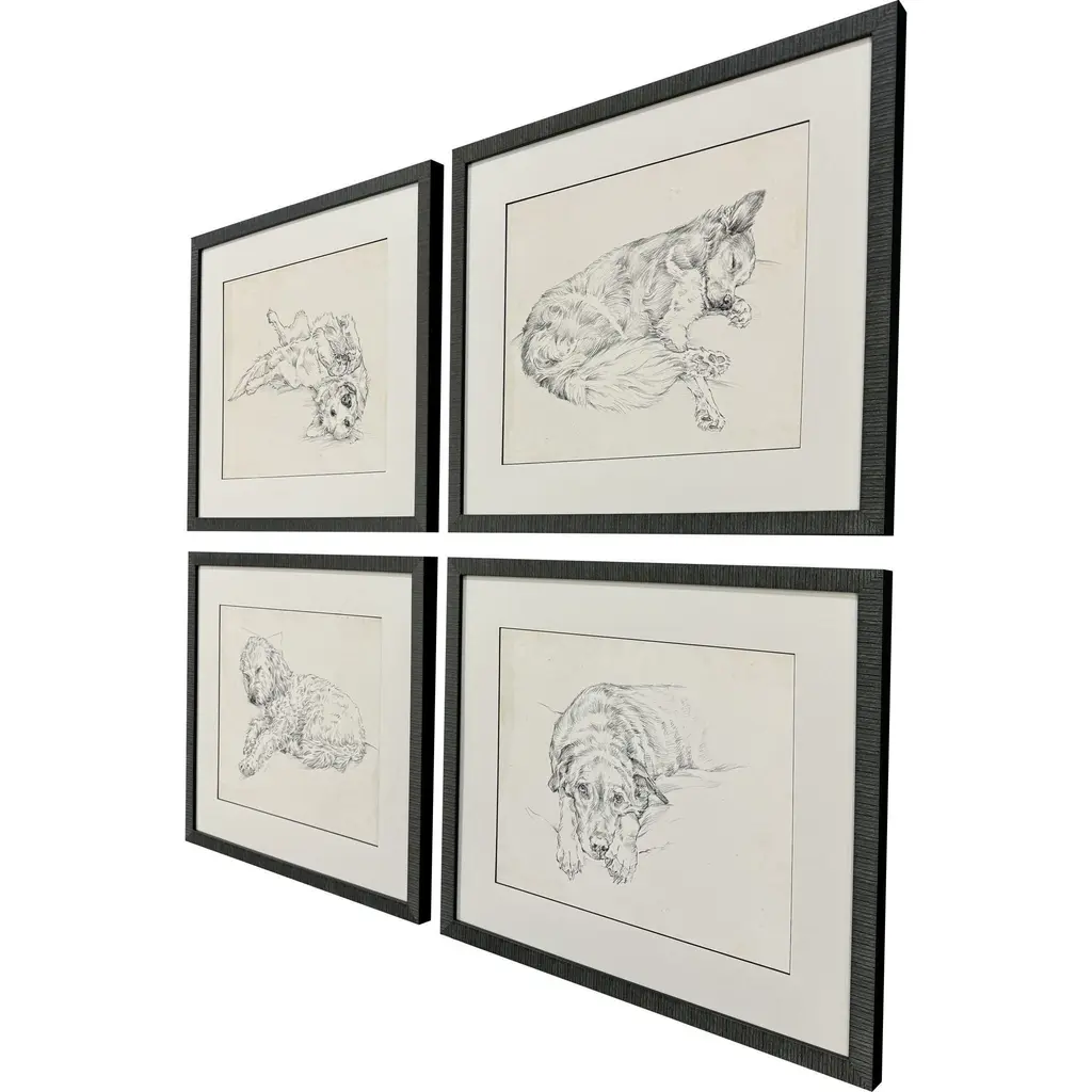 Loveable vintage dog sketches are matted in white. They are framed in a distressed black finish molding with a gray wash and black side.