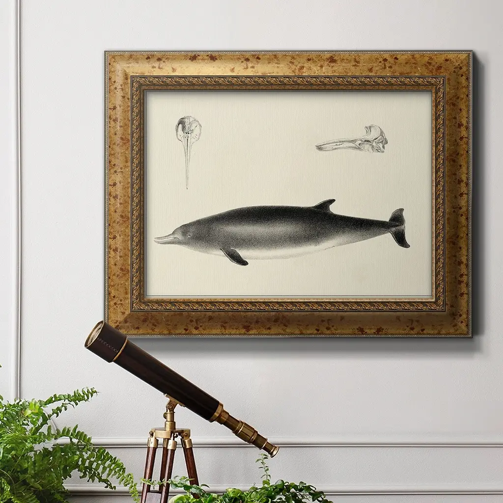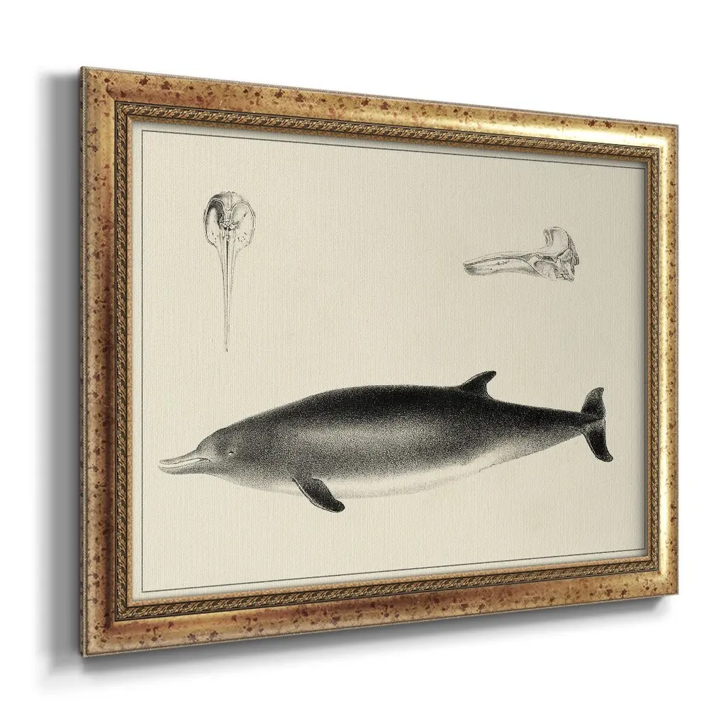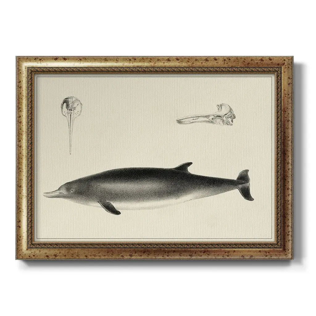 Antique Dolphin Study I Premium Framed Canvas- Ready to Hang A Premium Framed Canvas created to last. Framed in distressed wood and available in an array of sizes and colors Featuring a beveled a solid wood stretcher bar, each piece comes ready to hand 3 SIZES AVAILABLE 16''X20'' - Overall Size 18'X27'' - Overall Size 24''x36'' - Overall Size Each piece is made to order. Each piece comes with hanging hardware. Made in the USA Ready to Hang Giclee Paper Print Acrylic Glass Beveled Matt Board