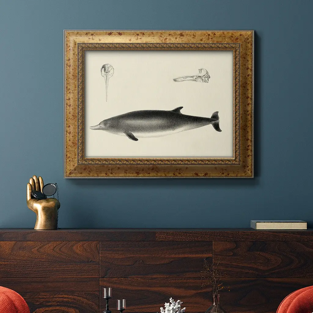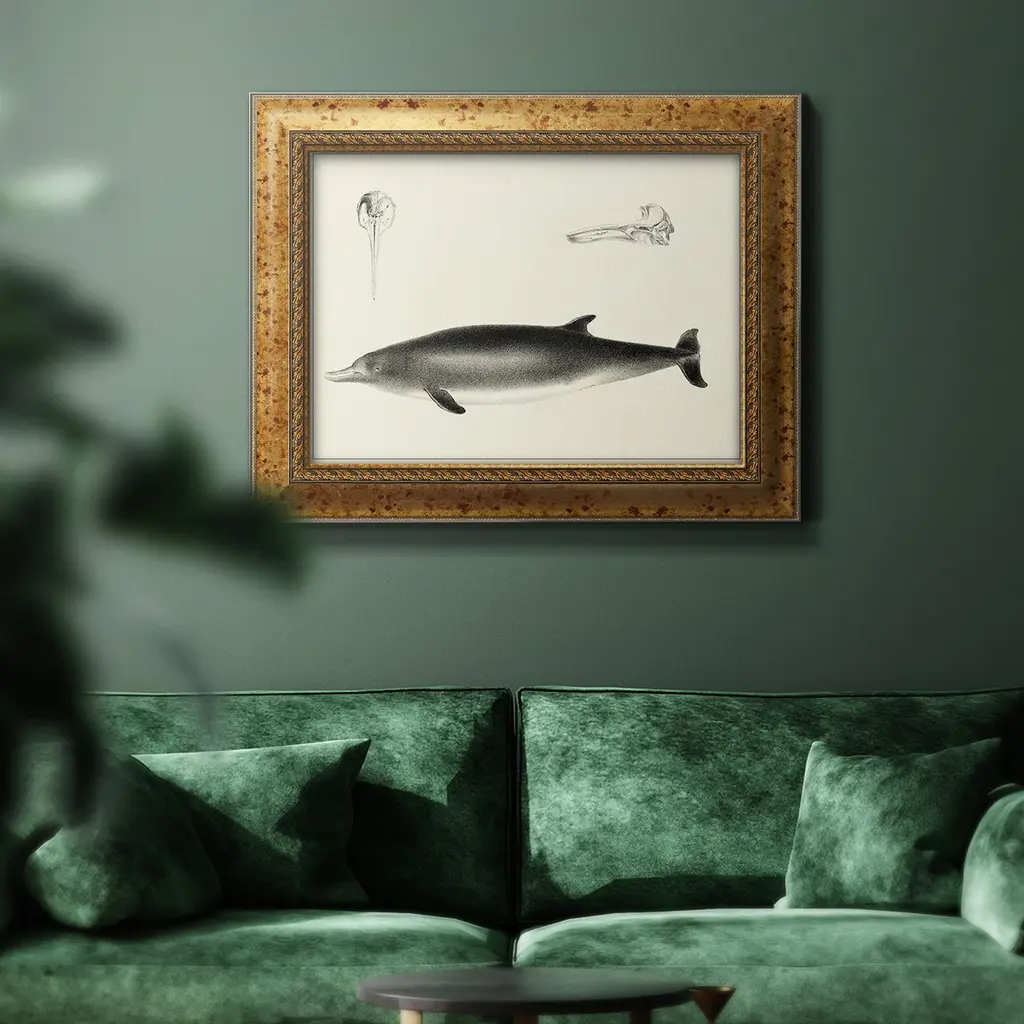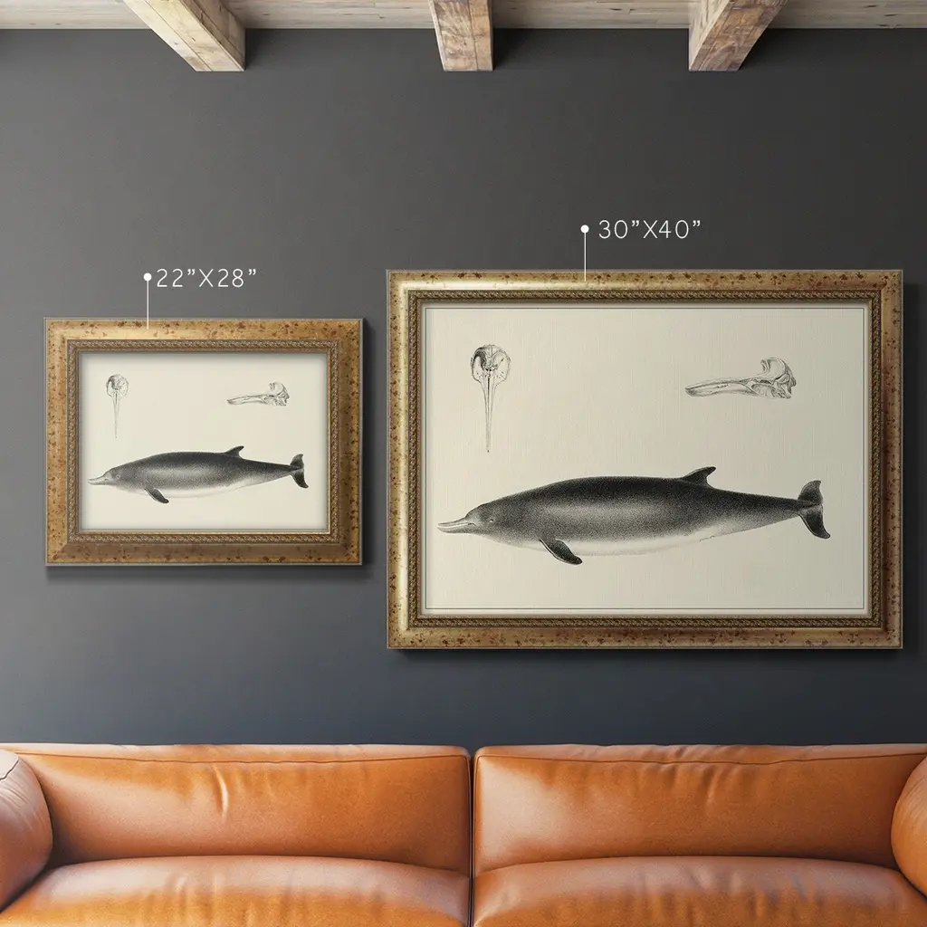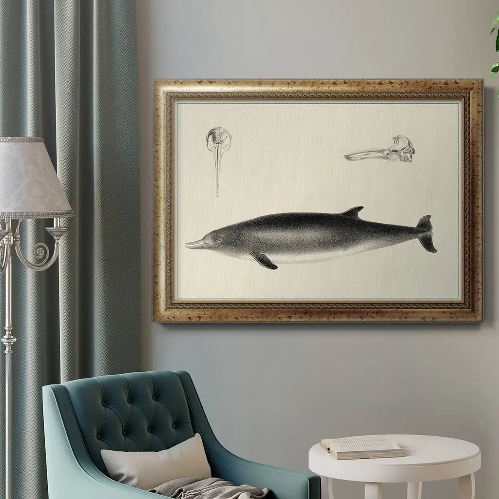 Antique Dolphin Study I Premium Framed Canvas- Ready to Hang A Premium Framed Canvas created to last. Framed in distressed wood and available in an array of sizes and colors Featuring a beveled a solid wood stretcher bar, each piece comes ready to hand 3 SIZES AVAILABLE 16''X20'' - Overall Size 18'X27'' - Overall Size 24''x36'' - Overall Size Each piece is made to order. Each piece comes with hanging hardware. Made in the USA Ready to Hang Giclee Paper Print Acrylic Glass Beveled Matt Board
