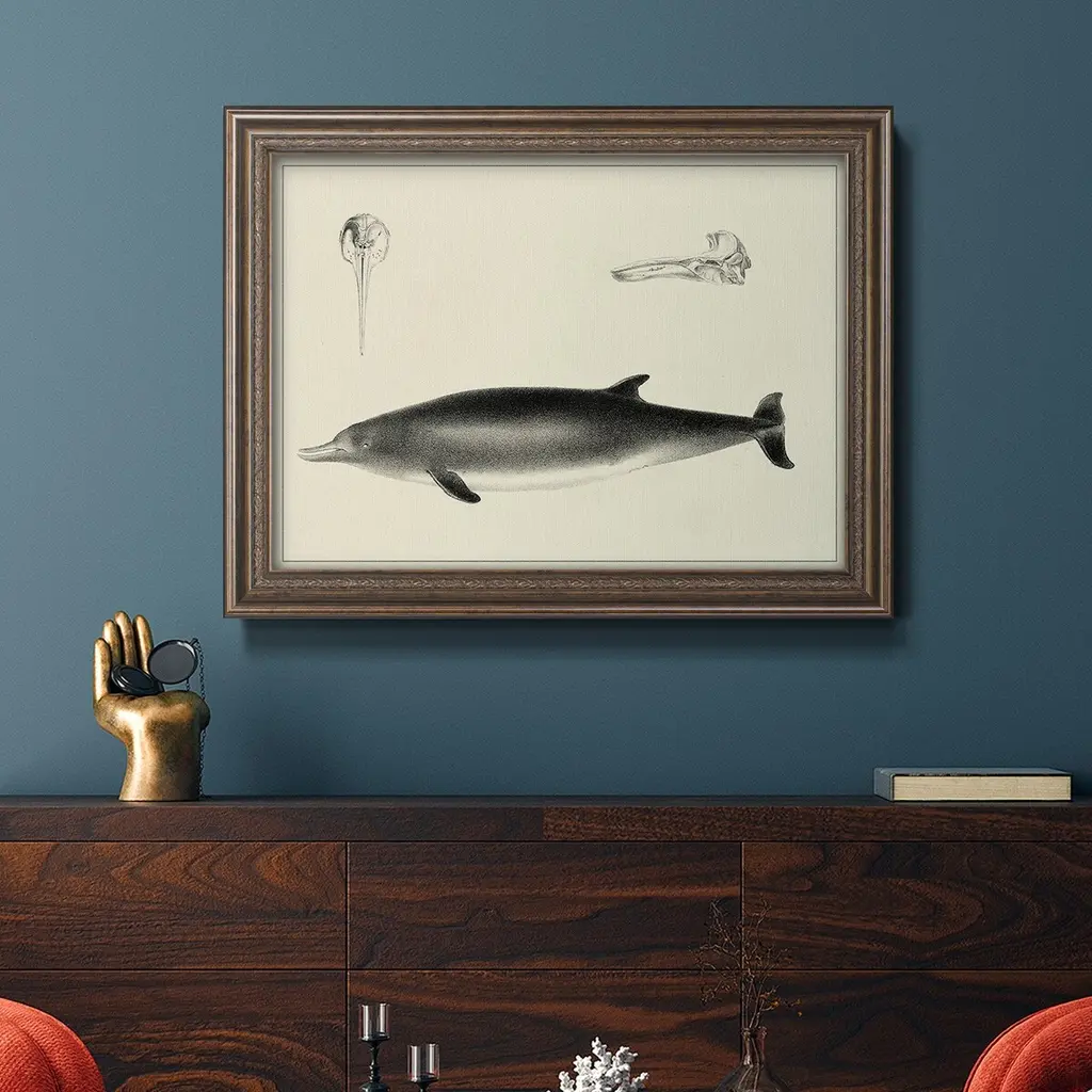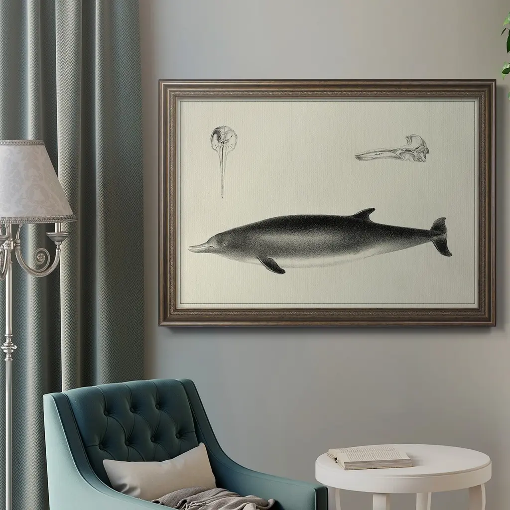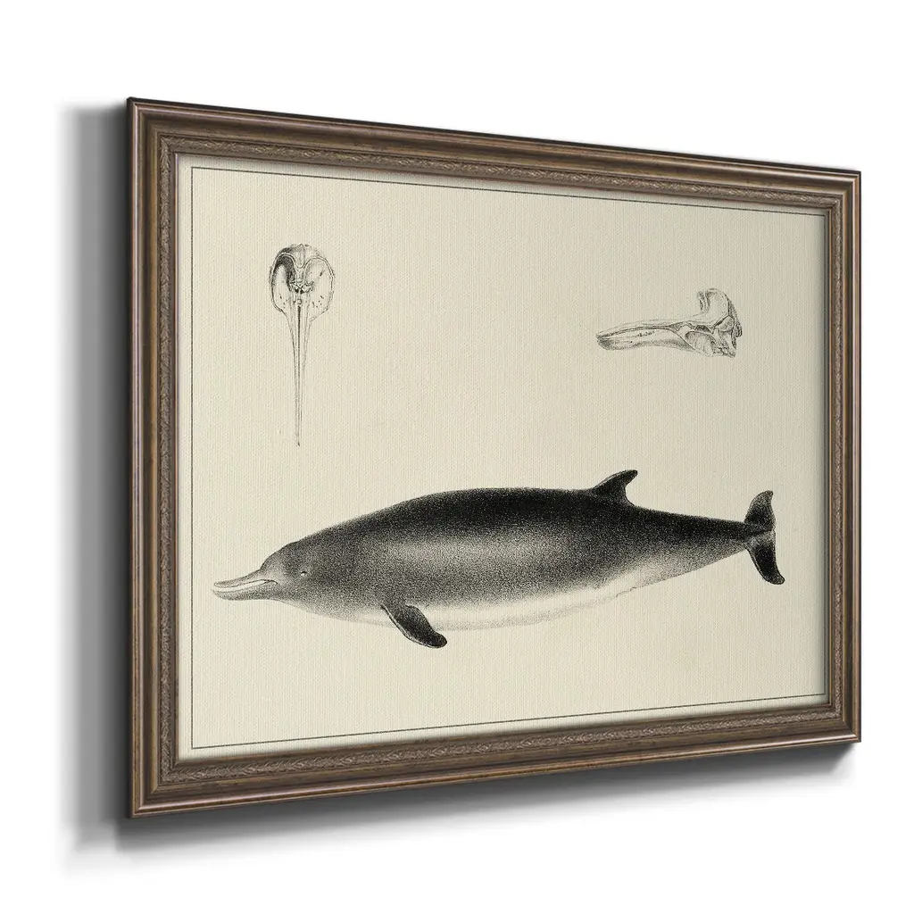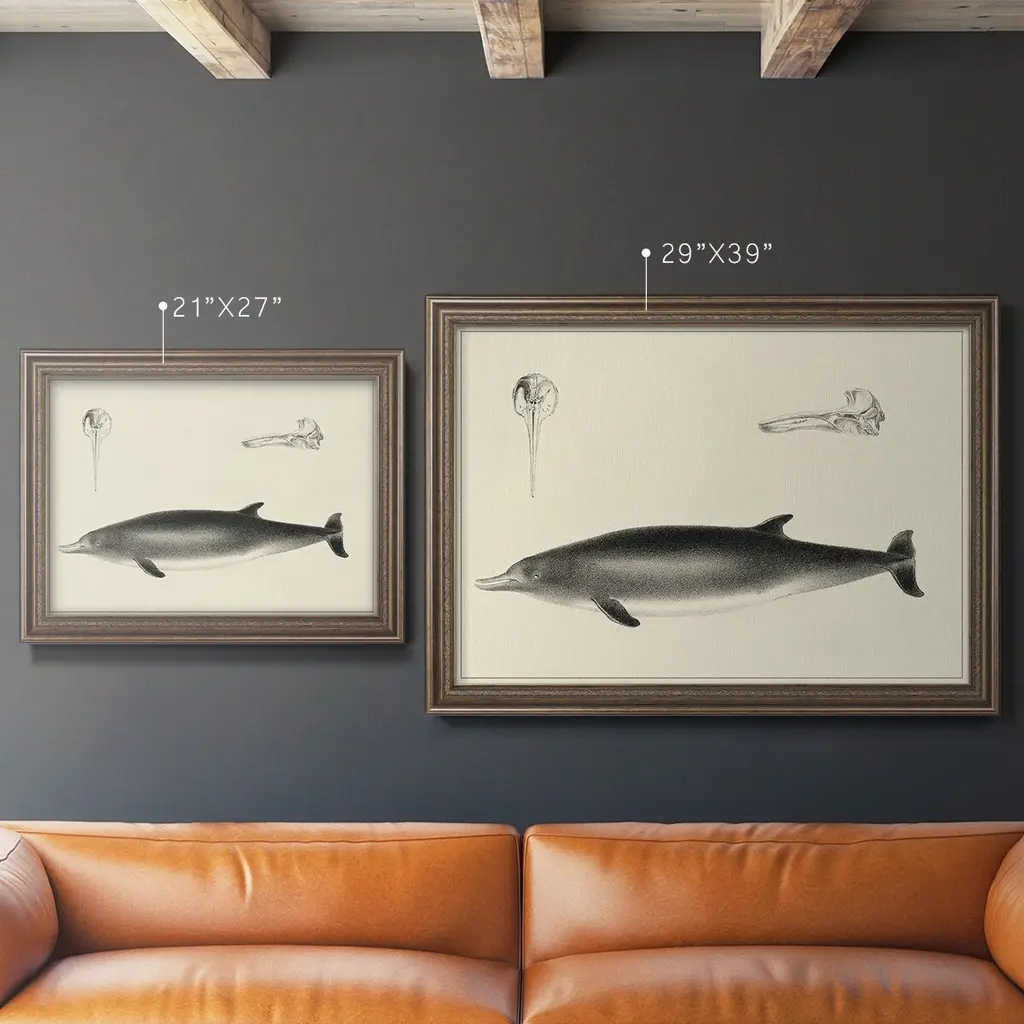 Antique Dolphin Study I Premium Framed Canvas- Ready to Hang A Premium Framed Canvas created to last. Framed in distressed wood and available in an array of sizes and colors Featuring a beveled a solid wood stretcher bar, each piece comes ready to hand 3 SIZES AVAILABLE 16''X20'' - Overall Size 18'X27'' - Overall Size 24''x36'' - Overall Size Each piece is made to order. Each piece comes with hanging hardware. Made in the USA Ready to Hang Giclee Paper Print Acrylic Glass Beveled Matt Board