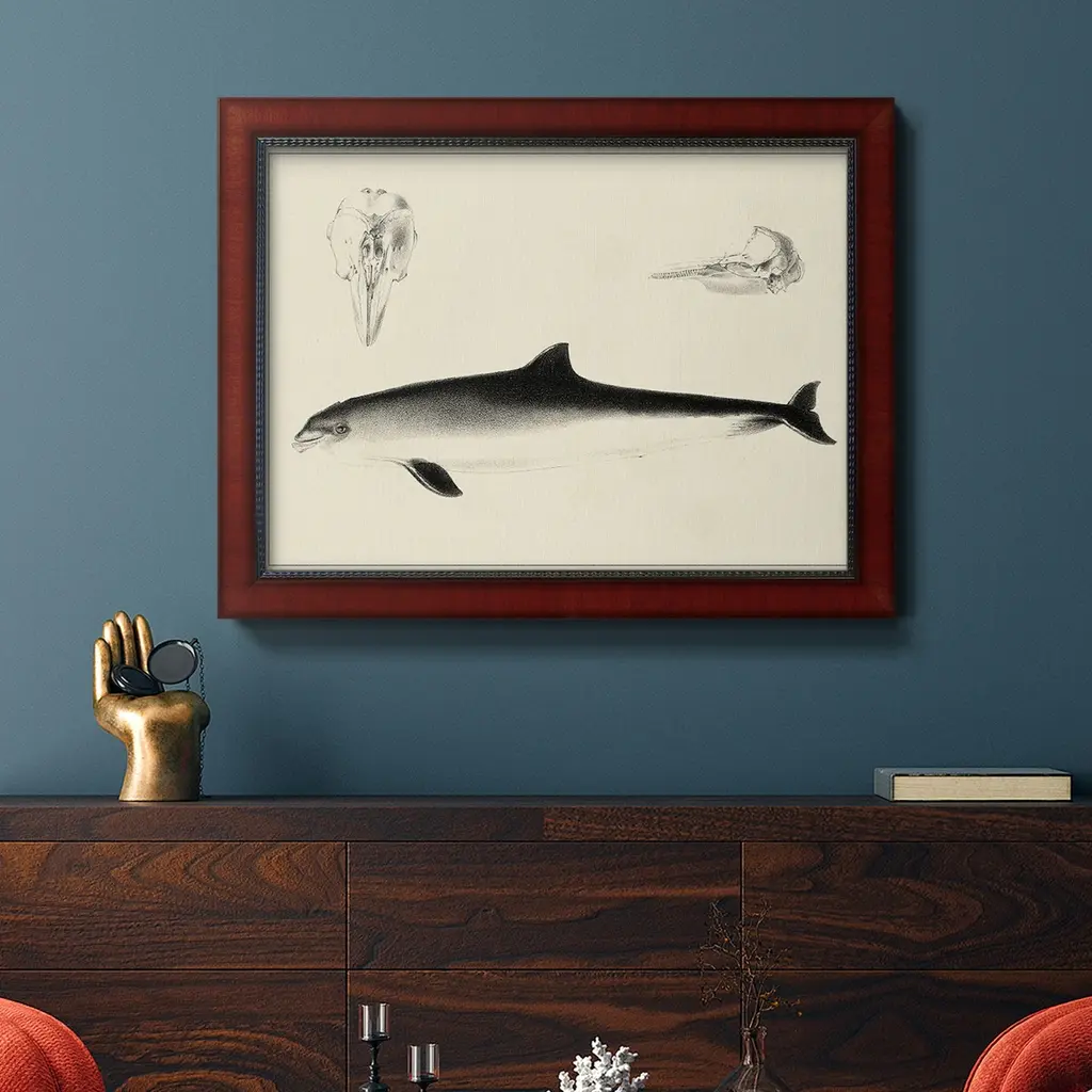 Antique Dolphin Study II Premium Framed Canvas- Ready to Hang A Premium Framed Canvas created to last. Framed in distressed wood and available in an array of sizes and colors Featuring a beveled a solid wood stretcher bar, each piece comes ready to hand 3 SIZES AVAILABLE 16''X20'' - Overall Size 18'X27'' - Overall Size 24''x36'' - Overall Size Each piece is made to order. Each piece comes with hanging hardware. Made in the USA Ready to Hang Giclee Paper Print Acrylic Glass Beveled Matt Board