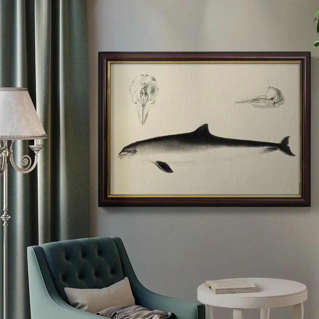 Antique Dolphin Study II Premium Framed Canvas- Ready to Hang A Premium Framed Canvas created to last. Framed in distressed wood and available in an array of sizes and colors Featuring a beveled a solid wood stretcher bar, each piece comes ready to hand 3 SIZES AVAILABLE 16''X20'' - Overall Size 18'X27'' - Overall Size 24''x36'' - Overall Size Each piece is made to order. Each piece comes with hanging hardware. Made in the USA Ready to Hang Giclee Paper Print Acrylic Glass Beveled Matt Board