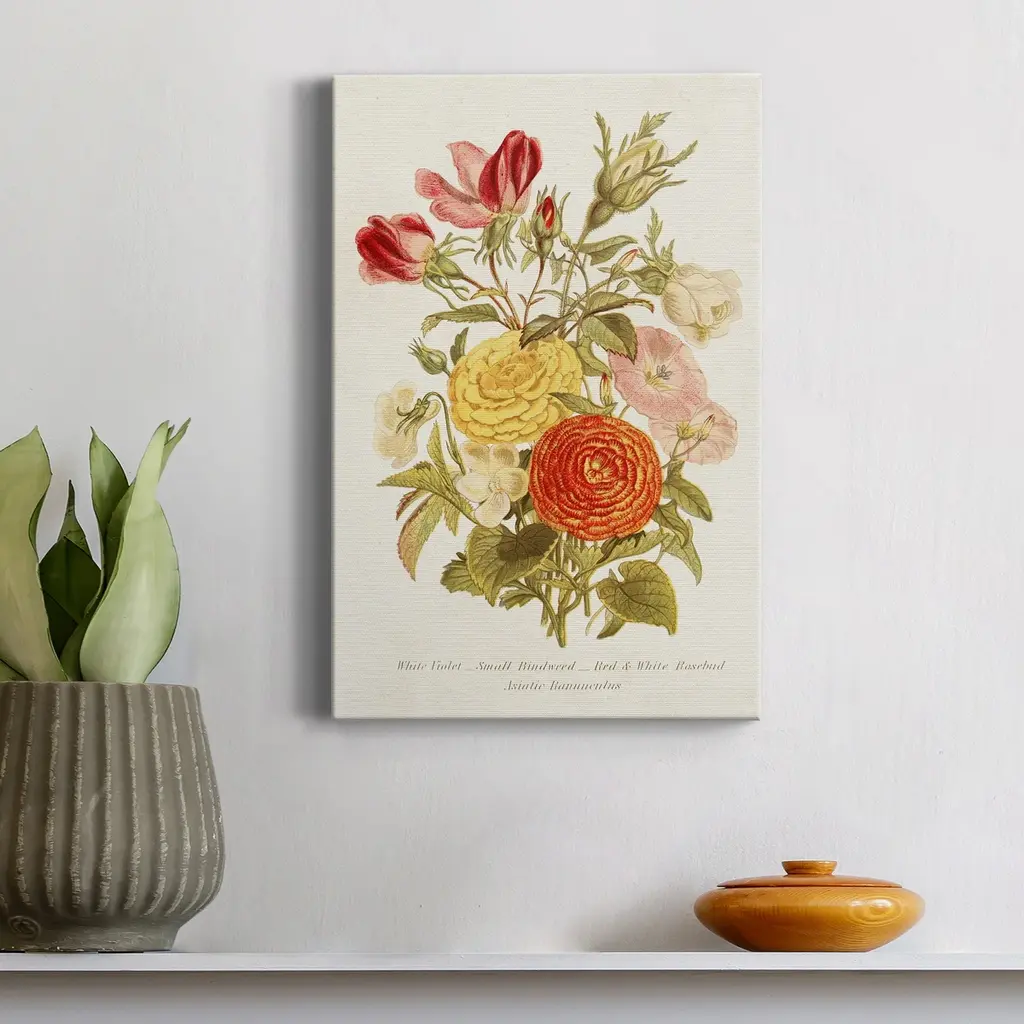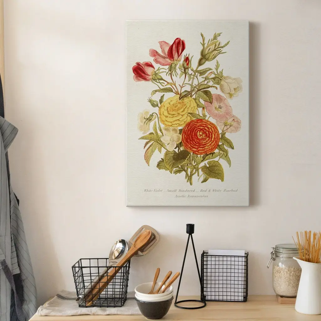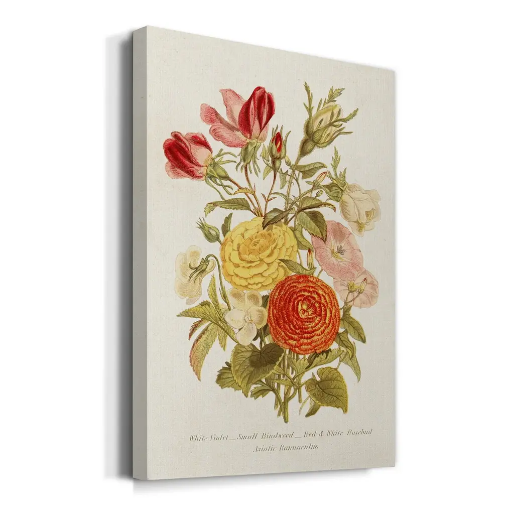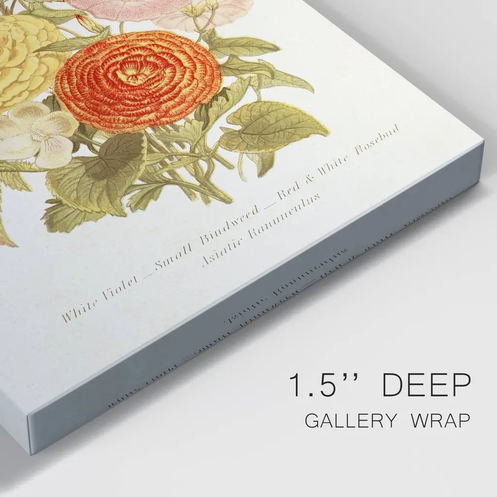 Antique Floral Bouquet I Premium Gallery Wrapped Canvas - Ready to Hang A premium hand stretched gallery wrapped canvas print created to last. Featuring a beveled a solid wood stretcher bar, each piece comes ready to hand 6 SIZES AVAILABLE 8''X12'' - Overall Size 12''X18'' - Overall Size 18''X27'' - Overall Size 24''x36'' - Overall Size 32''x48'' - Overall Size 40''x60'' - Overall Size Each piece is made to order. Built to Last Each piece comes ready to hang Solid wood stretcher Fade and Water resistant Made domestically