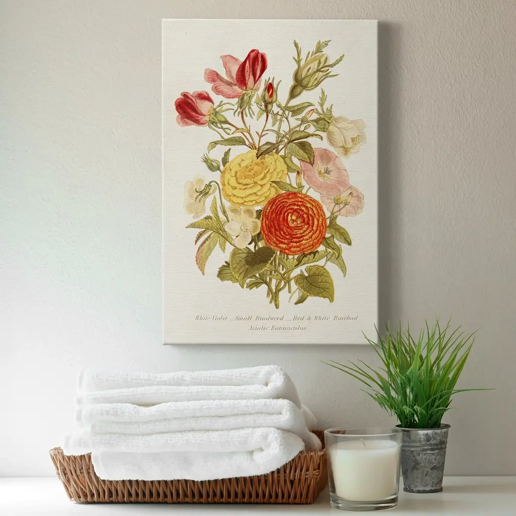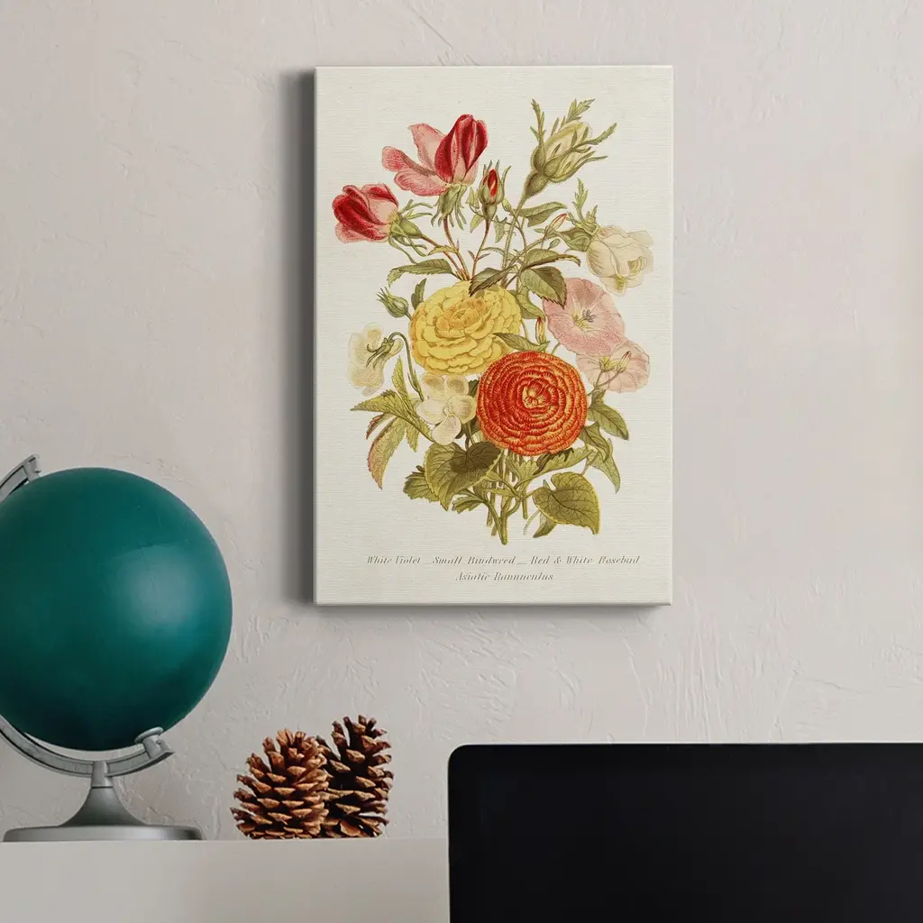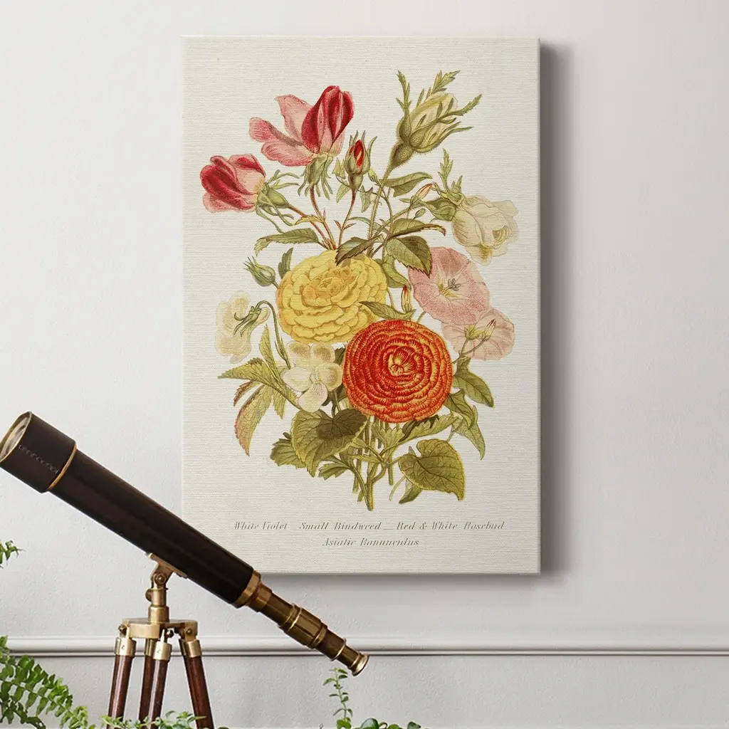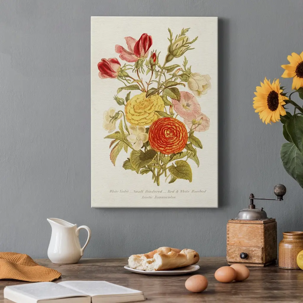 Antique Floral Bouquet I Premium Gallery Wrapped Canvas - Ready to Hang A premium hand stretched gallery wrapped canvas print created to last. Featuring a beveled a solid wood stretcher bar, each piece comes ready to hand 6 SIZES AVAILABLE 8''X12'' - Overall Size 12''X18'' - Overall Size 18''X27'' - Overall Size 24''x36'' - Overall Size 32''x48'' - Overall Size 40''x60'' - Overall Size Each piece is made to order. Built to Last Each piece comes ready to hang Solid wood stretcher Fade and Water resistant Made domestically