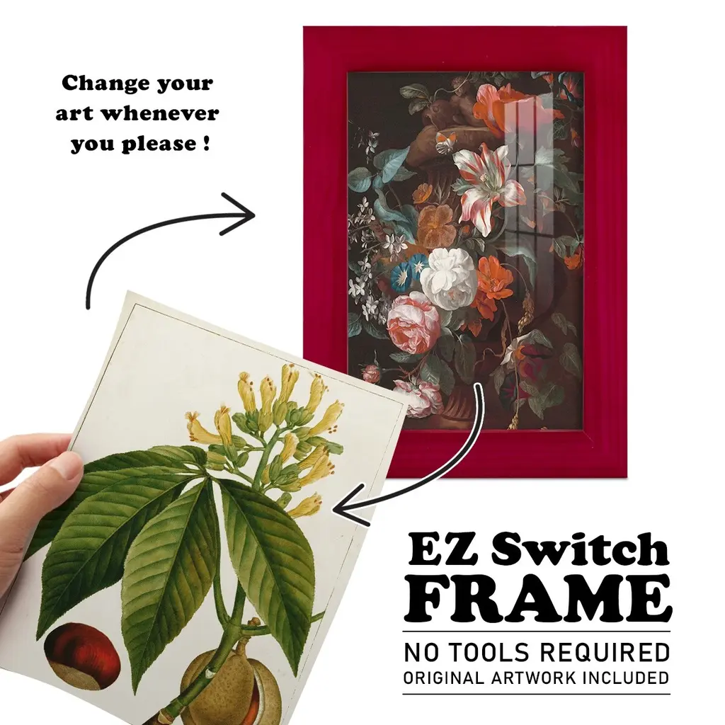 Antique Flowering Trees VI -EZ SWITCH Framed Print w/glass-Cherry Red A delightful, framed print. Featuring a solid wood frame with real wood glass. This premium print is giclee quality. In addition, every frame features a removable back and table top stand. This allows you to change your art in the future or to just stand the art on a table for a new look. We are sure you'll enjoy our new series of EZ SWITCH Framed Art. Solid Wood Frame Real Glass Removable / Replaceable Art Built in Tabletop Stand Sizes range from 4x6 up to 12x15 - buy just one or pair them up as sets as you see fit.