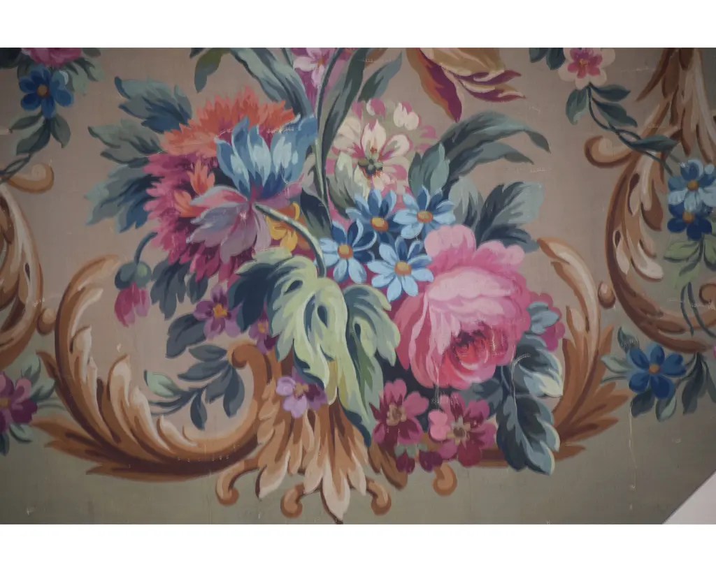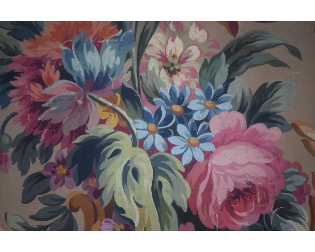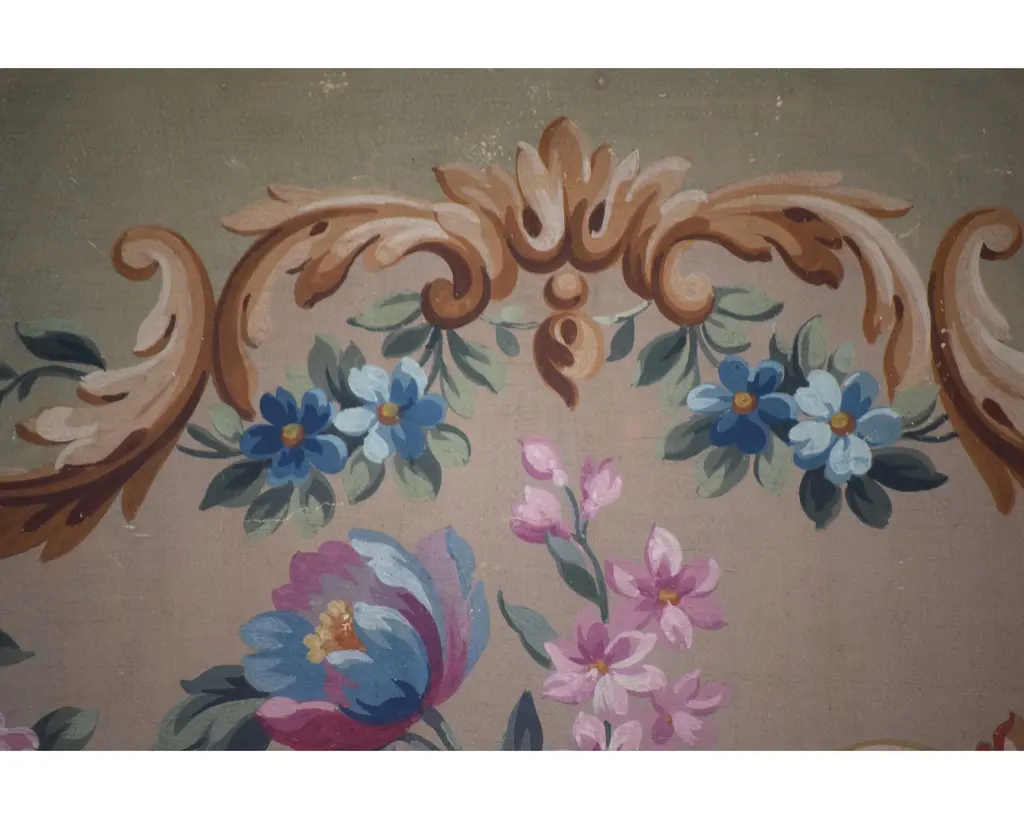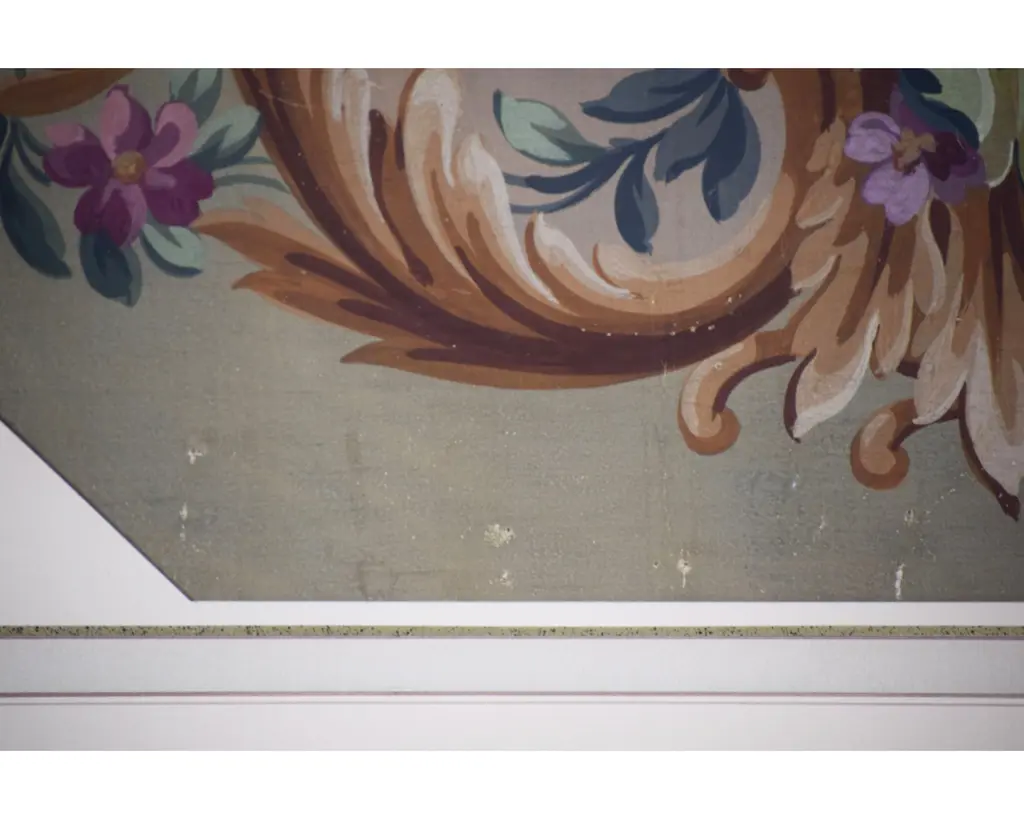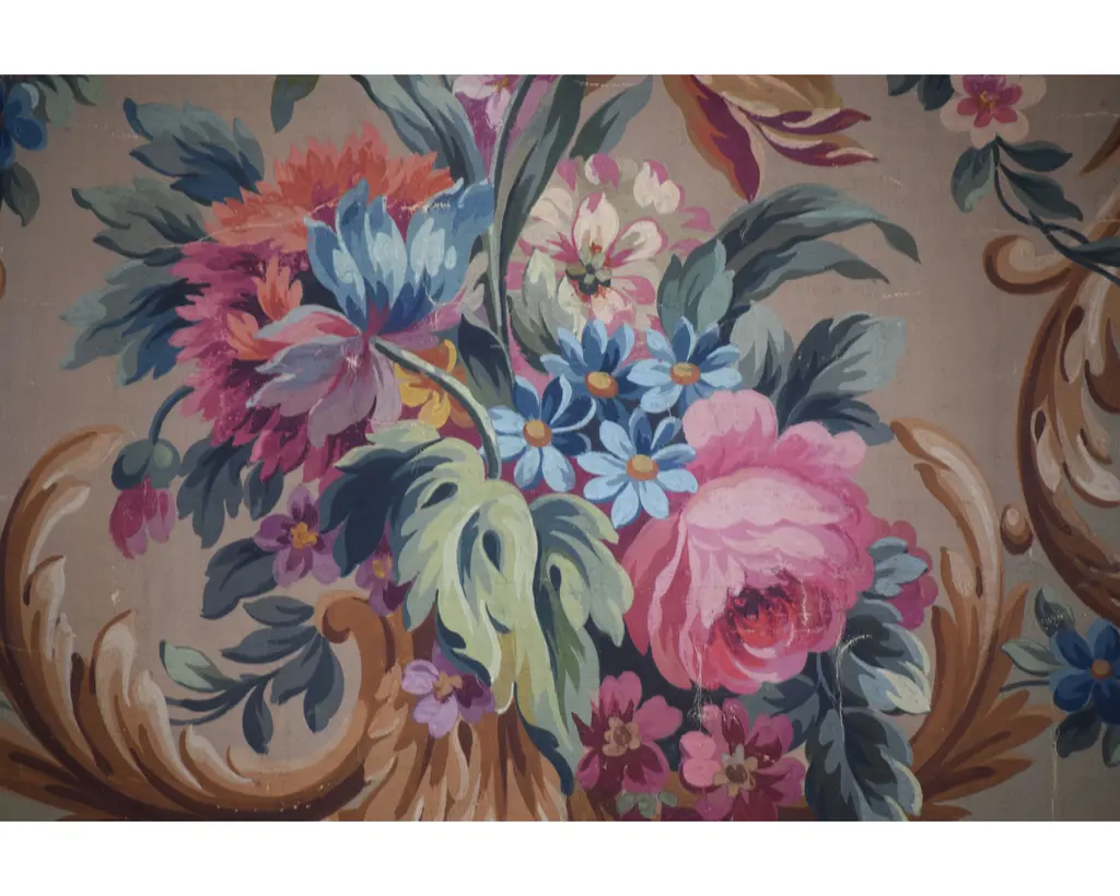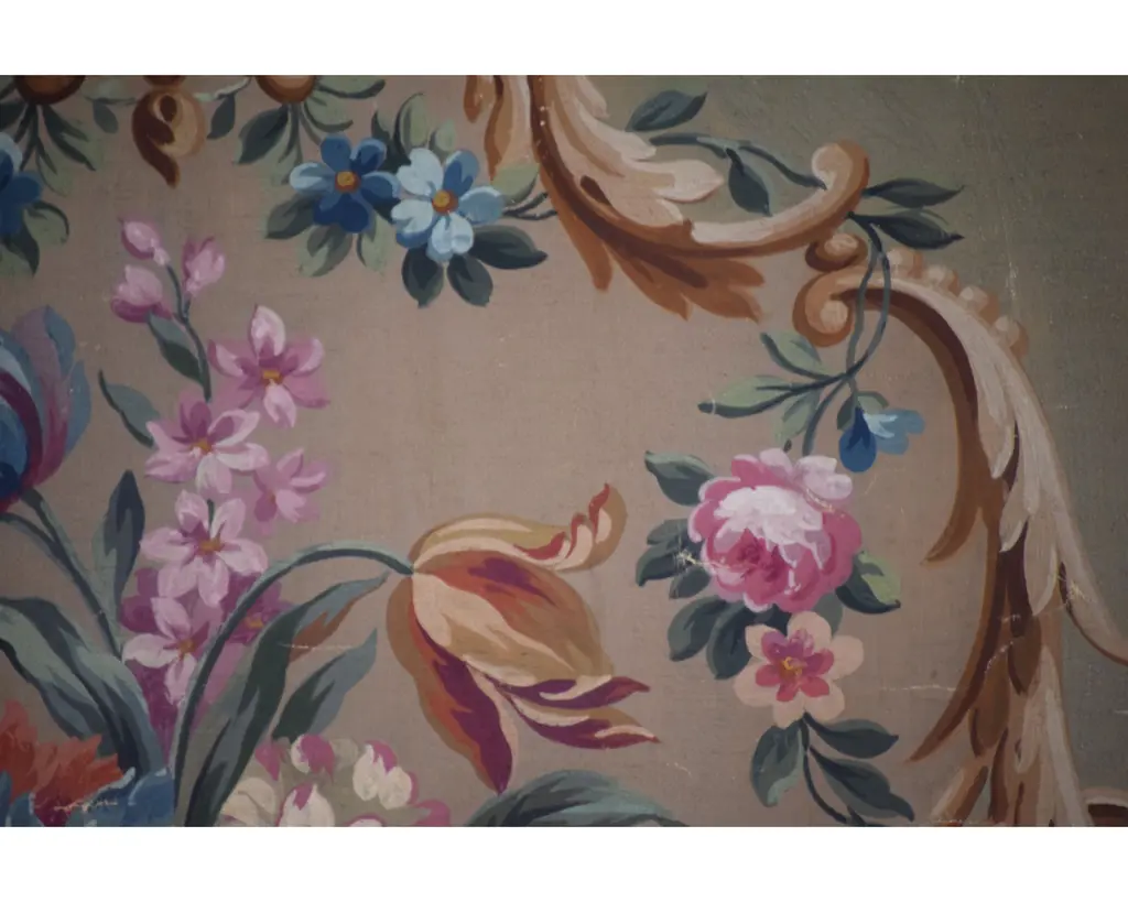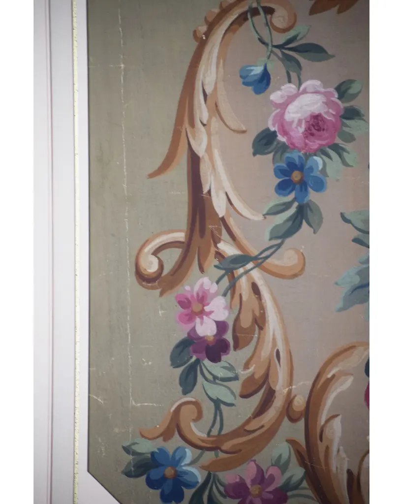 Late 18th-Early 19th Century Aubusson gouache painting of floral garlands in shades of pink, blue, and green against a tan background. Presented in french matting and carved gilt wood frame. Image size: 26" W x 23.25" H, overall framed measurements: 36.5" W x 33.75" H x 1.75" D