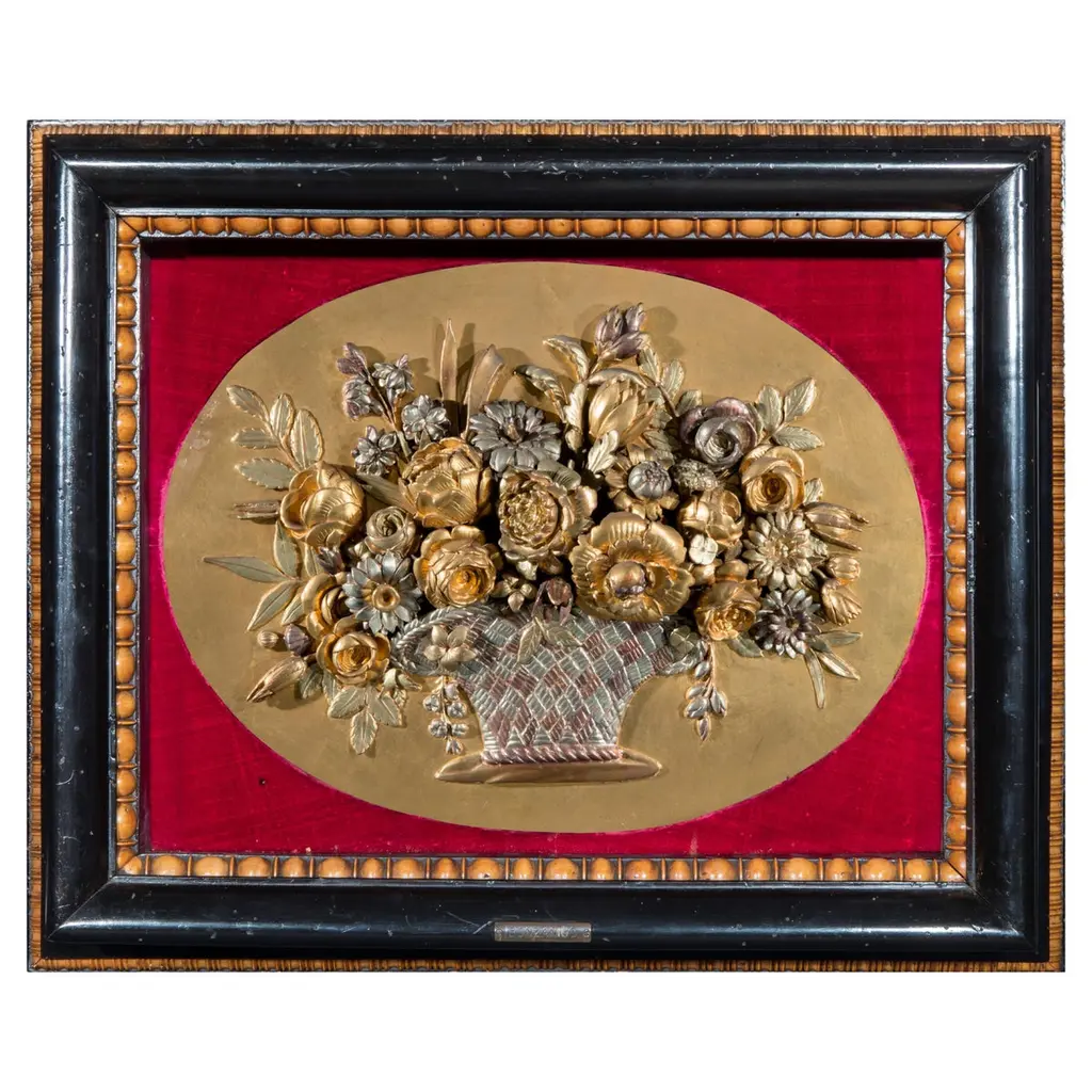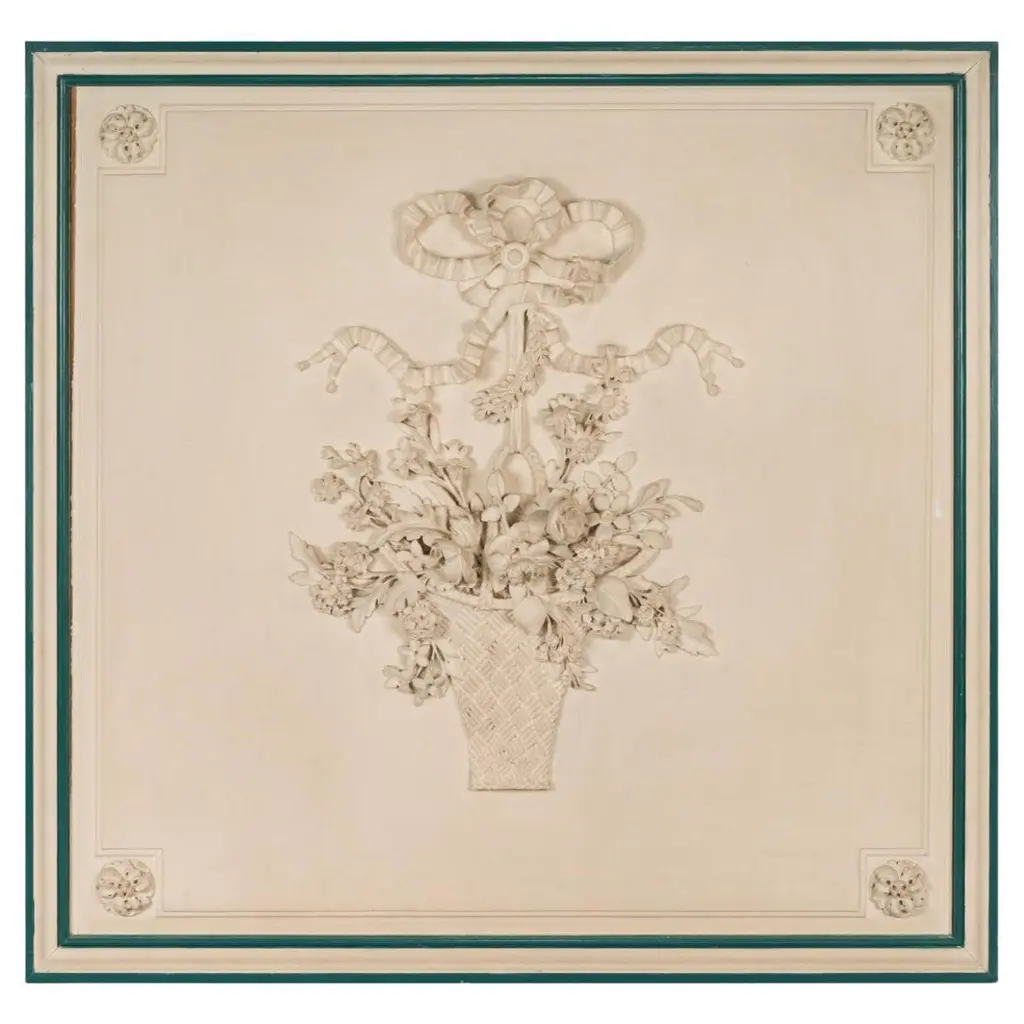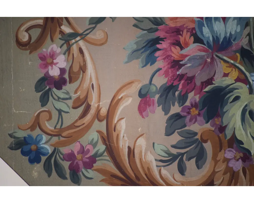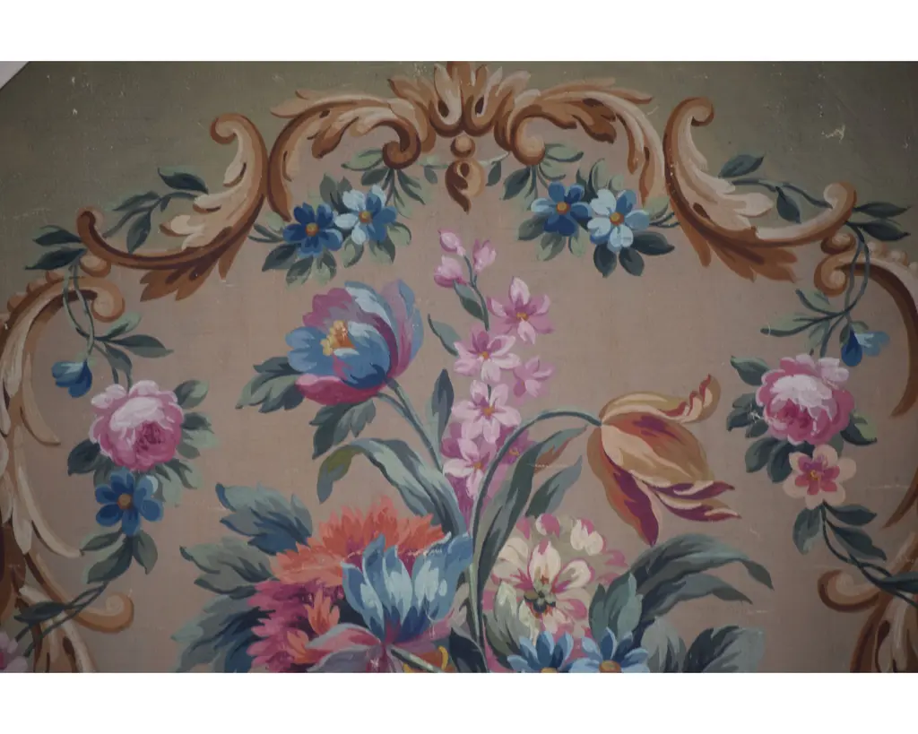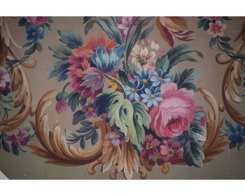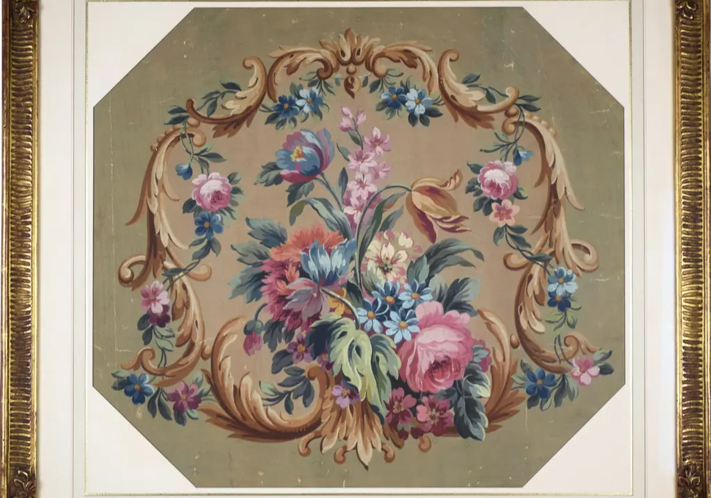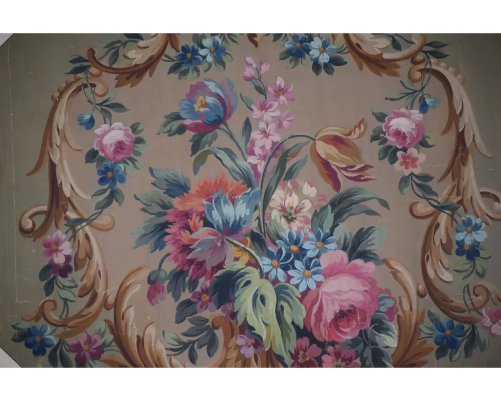 Late 18th-Early 19th Century Aubusson gouache painting of floral garlands in shades of pink, blue, and green against a tan background. Presented in french matting and carved gilt wood frame. Image size: 26" W x 23.25" H, overall framed measurements: 36.5" W x 33.75" H x 1.75" D