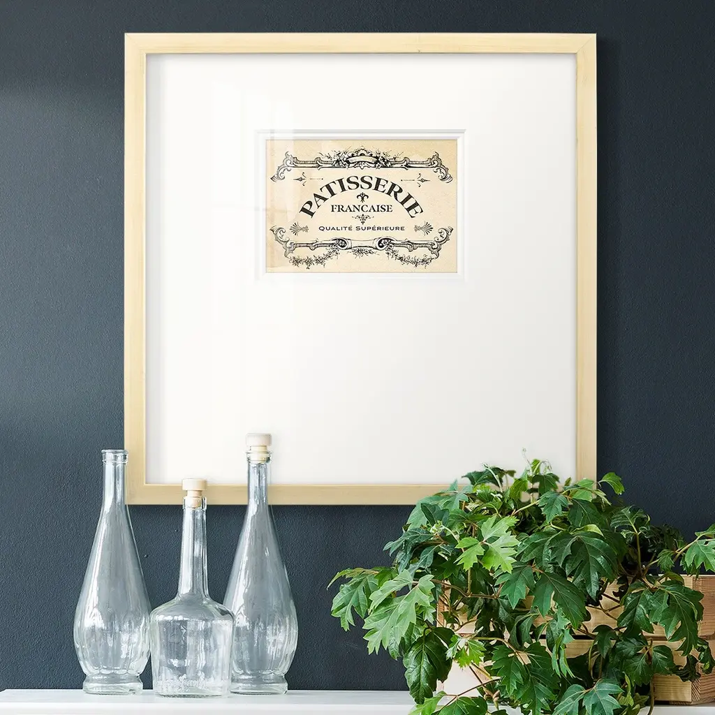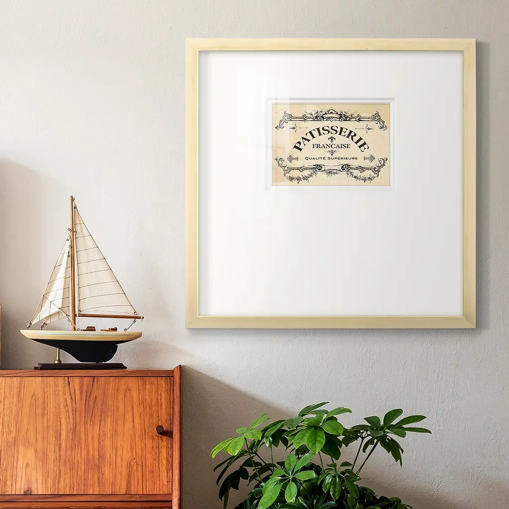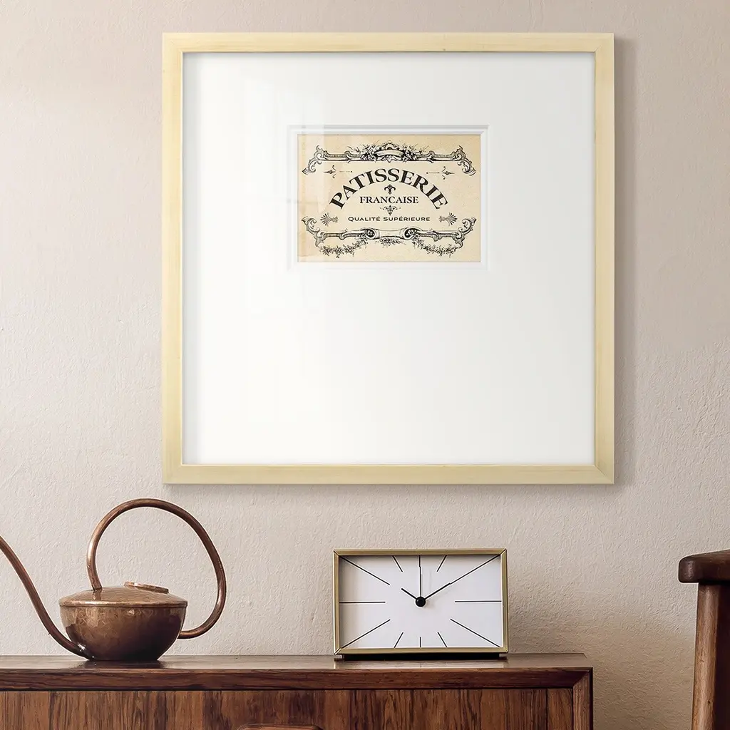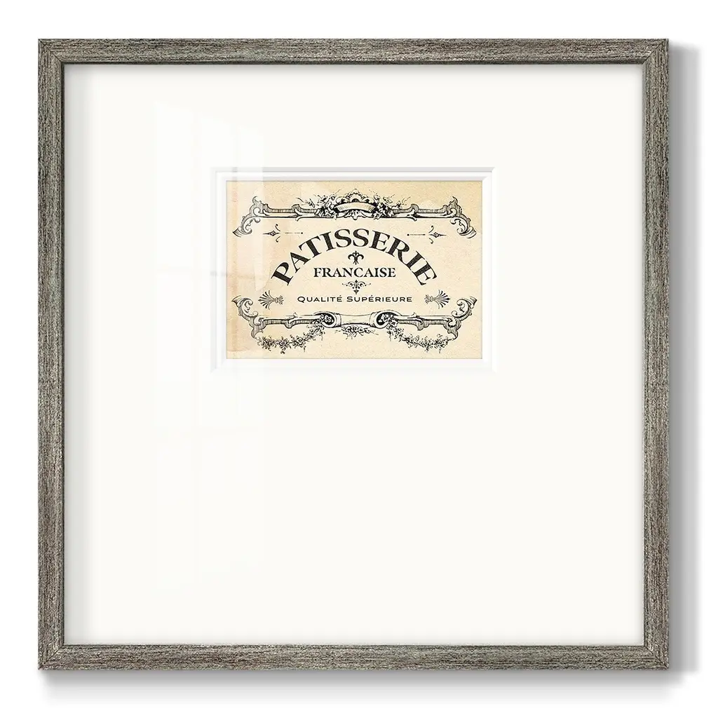 Antique French Label IPremium Framed Print A framed cold pressed paper print featuring superior double matting and quality frame. 2 SIZES AVAILABLE 16''X16''' - Overall Size 20''X20''' - Overall Size Each piece is made to order. Each piece comes with hanging hardware. Made in the USA Ready to Hang Giclee Paper Print Plexiglass Beveled Matt Board Double Matte Board