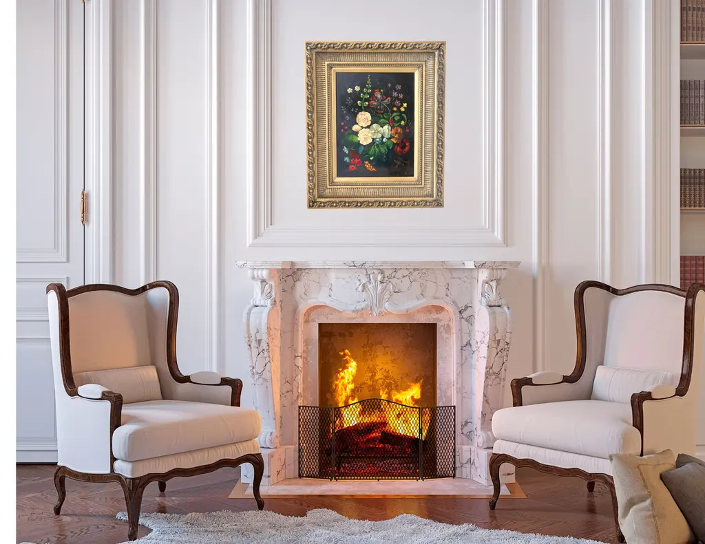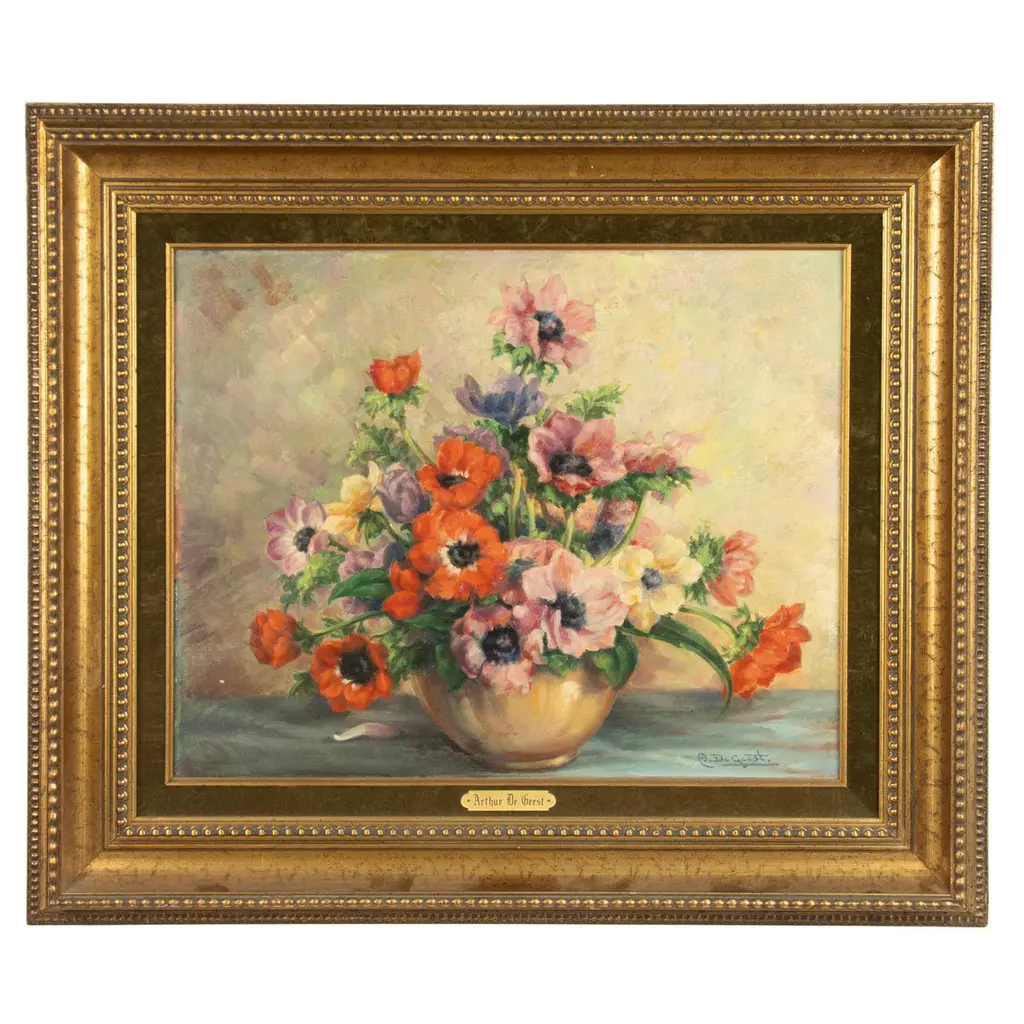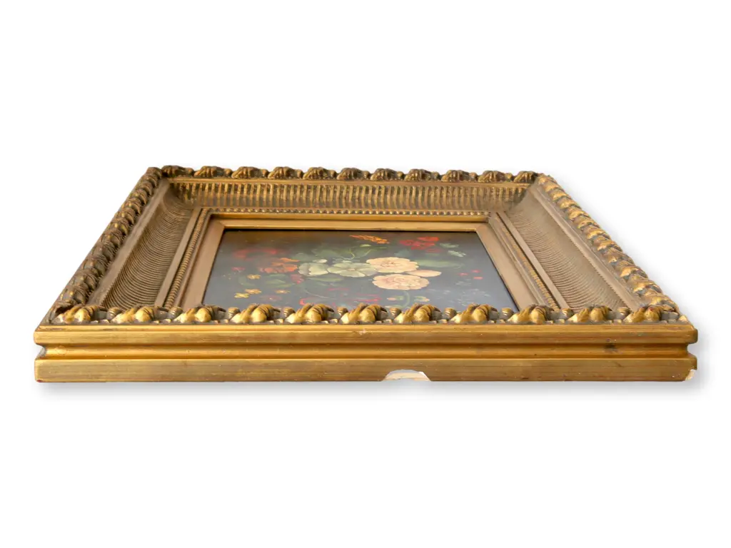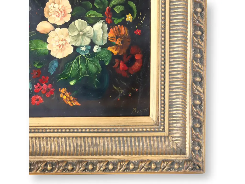 Antique French oil painting on board stands as a captivating testament to timeless artistry. Set against a deep black background, a vivid floral arrangement bursts forth, each bloom rendered with meticulous attention to detail and color. The richness of the flowers contrasts beautifully with the somber backdrop, creating an enchanting dance of light and shadow. Signed by the artist, Rosser, further accentuated by its ornate gilt frame, which adds a layer of opulence.