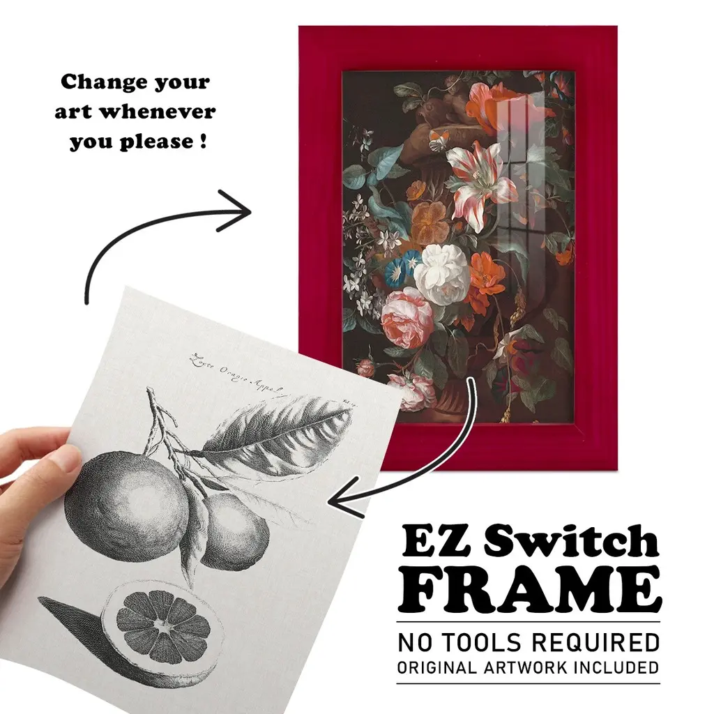 Antique Lemons & Oranges II -EZ SWITCH Framed Print w/glass-Cherry Red A delightful, framed print. Featuring a solid wood frame with real wood glass. This premium print is giclee quality. In addition, every frame features a removable back and table top stand. This allows you to change your art in the future or to just stand the art on a table for a new look. We are sure you'll enjoy our new series of EZ SWITCH Framed Art. Solid Wood Frame Real Glass Removable / Replaceable Art Built in Tabletop Stand Sizes range from 4x6 up to 12x15 - buy just one or pair them up as sets as you see fit.