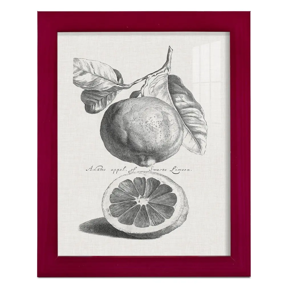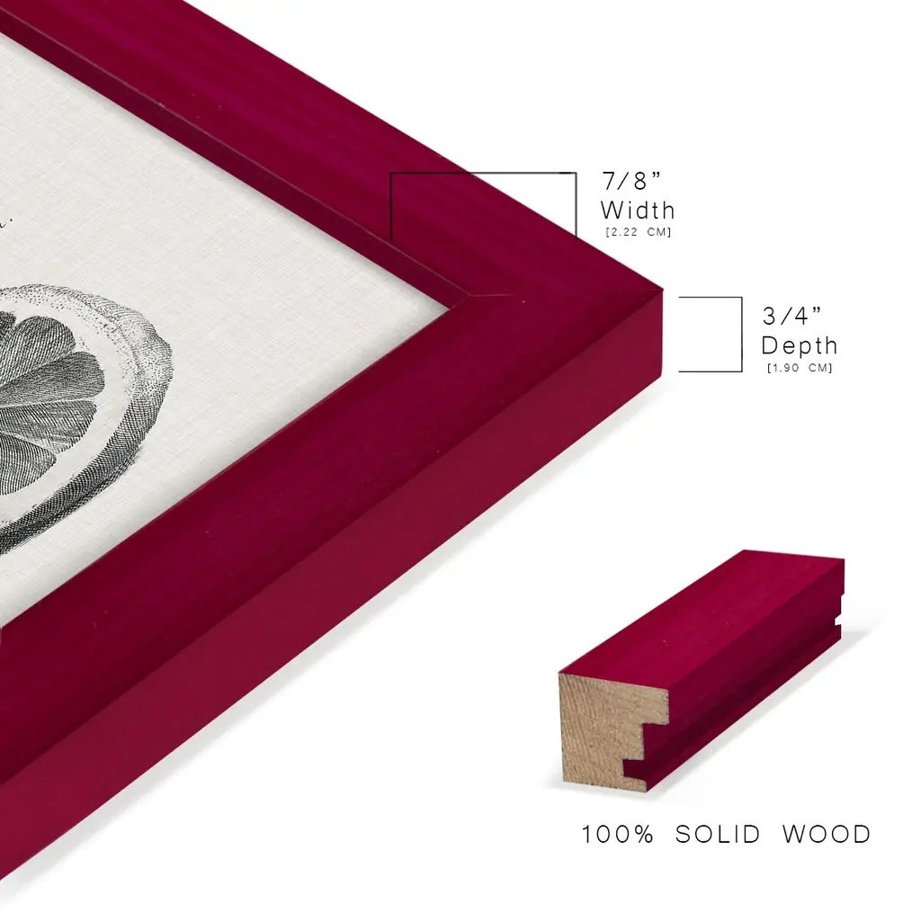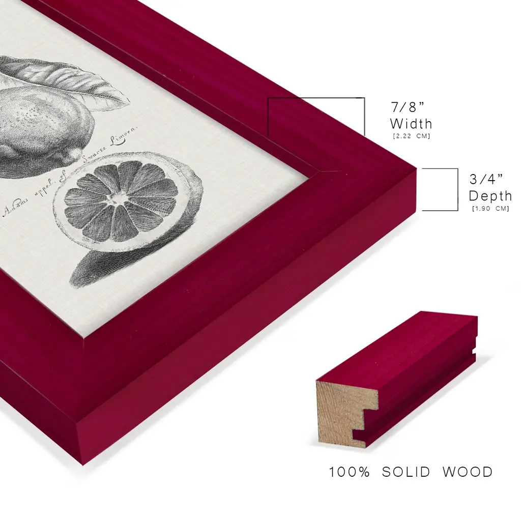 Antique Lemons & Oranges IV -EZ SWITCH Framed Print w/glass-Cherry Red A delightful, framed print. Featuring a solid wood frame with real wood glass. This premium print is giclee quality. In addition, every frame features a removable back and table top stand. This allows you to change your art in the future or to just stand the art on a table for a new look. We are sure you'll enjoy our new series of EZ SWITCH Framed Art. Solid Wood Frame Real Glass Removable / Replaceable Art Built in Tabletop Stand Sizes range from 4x6 up to 12x15 - buy just one or pair them up as sets as you see fit.