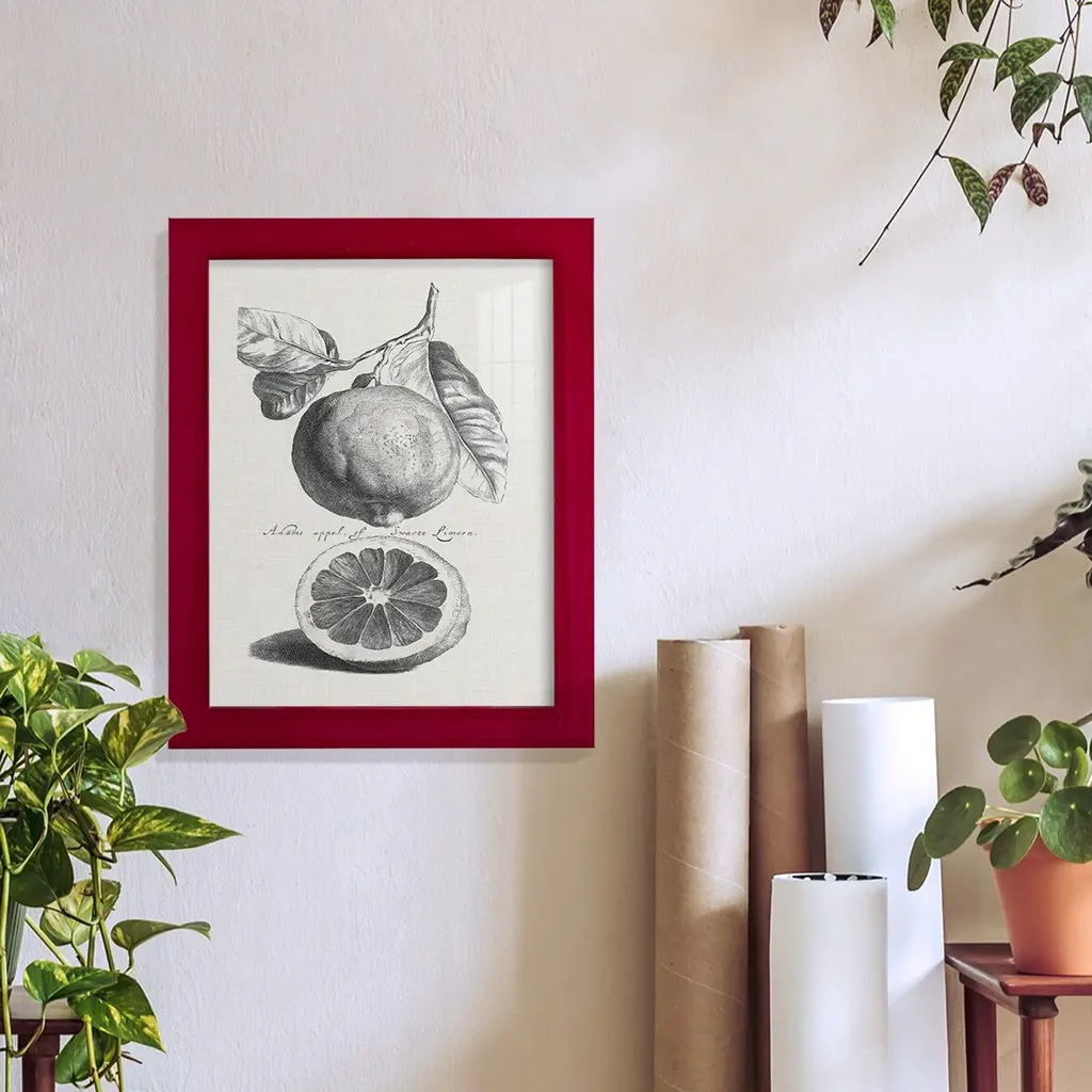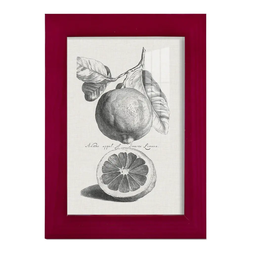 Antique Lemons & Oranges IV -EZ SWITCH Framed Print w/glass-Cherry Red A delightful, framed print. Featuring a solid wood frame with real wood glass. This premium print is giclee quality. In addition, every frame features a removable back and table top stand. This allows you to change your art in the future or to just stand the art on a table for a new look. We are sure you'll enjoy our new series of EZ SWITCH Framed Art. Solid Wood Frame Real Glass Removable / Replaceable Art Built in Tabletop Stand Sizes range from 4x6 up to 12x15 - buy just one or pair them up as sets as you see fit.