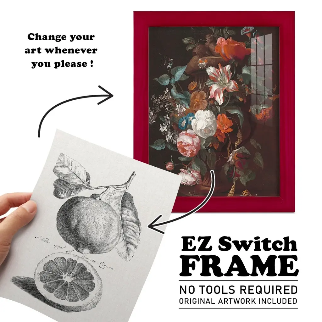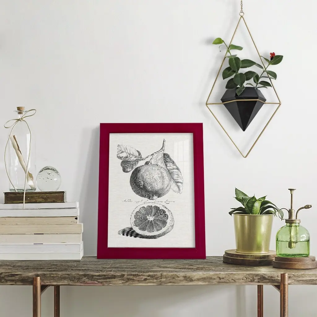 Antique Lemons & Oranges IV -EZ SWITCH Framed Print w/glass-Cherry Red A delightful, framed print. Featuring a solid wood frame with real wood glass. This premium print is giclee quality. In addition, every frame features a removable back and table top stand. This allows you to change your art in the future or to just stand the art on a table for a new look. We are sure you'll enjoy our new series of EZ SWITCH Framed Art. Solid Wood Frame Real Glass Removable / Replaceable Art Built in Tabletop Stand Sizes range from 4x6 up to 12x15 - buy just one or pair them up as sets as you see fit.