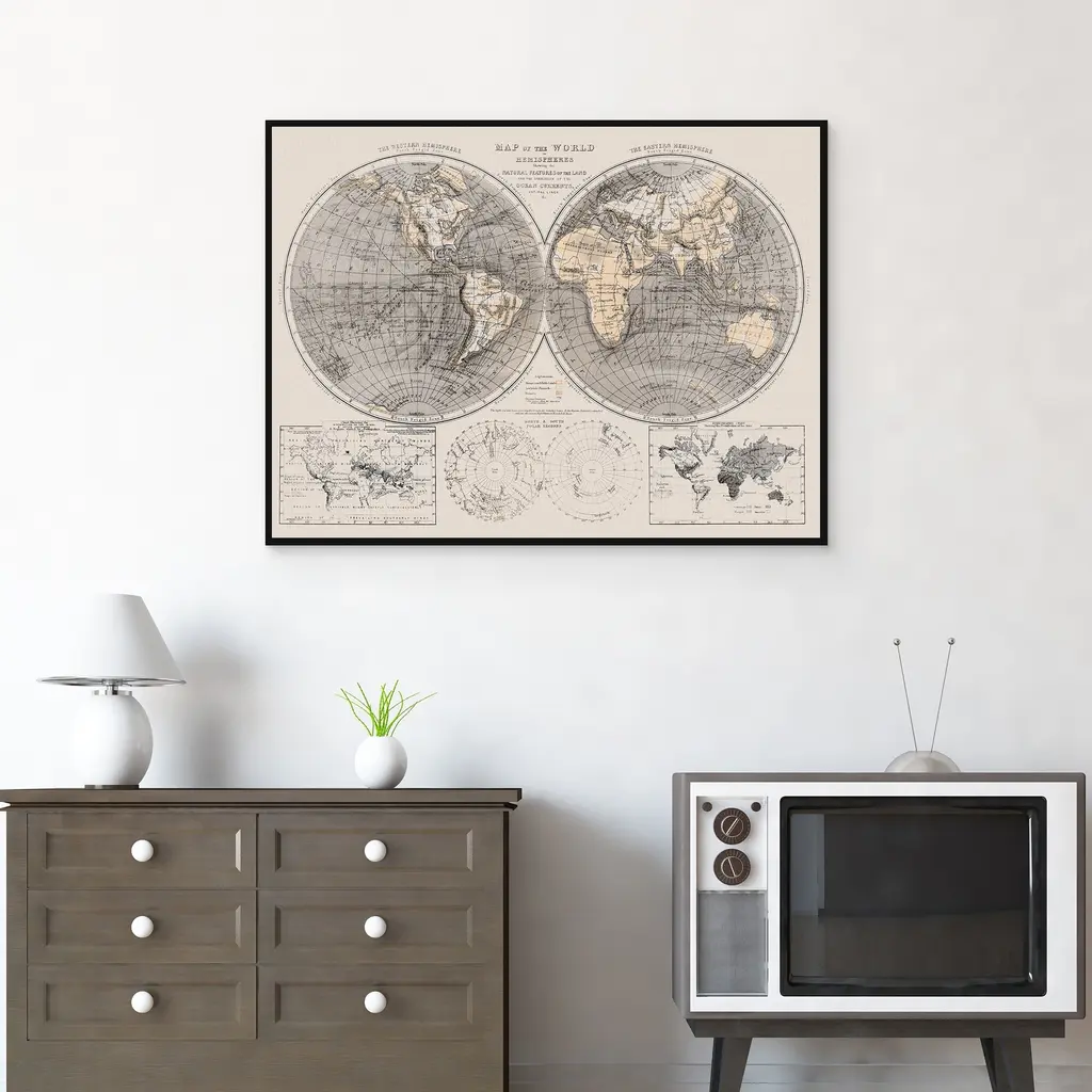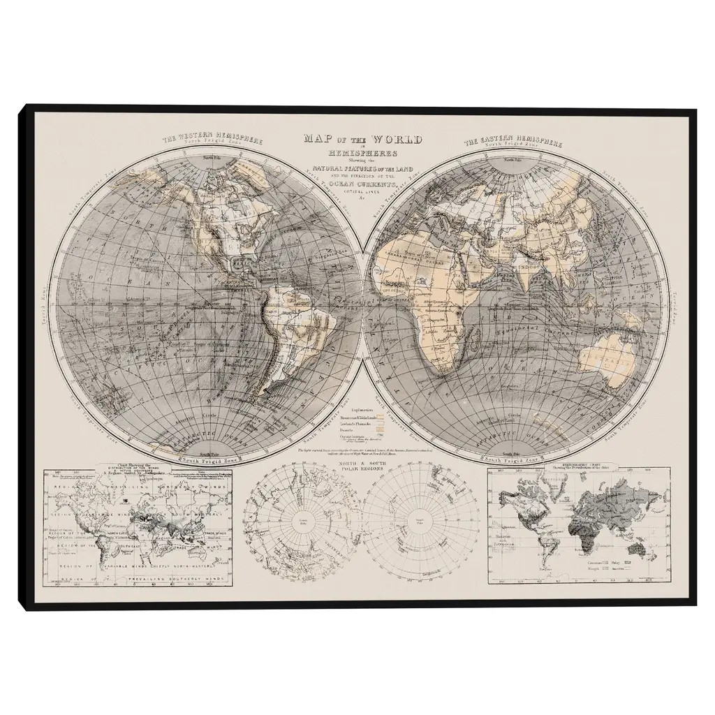 Various maps of the world converge at the center of this impressive antique-style print, rendered with remarkable detail by a skilled hand. This remarkable print features intricately gridded patterns that demonstrate the nuanced curve of the planet and supply the maps with an illusion of depth. Printed in a soft, neutral color palette, this elegant canvas print is perfect for adding a luxurious and timeless elegance to your home. Made with superior materials using state-of-the-art printing technology, our giclee canvas prints are made with exceptional detail. Your new masterpiece comes ready to hang, equipped with a hand-crafted frame for a luxurious gallery look.