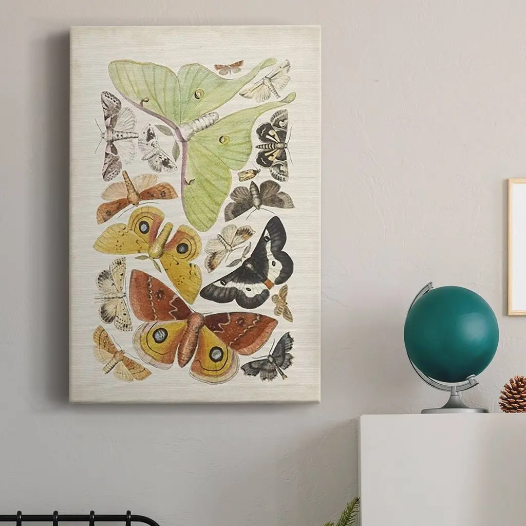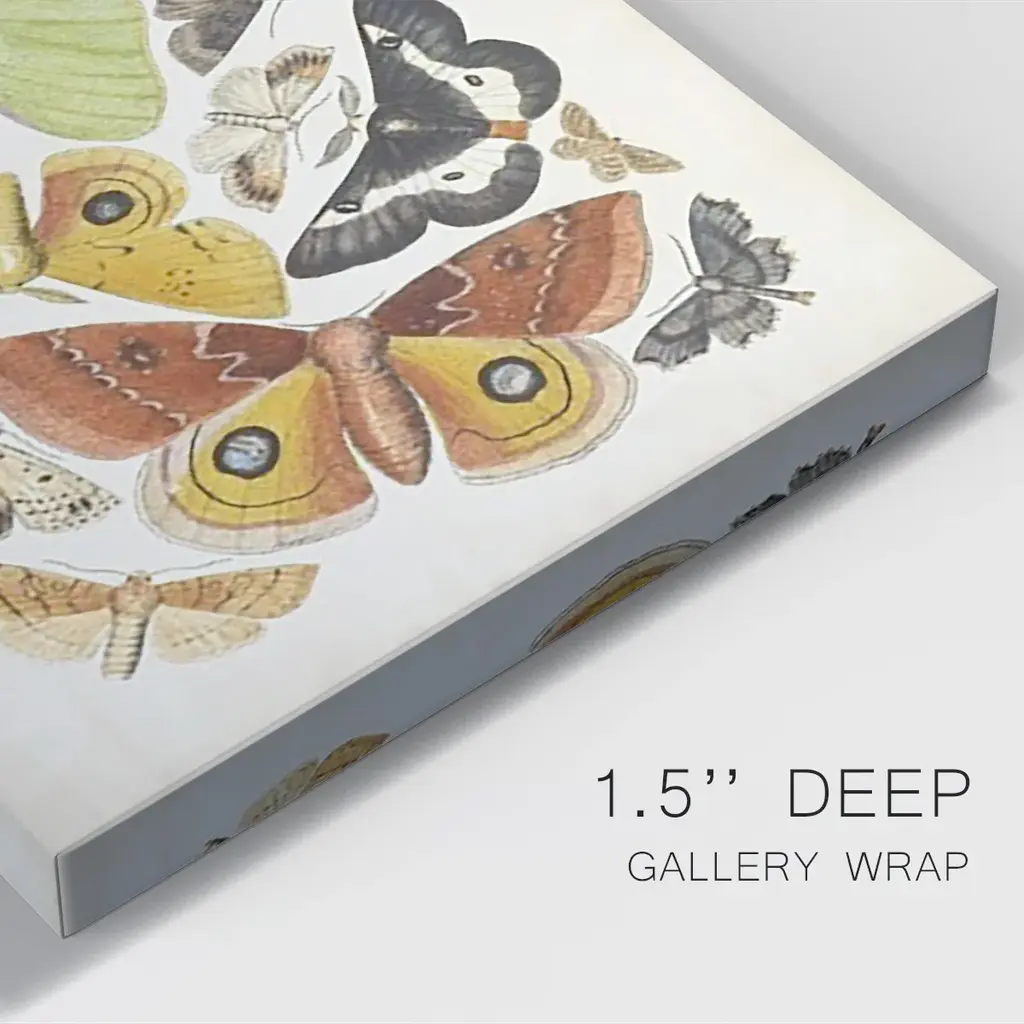 Antique Moths I Premium Gallery Wrapped Canvas - Ready to Hang A premium hand stretched gallery wrapped canvas print created to last. Featuring a beveled a solid wood stretcher bar, each piece comes ready to hand 6 SIZES AVAILABLE 8''X12'' - Overall Size 12''X18'' - Overall Size 18''X27'' - Overall Size 24''x36'' - Overall Size 32''x48'' - Overall Size 40''x60'' - Overall Size Each piece is made to order. Built to Last Each piece comes ready to hang Solid wood stretcher Fade and Water resistant Made domestically