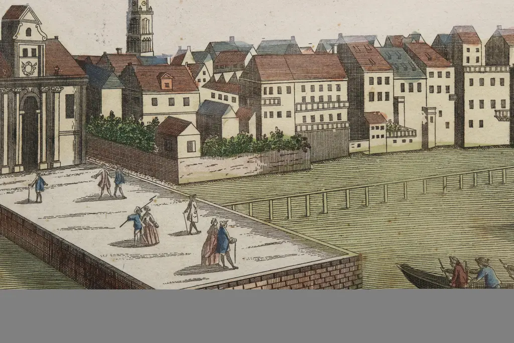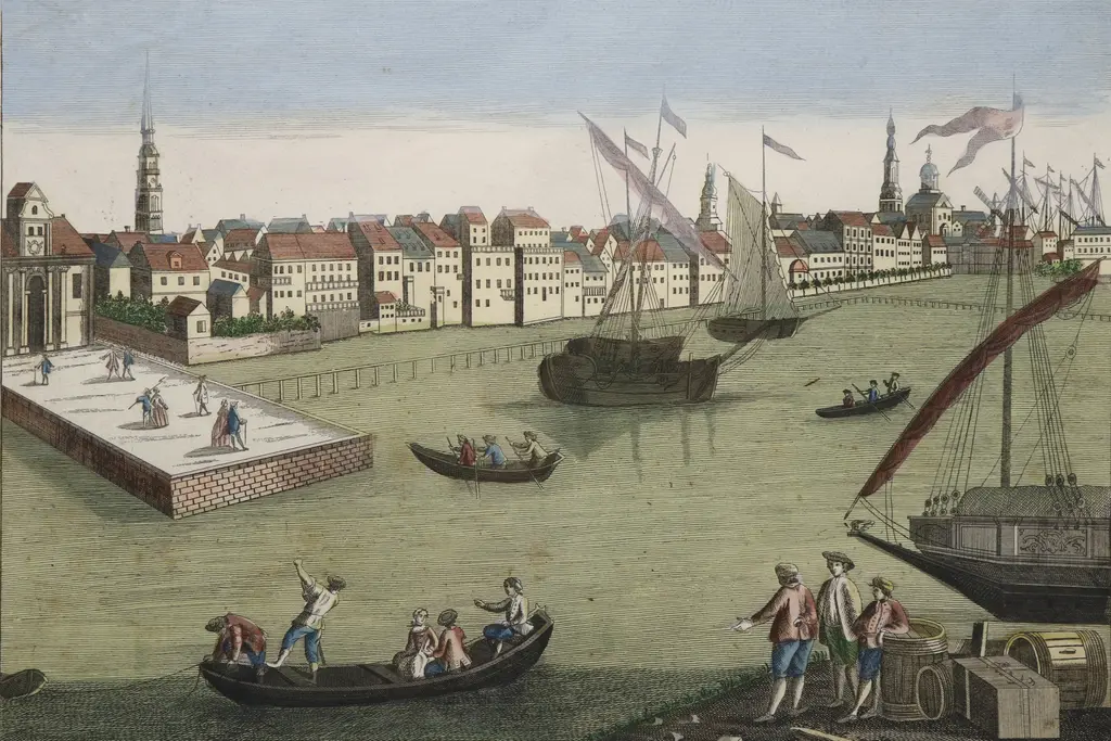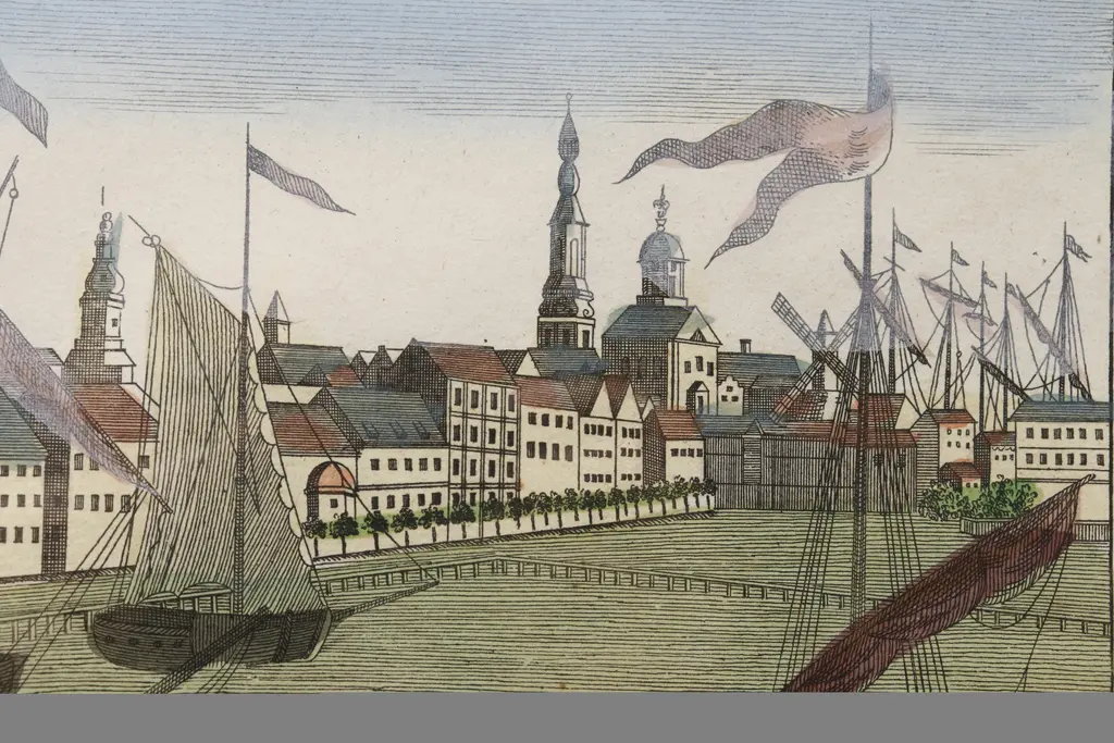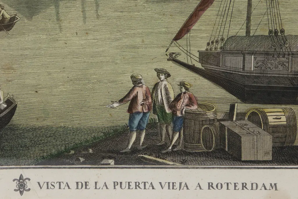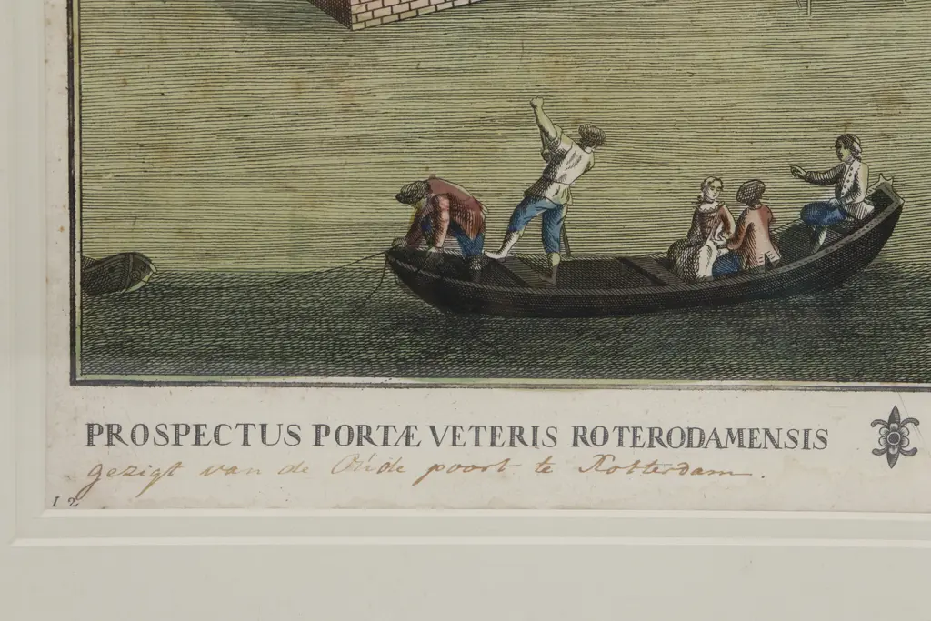 An antique hand colored engraving showing the port of Rotterdam. Inscribed in Latin and Italian “Prospectus port�� veteris roterodamensis / vista de la puerta vieja a roterdam” which translates to ‘View of the old gate to Rotterdam.’
