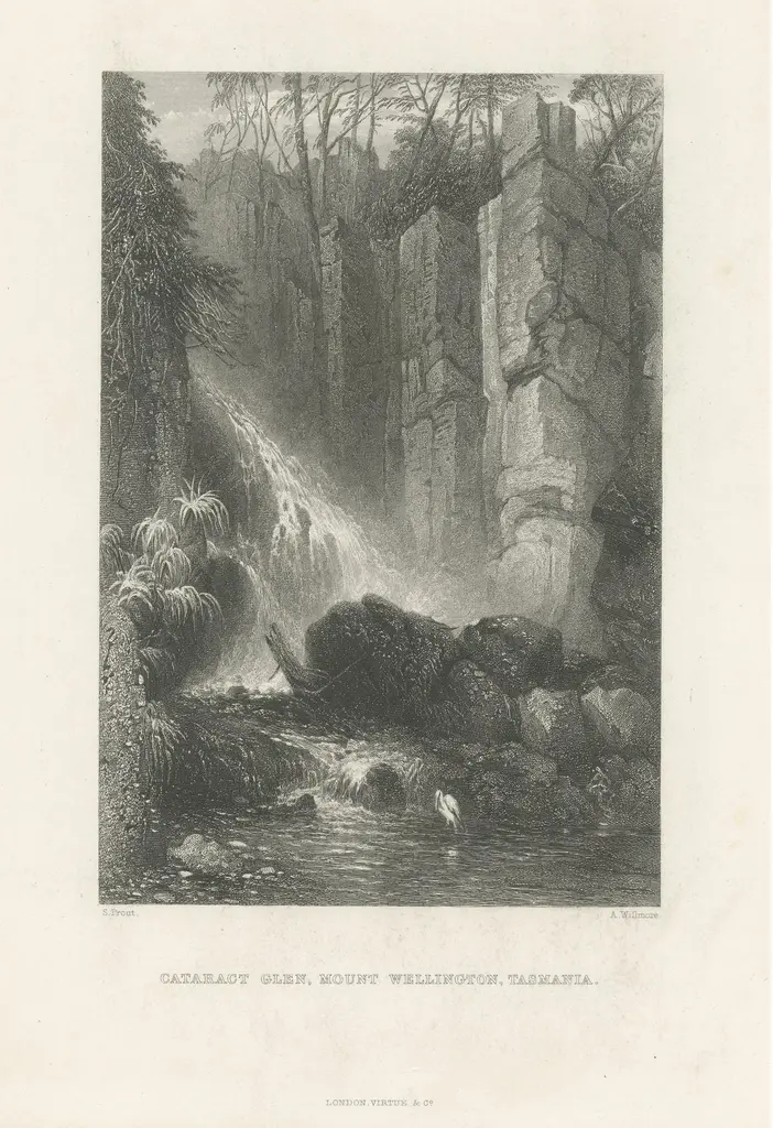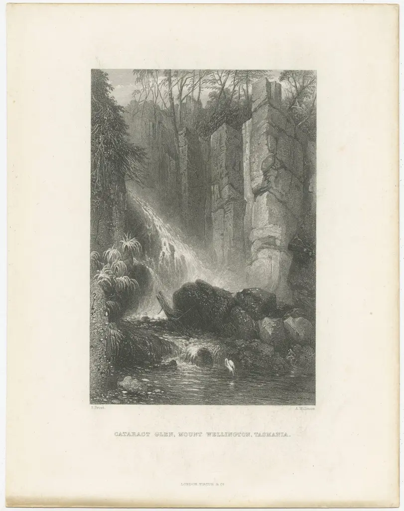 Antique print titled 'Cataract Glen, Mount Wellington, Tasmania'. View of a lovely waterfall with a heron, near Mount Wellington in Tasmania, Australia. Engraved by A. Willmore after S. Prout. Published by Virtue & Co, circa 1875.