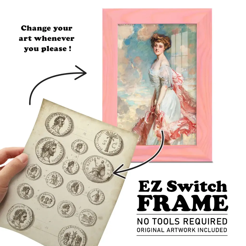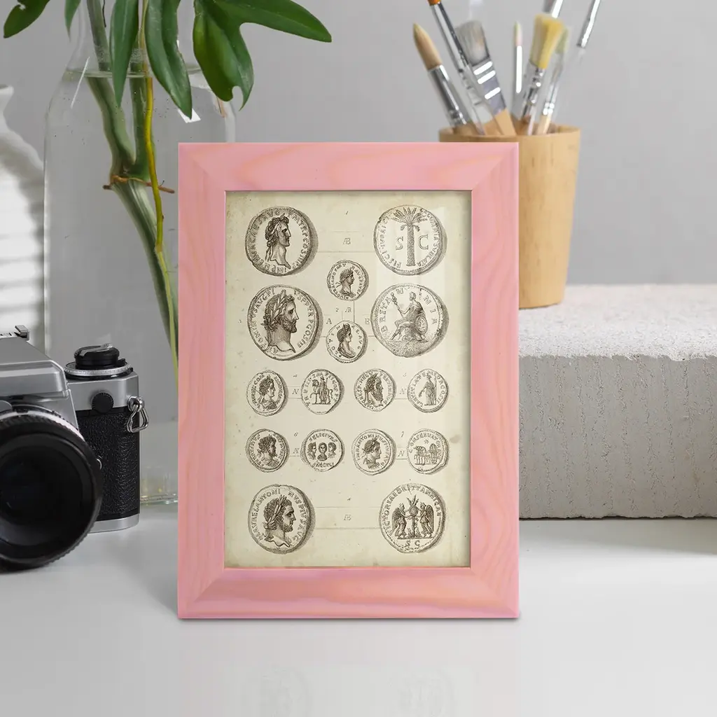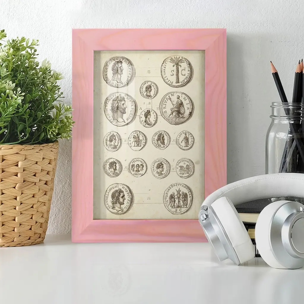 Antique Roman Coins IV -EZ SWITCH Framed Print w/glass-Cherry Red A delightful, framed print. Featuring a solid wood frame with real wood glass. This premium print is giclee quality. In addition, every frame features a removable back and table top stand. This allows you to change your art in the future or to just stand the art on a table for a new look. We are sure you'll enjoy our new series of EZ SWITCH Framed Art. Solid Wood Frame Real Glass Removable / Replaceable Art Built in Tabletop Stand Sizes range from 4x6 up to 12x15 - buy just one or pair them up as sets as you see fit.