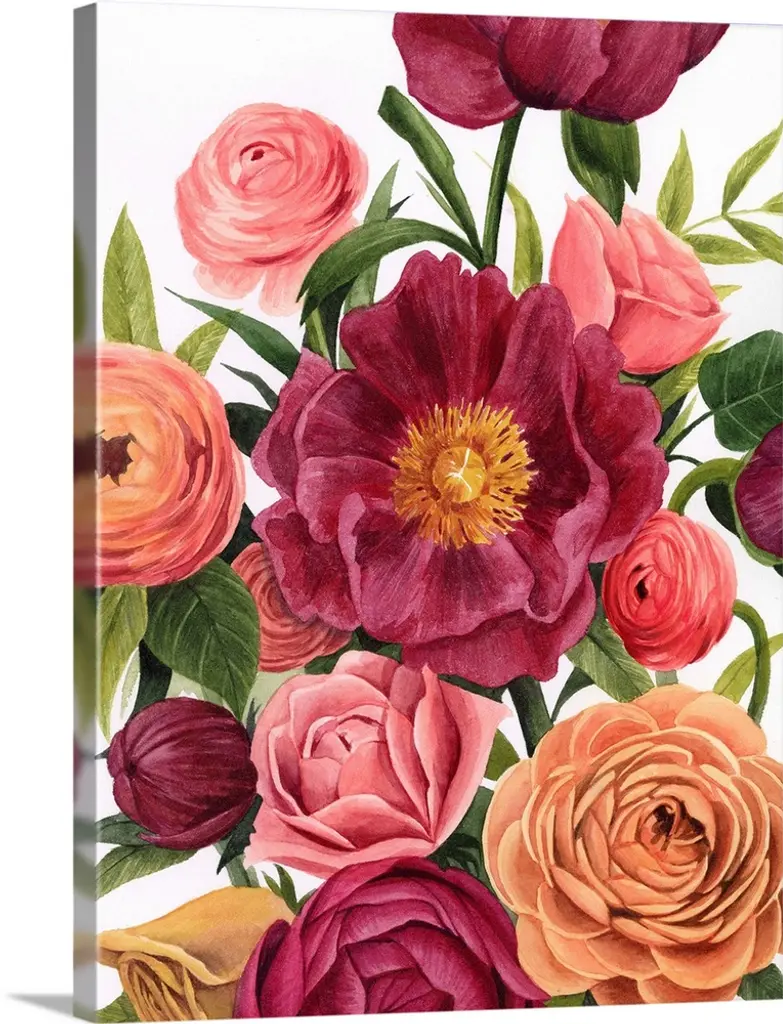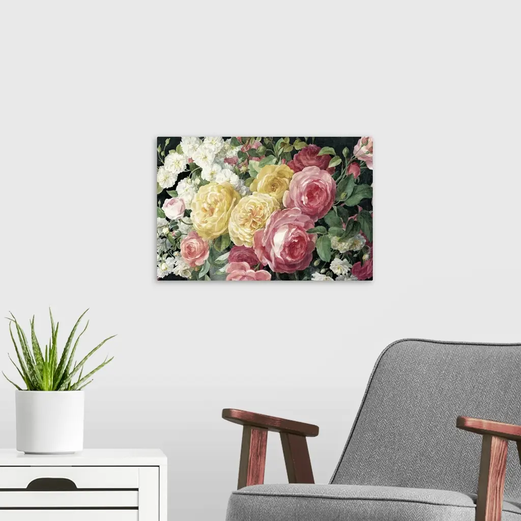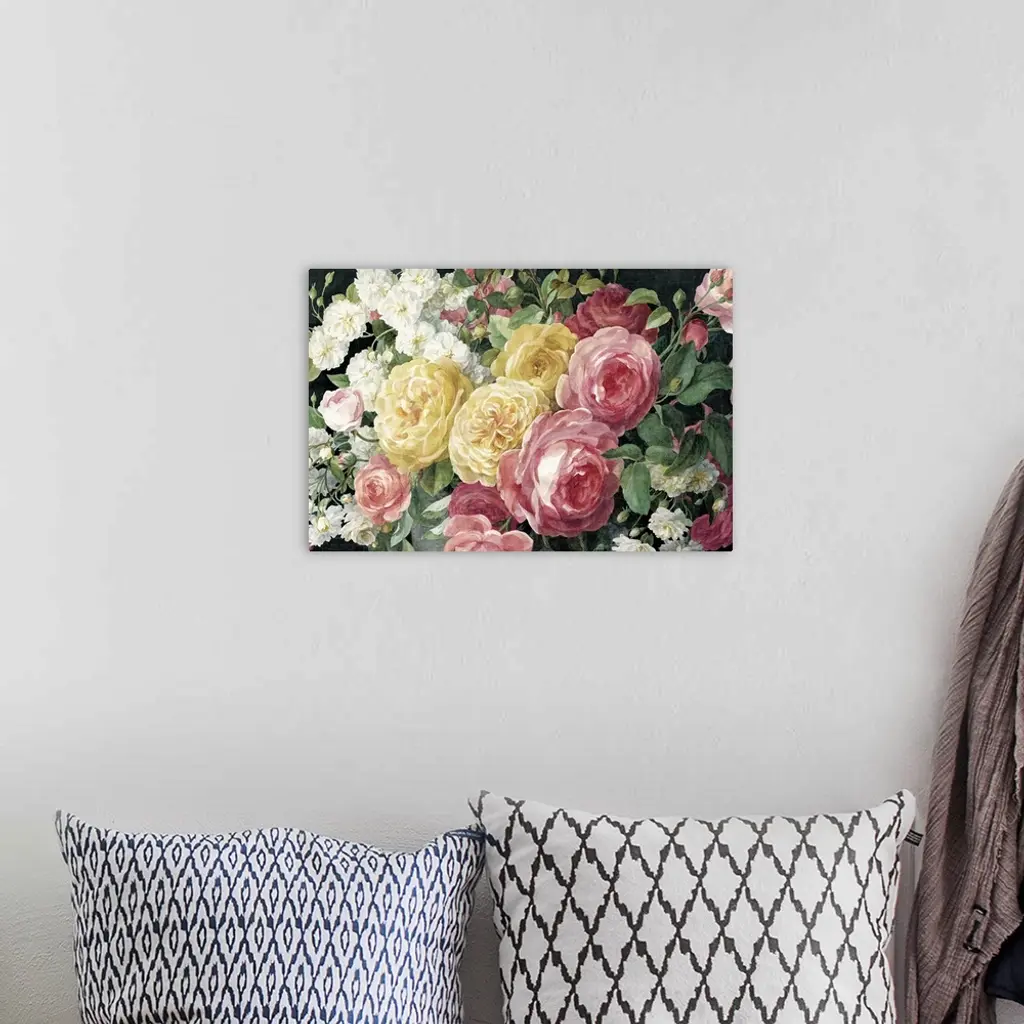Contemporary still life painting of large pink and yellow roses in an antique style.