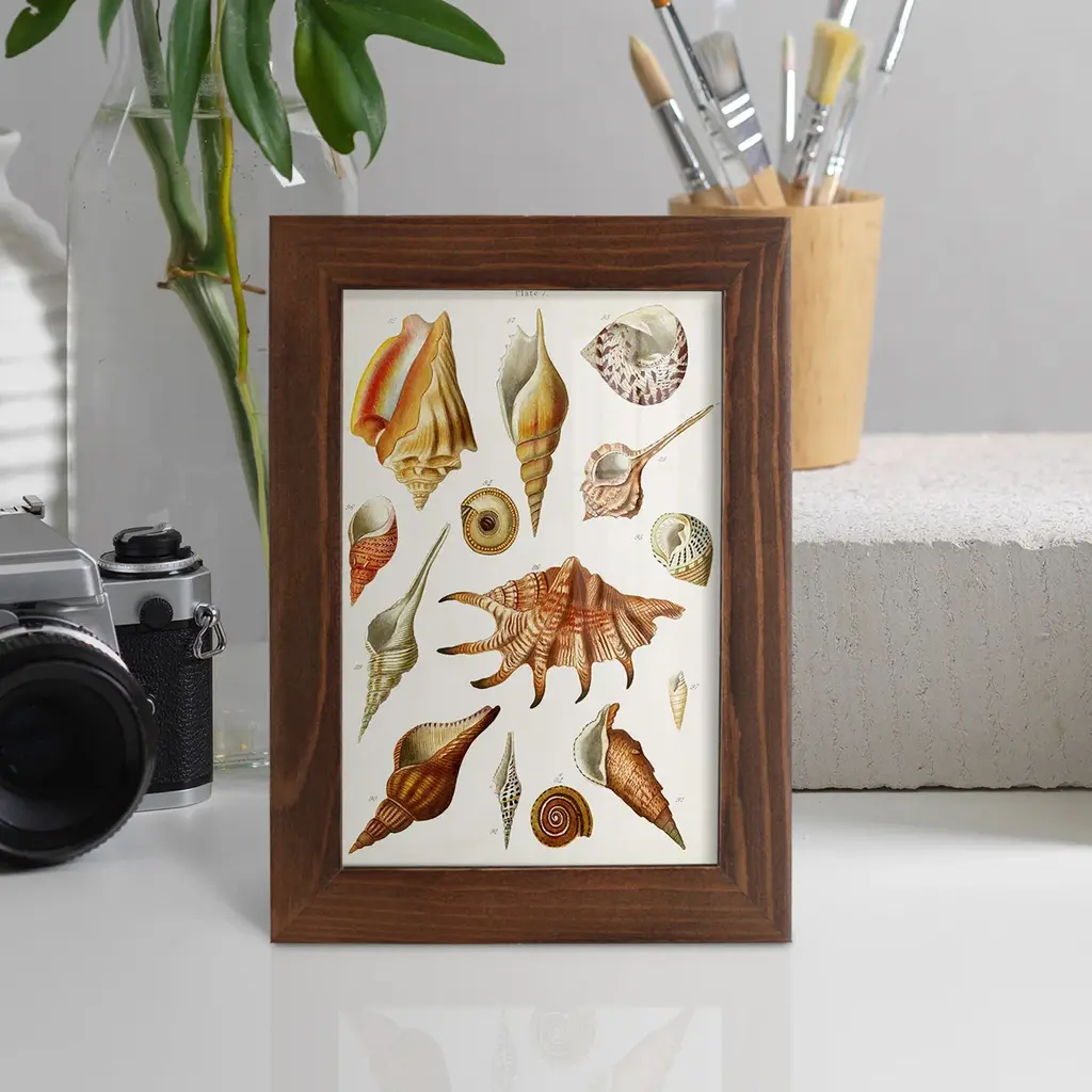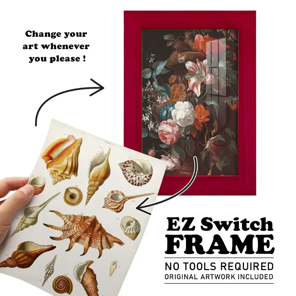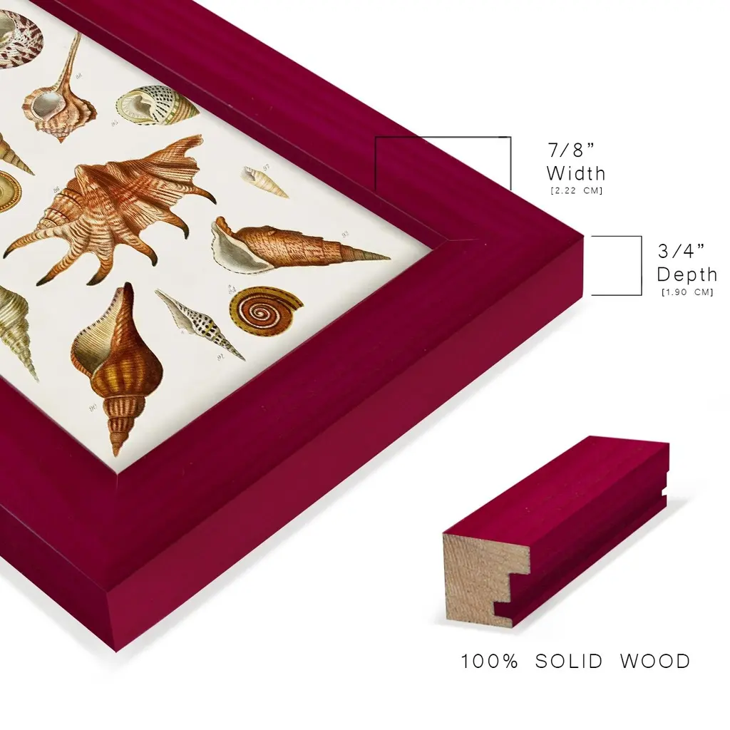 Antique Shell Collection II -EZ SWITCH Framed Print w/glass-Cherry Red A delightful, framed print. Featuring a solid wood frame with real wood glass. This premium print is giclee quality. In addition, every frame features a removable back and table top stand. This allows you to change your art in the future or to just stand the art on a table for a new look. We are sure you'll enjoy our new series of EZ SWITCH Framed Art. Solid Wood Frame Real Glass Removable / Replaceable Art Built in Tabletop Stand Sizes range from 4x6 up to 12x15 - buy just one or pair them up as sets as you see fit.
