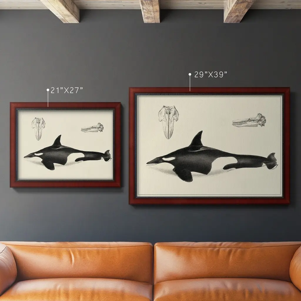 Antique Whale Study I Premium Framed Canvas- Ready to Hang A Premium Framed Canvas created to last. Framed in distressed wood and available in an array of sizes and colors Featuring a beveled a solid wood stretcher bar, each piece comes ready to hand 3 SIZES AVAILABLE 16''X20'' - Overall Size 18'X27'' - Overall Size 24''x36'' - Overall Size Each piece is made to order. Each piece comes with hanging hardware. Made in the USA Ready to Hang Giclee Paper Print Acrylic Glass Beveled Matt Board