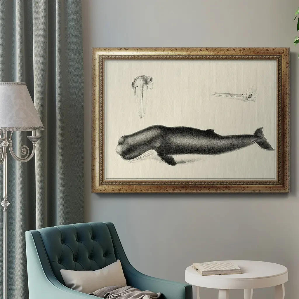 Antique Whale Study II Premium Framed Canvas- Ready to Hang A Premium Framed Canvas created to last. Framed in distressed wood and available in an array of sizes and colors Featuring a beveled a solid wood stretcher bar, each piece comes ready to hand 3 SIZES AVAILABLE 16''X20'' - Overall Size 18'X27'' - Overall Size 24''x36'' - Overall Size Each piece is made to order. Each piece comes with hanging hardware. Made in the USA Ready to Hang Giclee Paper Print Acrylic Glass Beveled Matt Board
