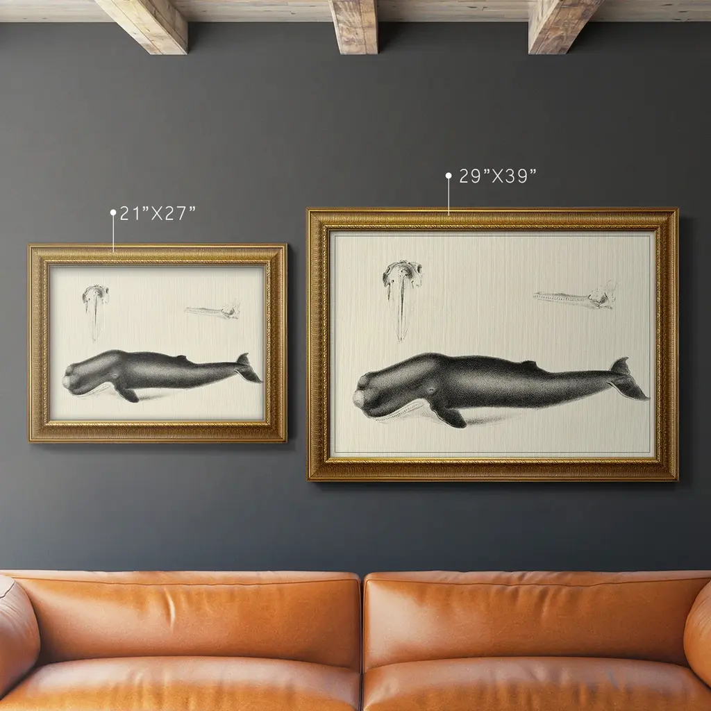 Antique Whale Study II Premium Framed Canvas- Ready to Hang A Premium Framed Canvas created to last. Framed in distressed wood and available in an array of sizes and colors Featuring a beveled a solid wood stretcher bar, each piece comes ready to hand 3 SIZES AVAILABLE 16''X20'' - Overall Size 18'X27'' - Overall Size 24''x36'' - Overall Size Each piece is made to order. Each piece comes with hanging hardware. Made in the USA Ready to Hang Giclee Paper Print Acrylic Glass Beveled Matt Board
