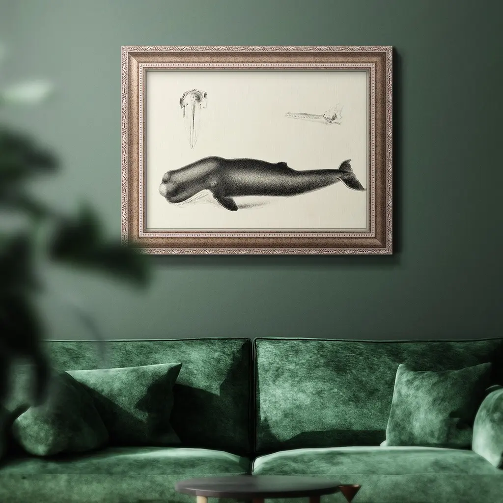 Antique Whale Study II Premium Framed Canvas- Ready to Hang A Premium Framed Canvas created to last. Framed in distressed wood and available in an array of sizes and colors Featuring a beveled a solid wood stretcher bar, each piece comes ready to hand 3 SIZES AVAILABLE 16''X20'' - Overall Size 18'X27'' - Overall Size 24''x36'' - Overall Size Each piece is made to order. Each piece comes with hanging hardware. Made in the USA Ready to Hang Giclee Paper Print Acrylic Glass Beveled Matt Board