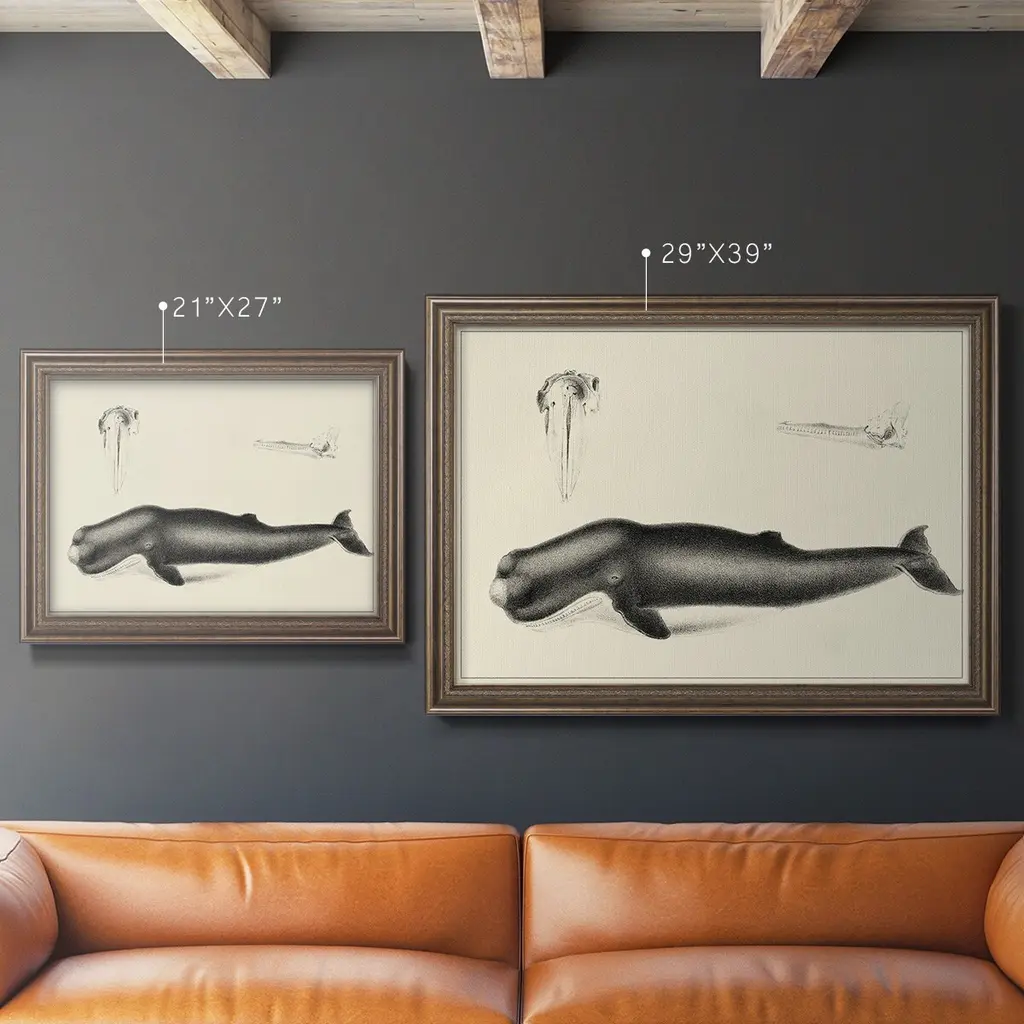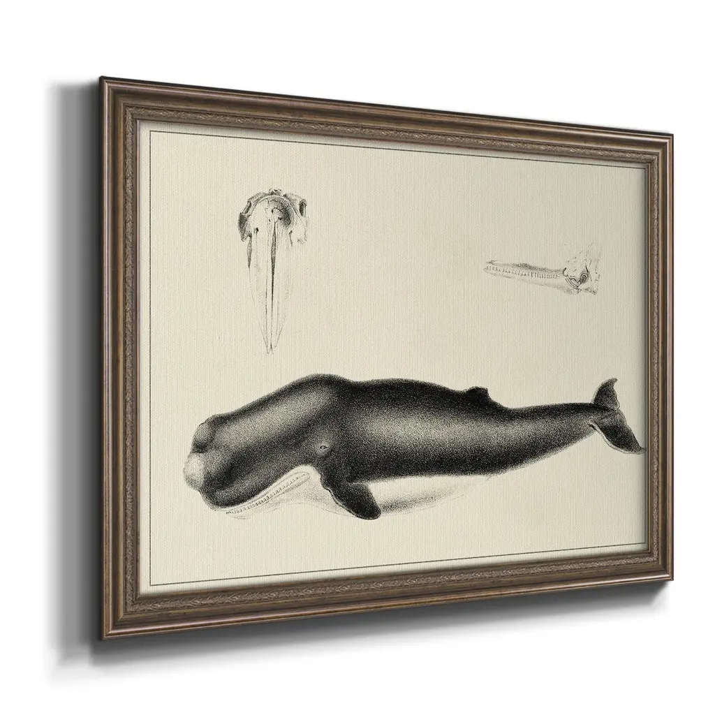 Antique Whale Study II Premium Framed Canvas- Ready to Hang A Premium Framed Canvas created to last. Framed in distressed wood and available in an array of sizes and colors Featuring a beveled a solid wood stretcher bar, each piece comes ready to hand 3 SIZES AVAILABLE 16''X20'' - Overall Size 18'X27'' - Overall Size 24''x36'' - Overall Size Each piece is made to order. Each piece comes with hanging hardware. Made in the USA Ready to Hang Giclee Paper Print Acrylic Glass Beveled Matt Board