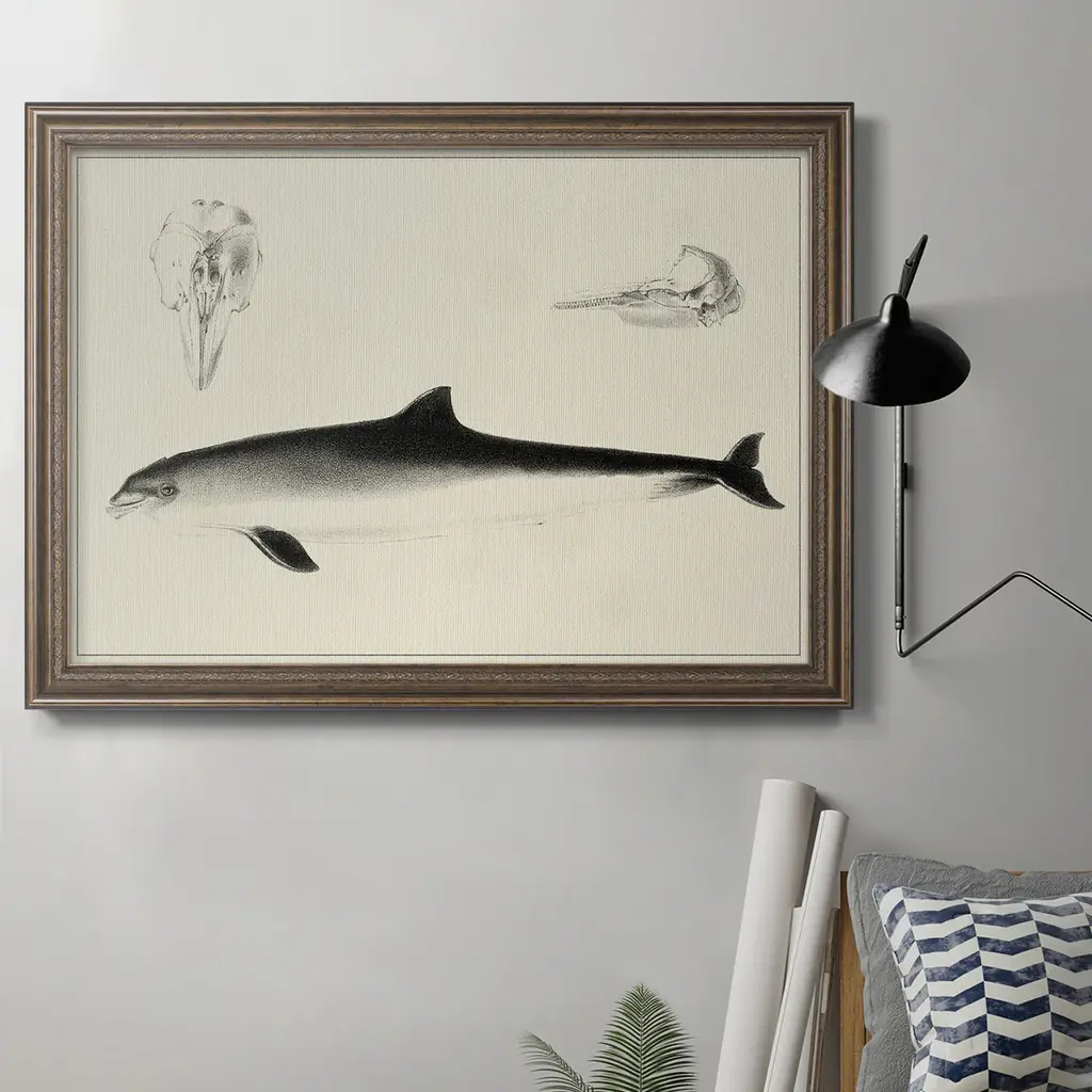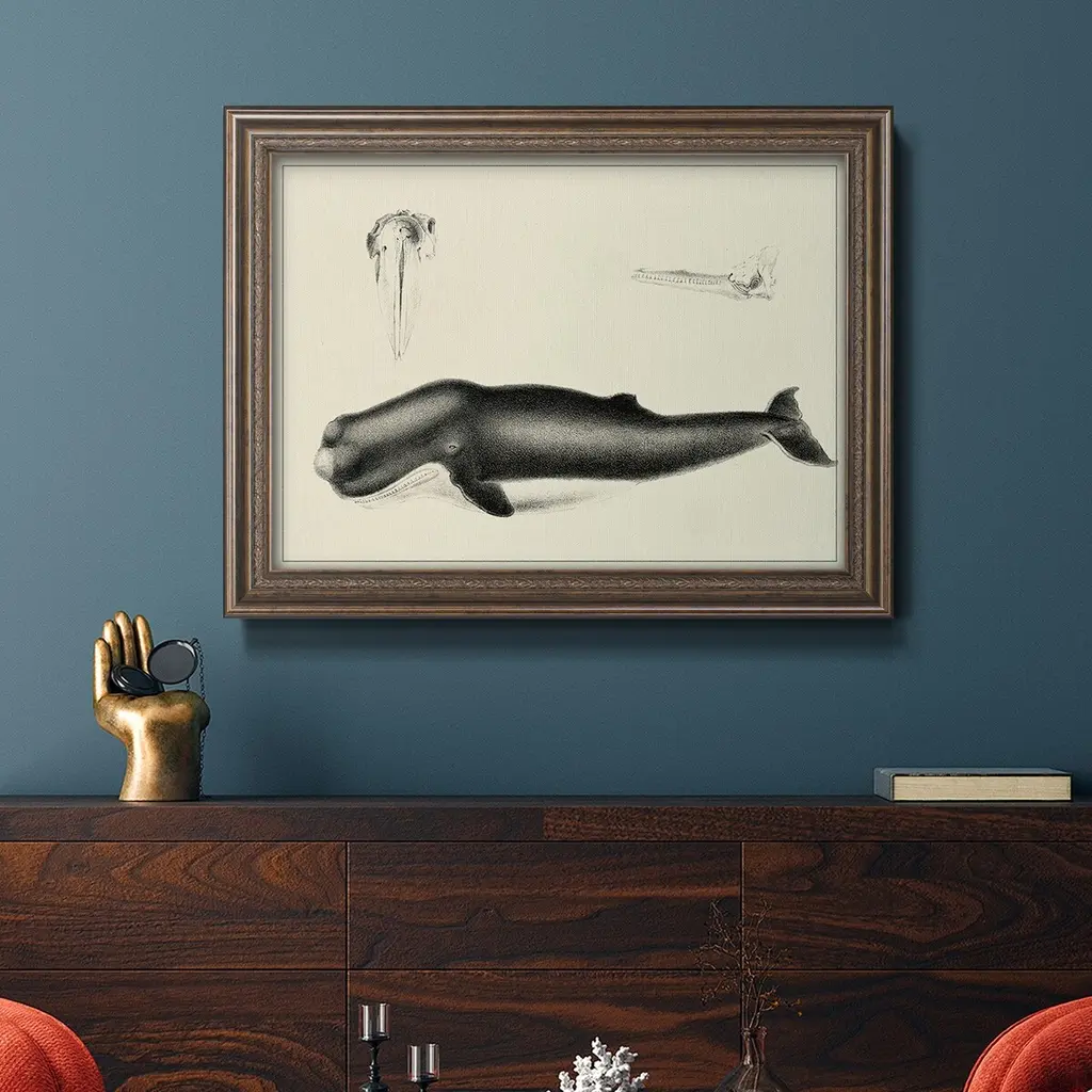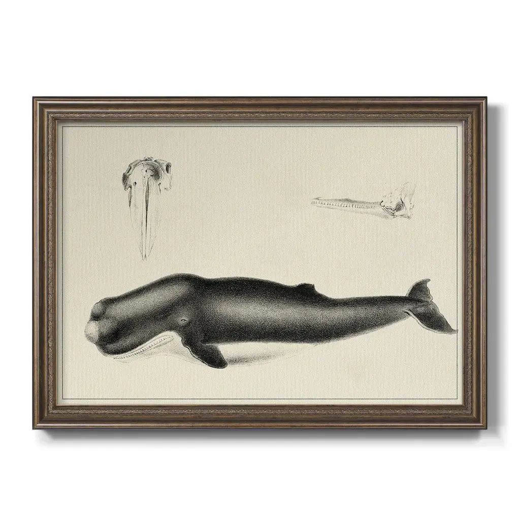 Antique Whale Study II Premium Framed Canvas- Ready to Hang A Premium Framed Canvas created to last. Framed in distressed wood and available in an array of sizes and colors Featuring a beveled a solid wood stretcher bar, each piece comes ready to hand 3 SIZES AVAILABLE 16''X20'' - Overall Size 18'X27'' - Overall Size 24''x36'' - Overall Size Each piece is made to order. Each piece comes with hanging hardware. Made in the USA Ready to Hang Giclee Paper Print Acrylic Glass Beveled Matt Board