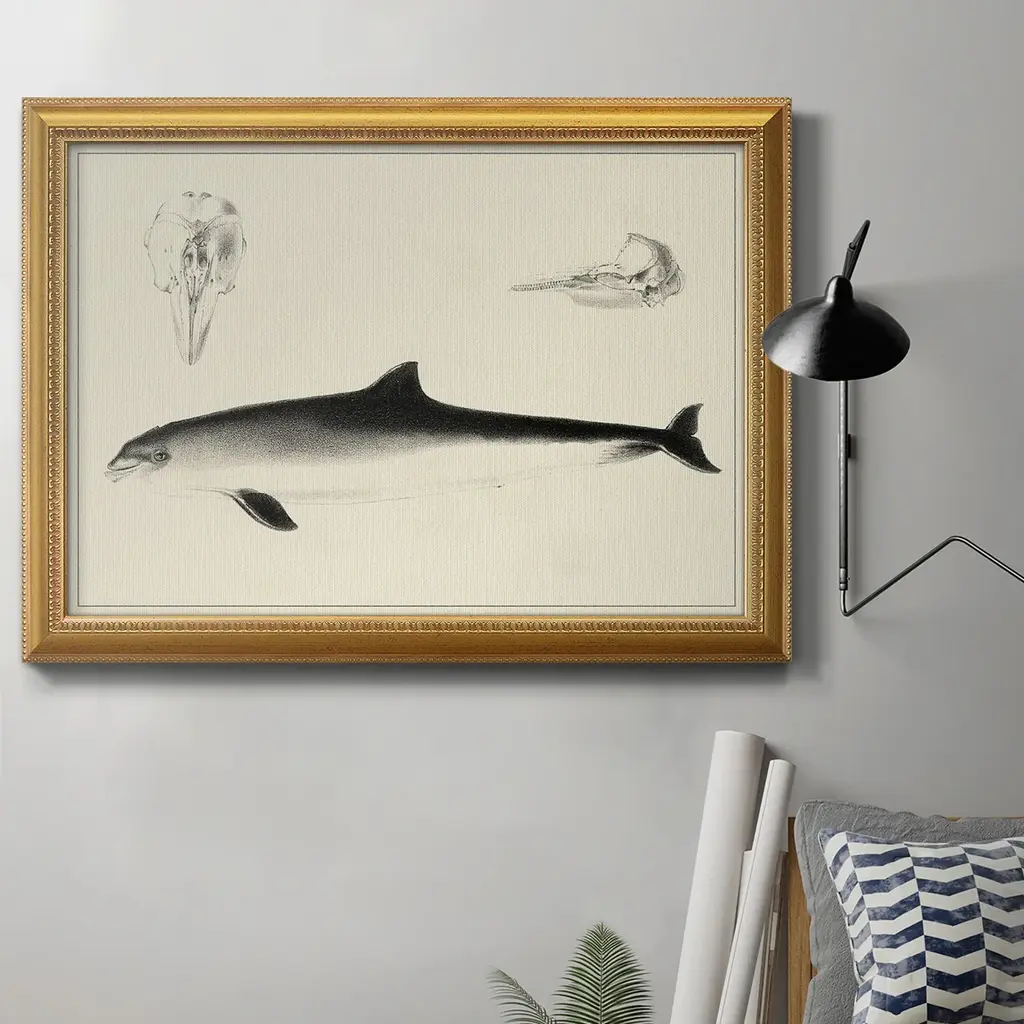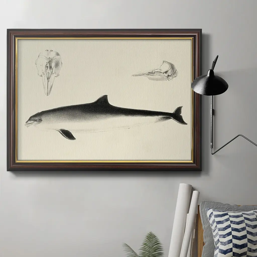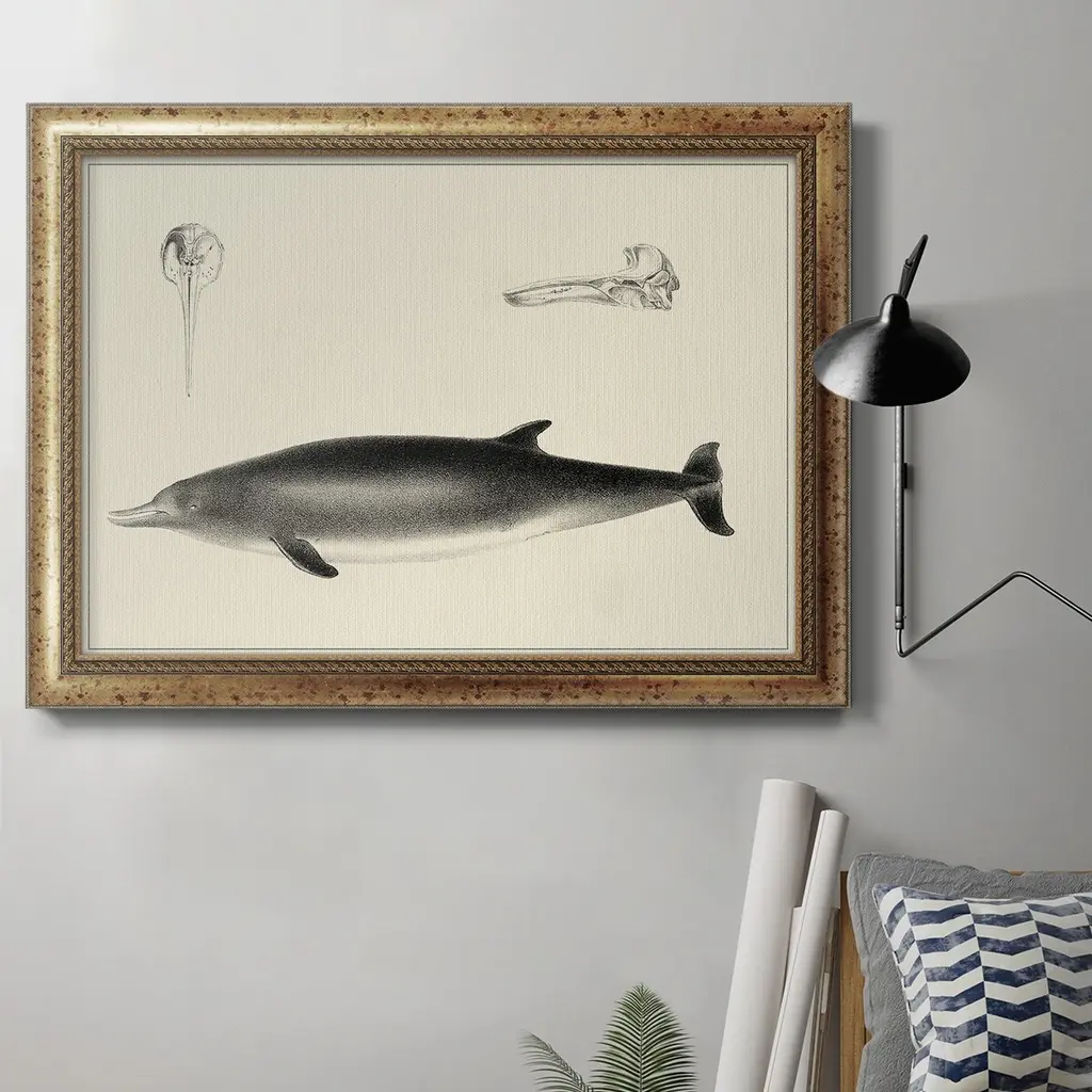 Antique Whale Study II Premium Framed Canvas- Ready to Hang A Premium Framed Canvas created to last. Framed in distressed wood and available in an array of sizes and colors Featuring a beveled a solid wood stretcher bar, each piece comes ready to hand 3 SIZES AVAILABLE 16''X20'' - Overall Size 18'X27'' - Overall Size 24''x36'' - Overall Size Each piece is made to order. Each piece comes with hanging hardware. Made in the USA Ready to Hang Giclee Paper Print Acrylic Glass Beveled Matt Board