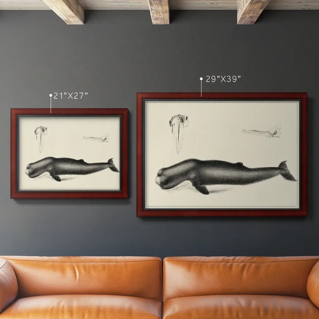 Antique Whale Study II Premium Framed Canvas- Ready to Hang A Premium Framed Canvas created to last. Framed in distressed wood and available in an array of sizes and colors Featuring a beveled a solid wood stretcher bar, each piece comes ready to hand 3 SIZES AVAILABLE 16''X20'' - Overall Size 18'X27'' - Overall Size 24''x36'' - Overall Size Each piece is made to order. Each piece comes with hanging hardware. Made in the USA Ready to Hang Giclee Paper Print Acrylic Glass Beveled Matt Board