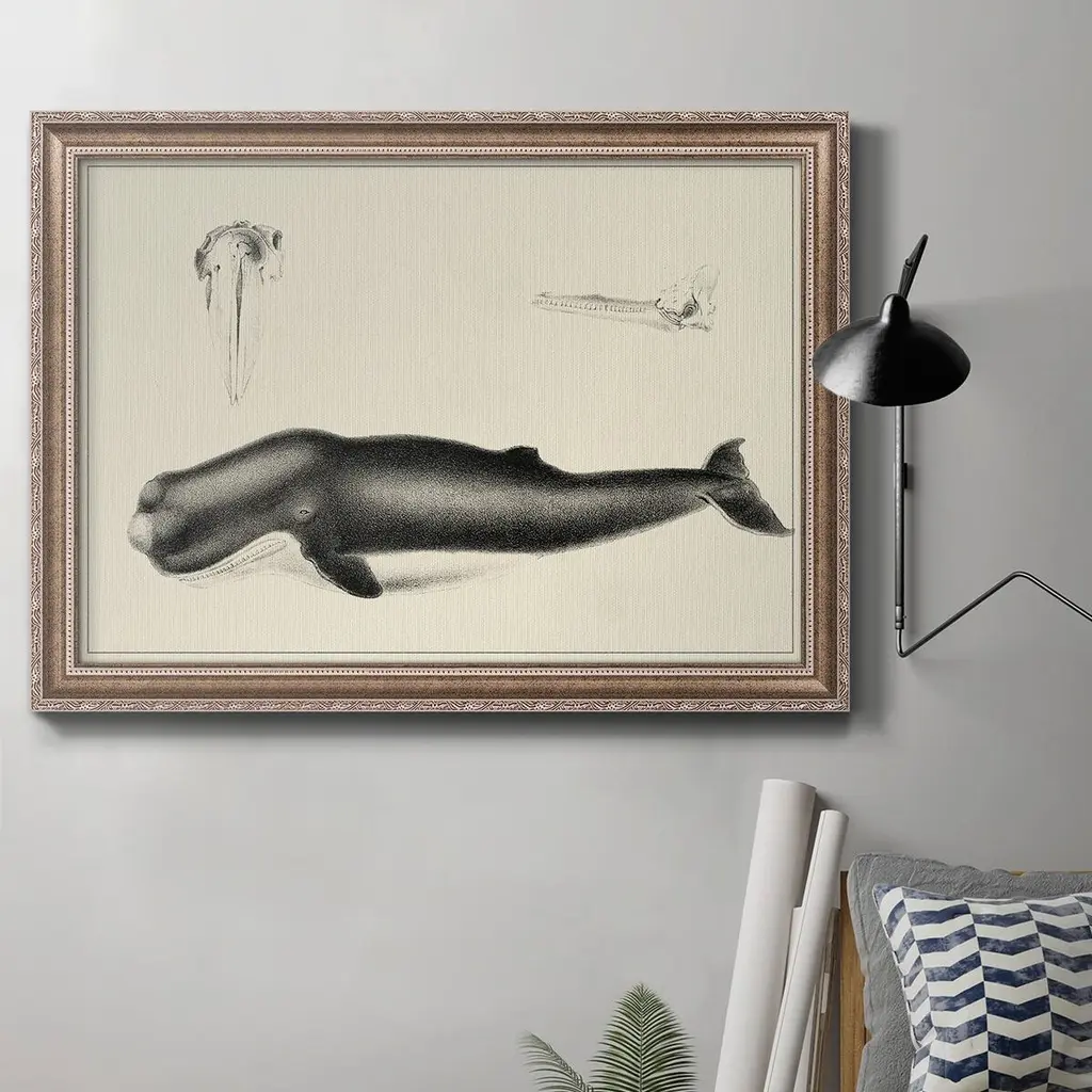 Antique Whale Study II Premium Framed Canvas- Ready to Hang A Premium Framed Canvas created to last. Framed in distressed wood and available in an array of sizes and colors Featuring a beveled a solid wood stretcher bar, each piece comes ready to hand 3 SIZES AVAILABLE 16''X20'' - Overall Size 18'X27'' - Overall Size 24''x36'' - Overall Size Each piece is made to order. Each piece comes with hanging hardware. Made in the USA Ready to Hang Giclee Paper Print Acrylic Glass Beveled Matt Board