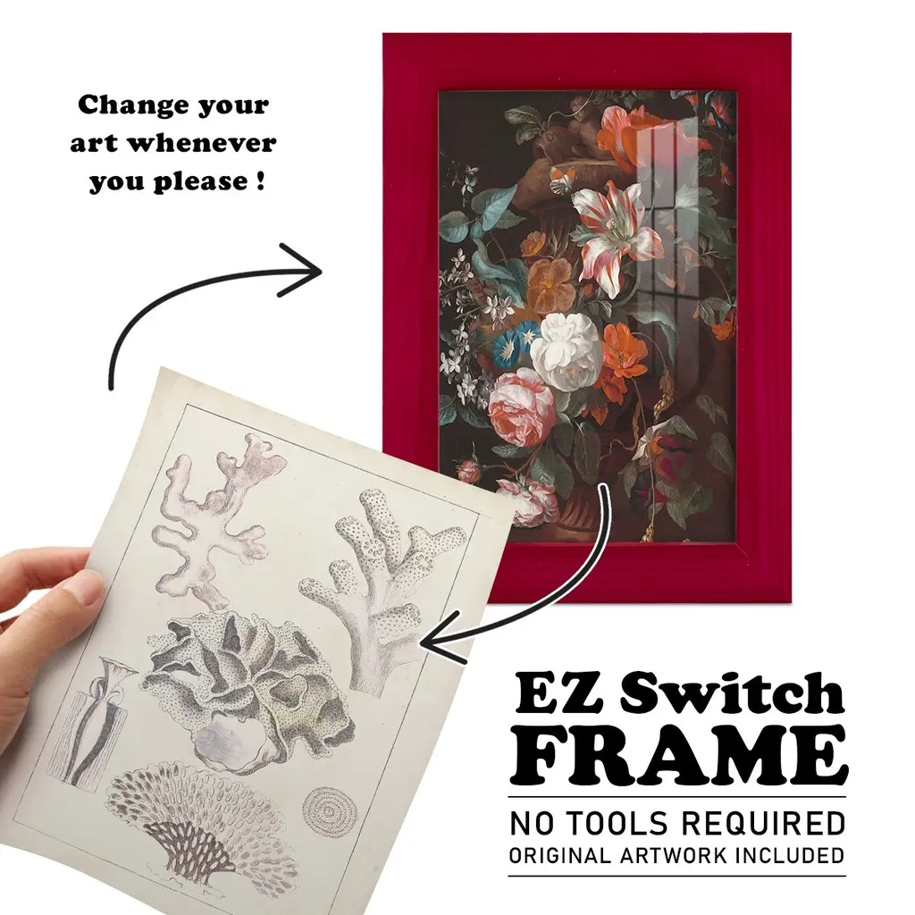 Antique White Coral IV -EZ SWITCH Framed Print w/glass-Cherry Red A delightful, framed print. Featuring a solid wood frame with real wood glass. This premium print is giclee quality. In addition, every frame features a removable back and table top stand. This allows you to change your art in the future or to just stand the art on a table for a new look. We are sure you'll enjoy our new series of EZ SWITCH Framed Art. Solid Wood Frame Real Glass Removable / Replaceable Art Built in Tabletop Stand Sizes range from 4x6 up to 12x15 - buy just one or pair them up as sets as you see fit.
