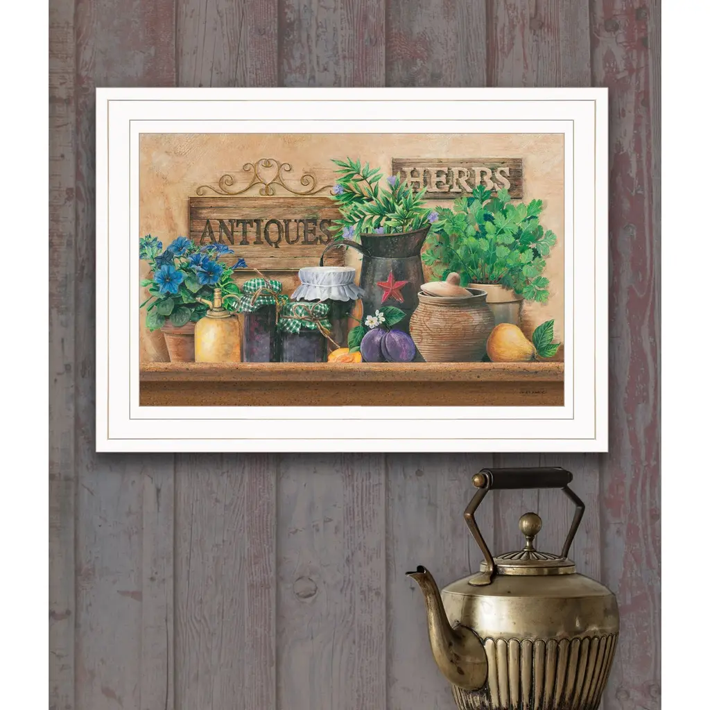 This antiques and herbs 1 white framed print wall art will add a beautiful decorative accent to your decor. This print is a visual artistic expression that allows you to decorate your space in style. Reproduced for you on paper, this hanging decorative accent will be a trendy and fashionable way to dress your walls. Hang on your wall to add some up to date fashion and decoration. Instantly liven up your space with this art that brings color and dimension to your walls. 11" H x 15" W x 1" D