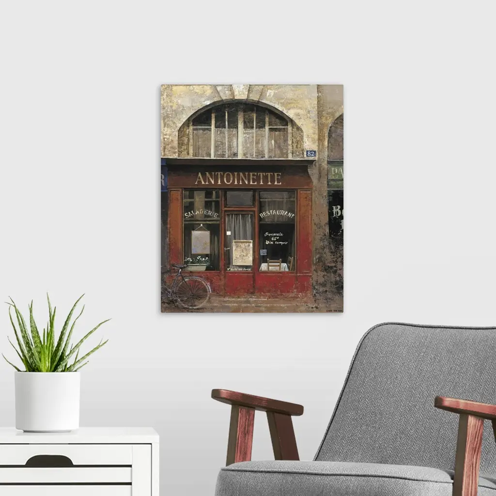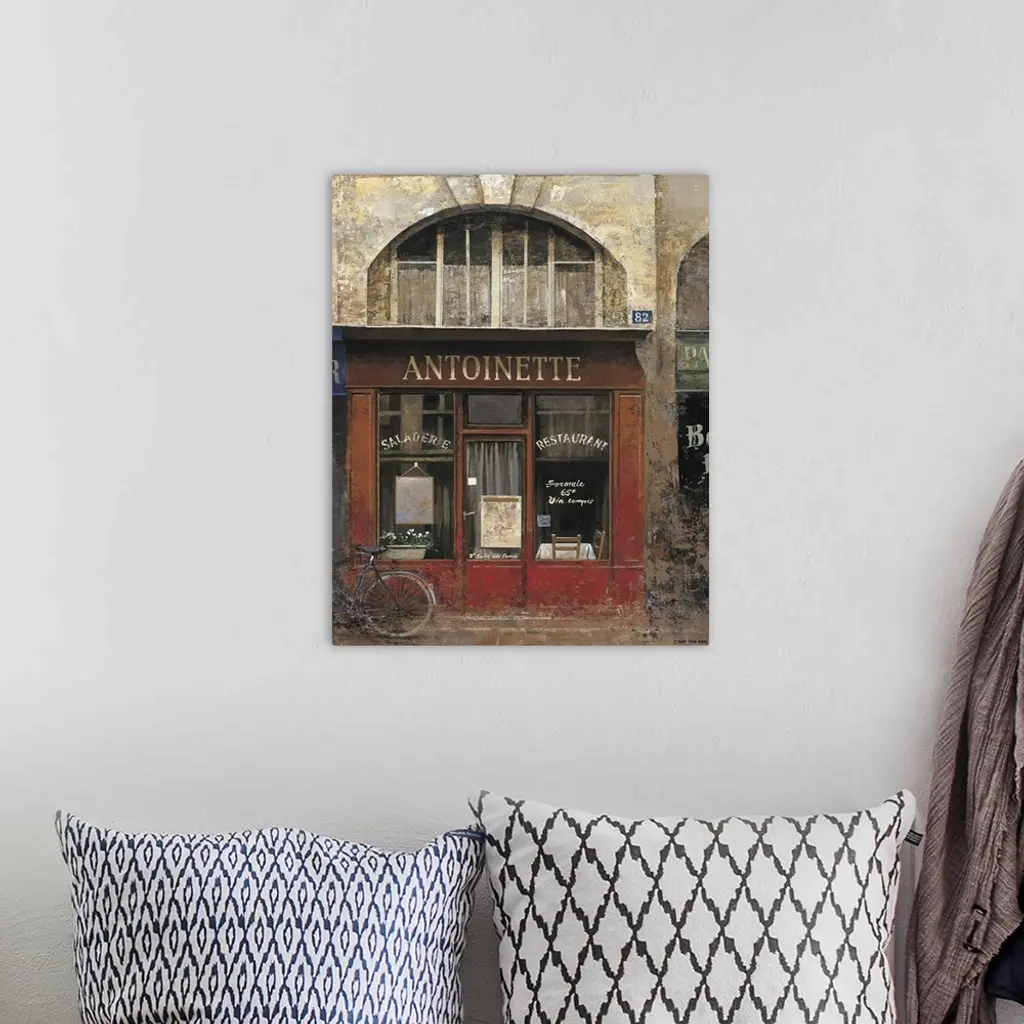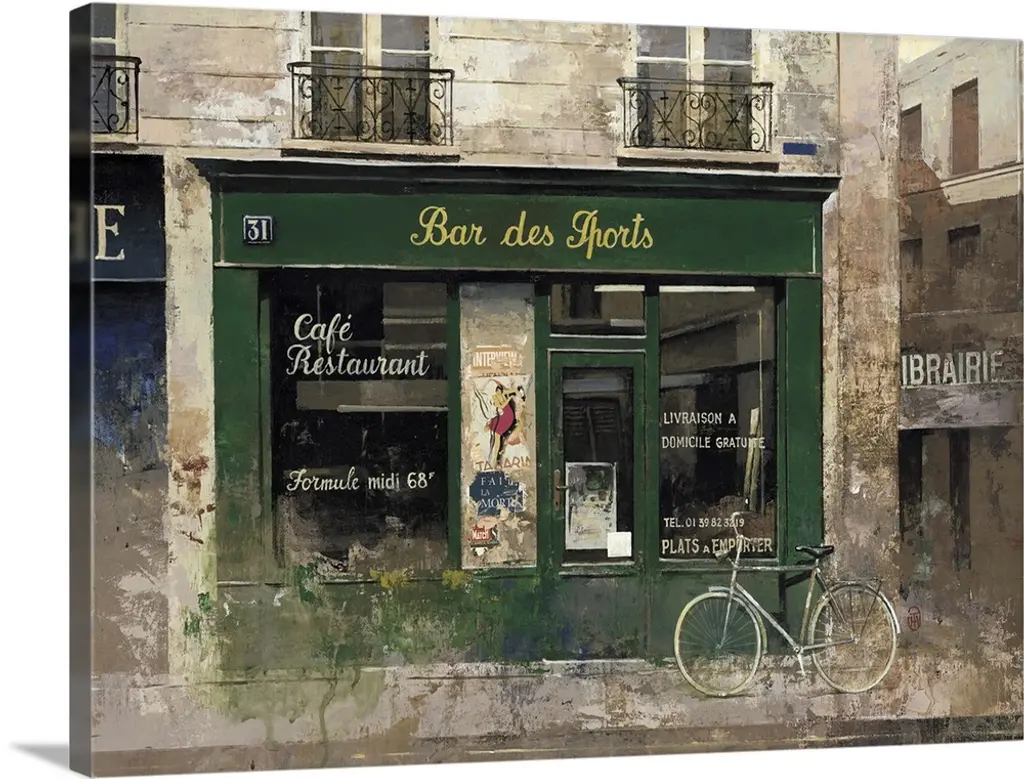Contemporary painting of a restaurant storefront downtown in a city.